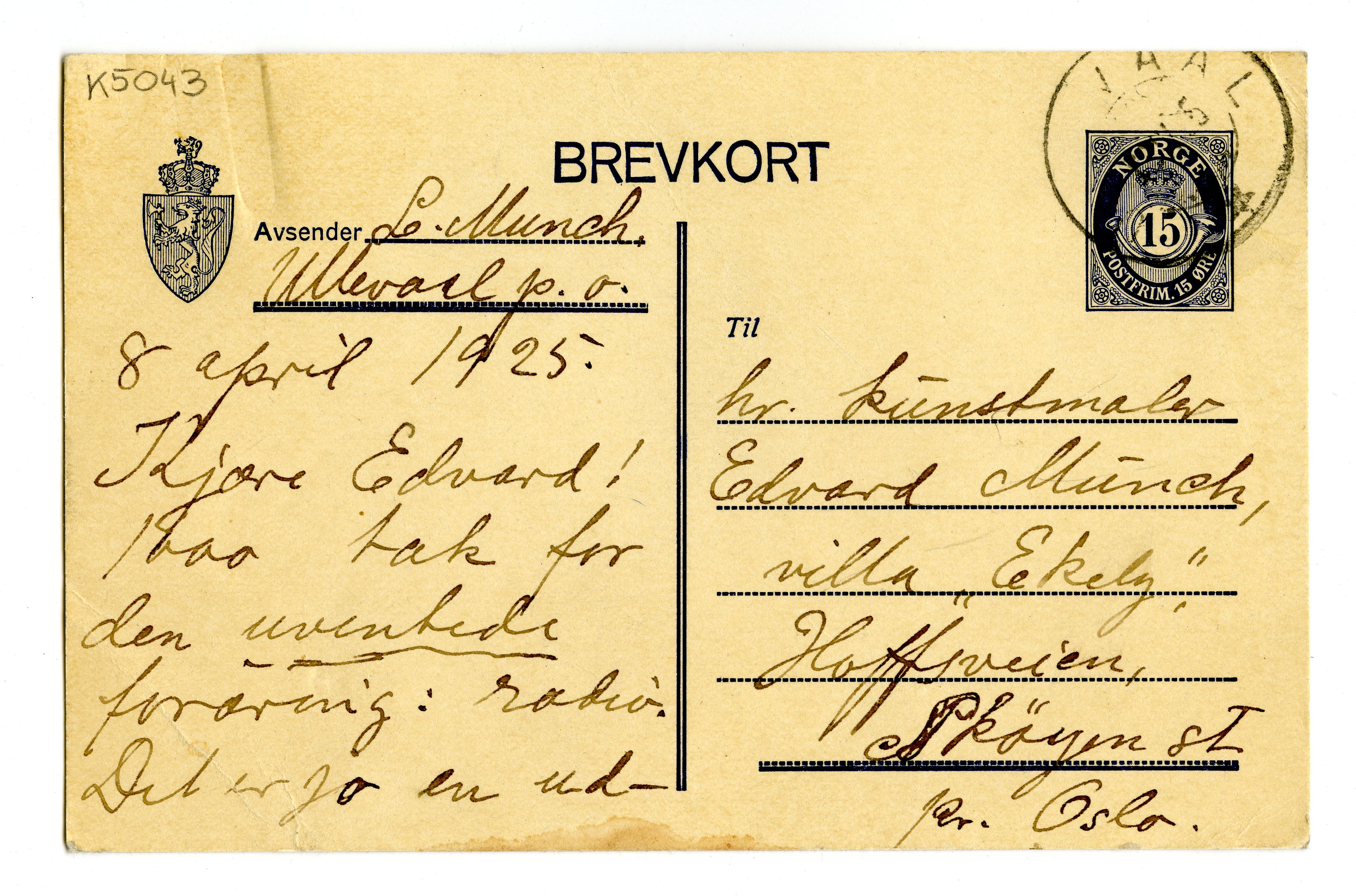 MM K 5043, Munchmuseet. Datert 08.04.1925. Brev fra Laura Munch.