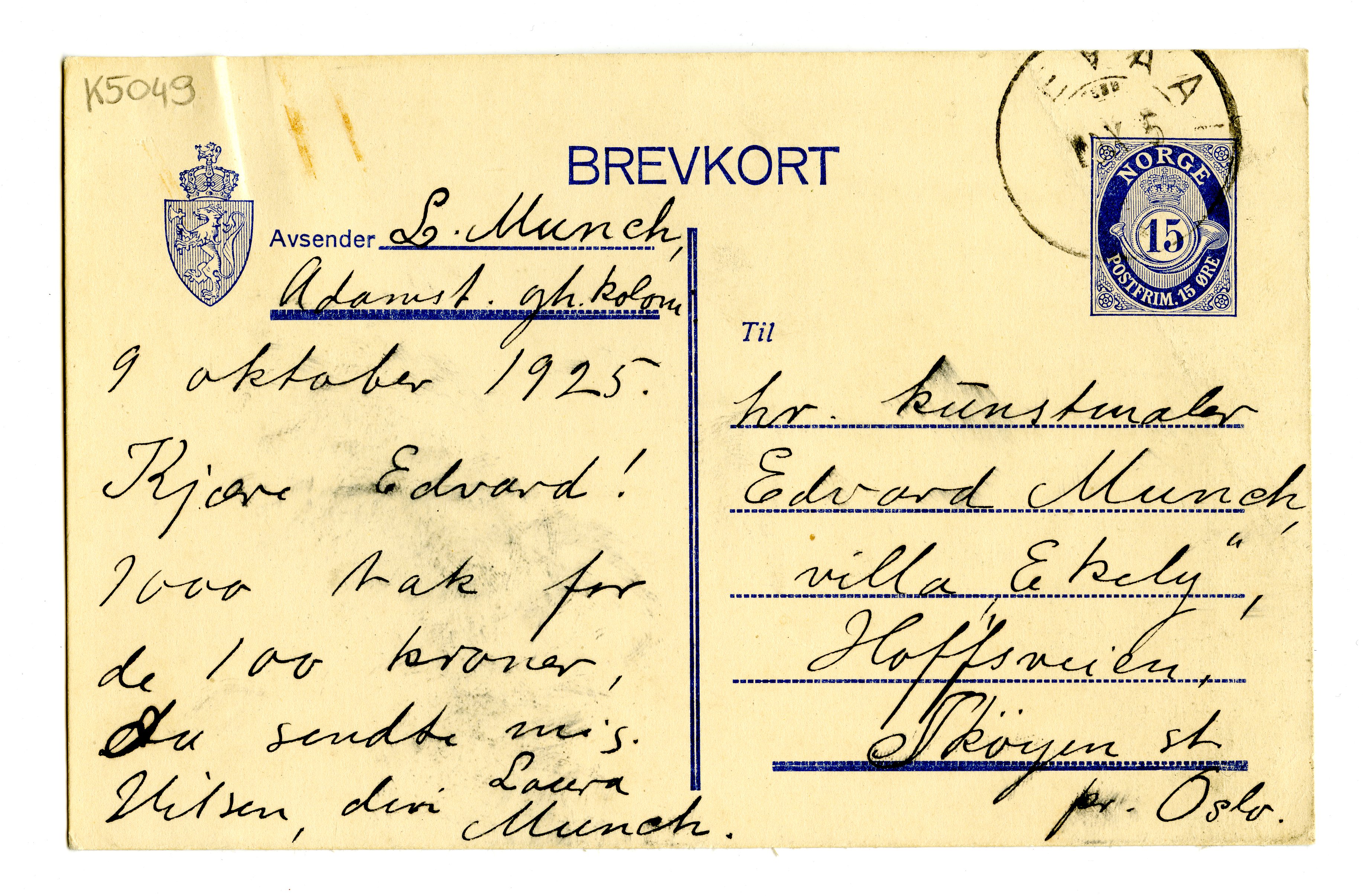 MM K 5049, Munchmuseet. Datert 09.10.1925. Brev fra Laura Munch.
