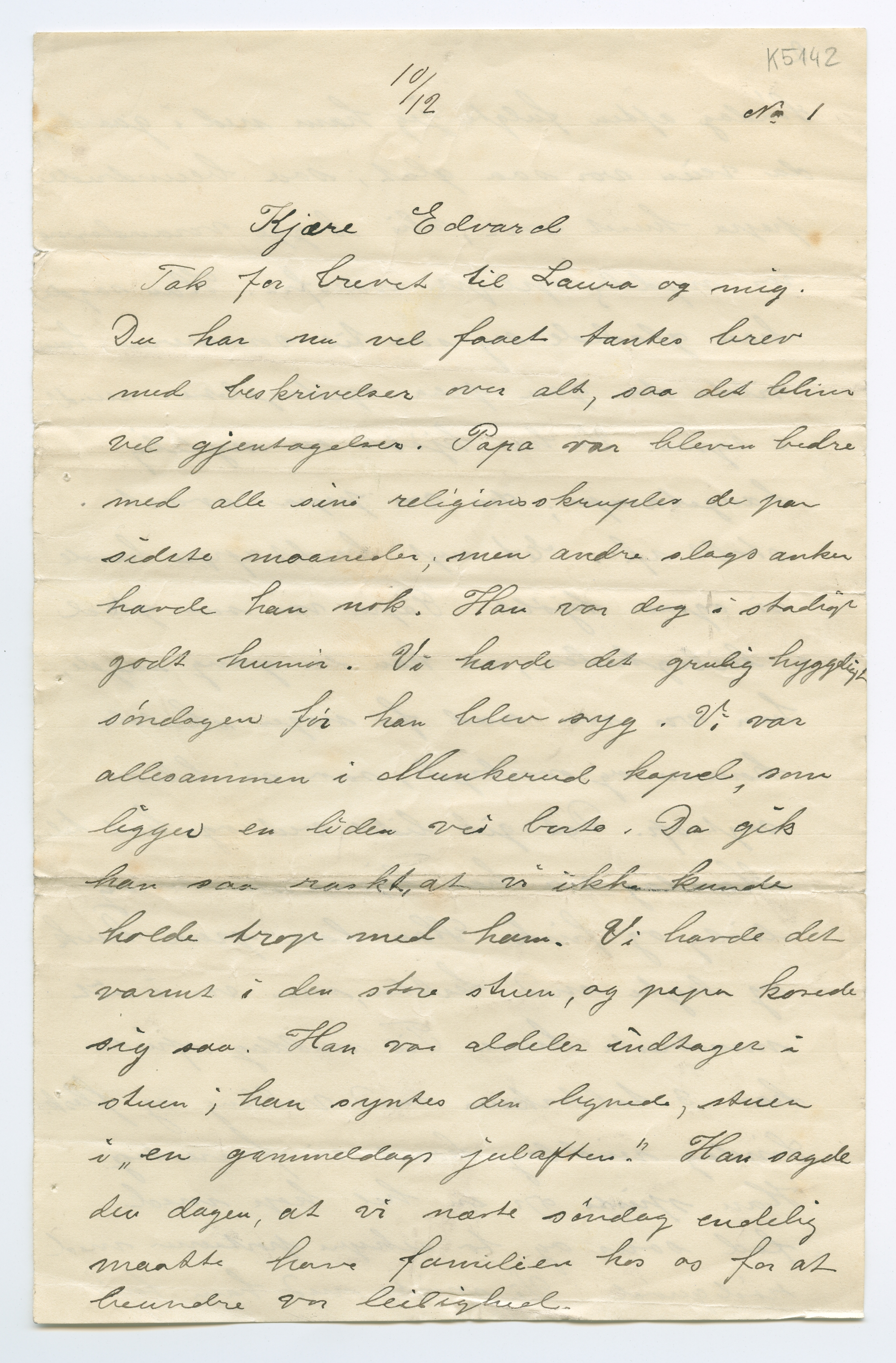 MM K 5142, Munchmuseet. Datert 10.12.1889. Brev fra Inger Munch.