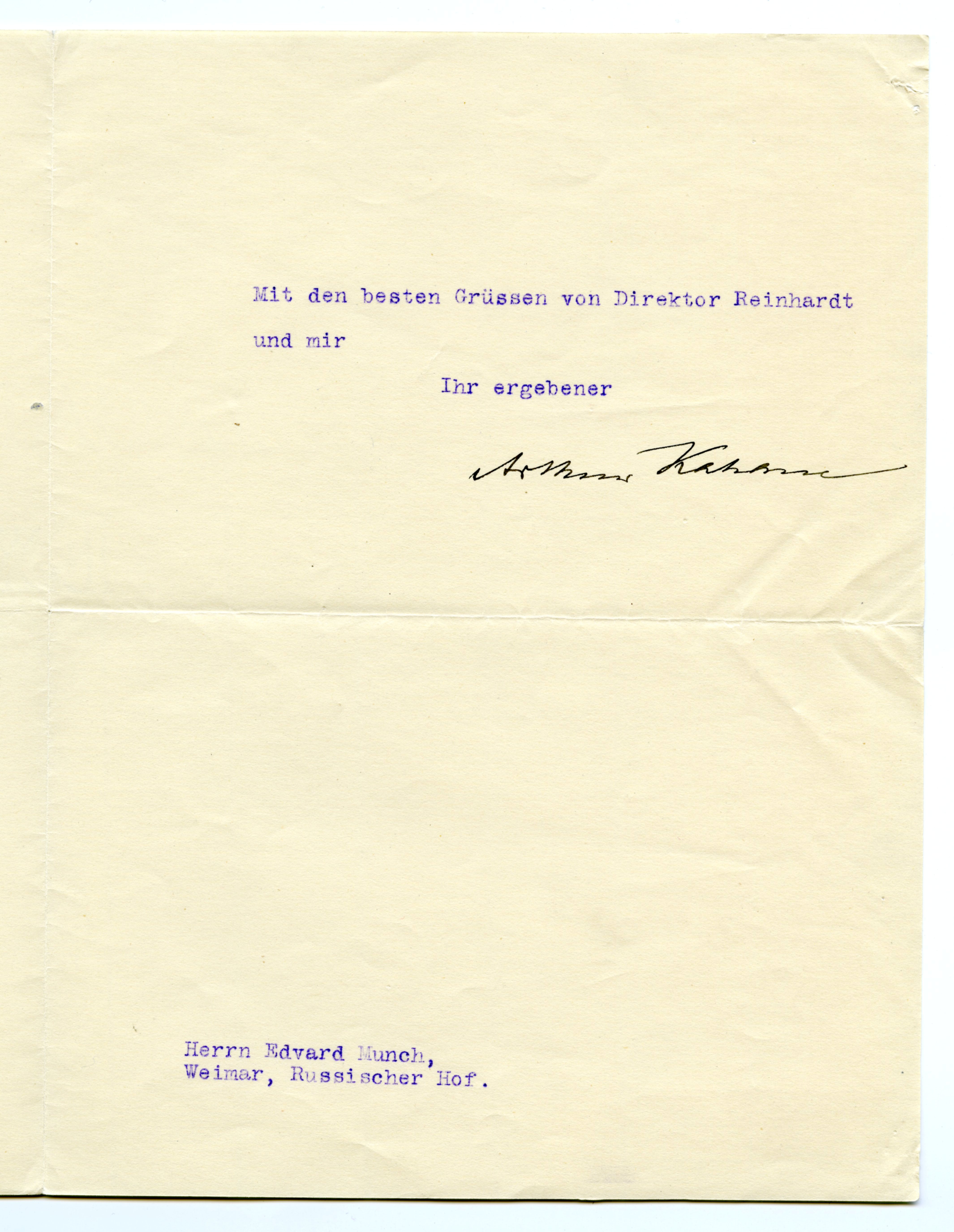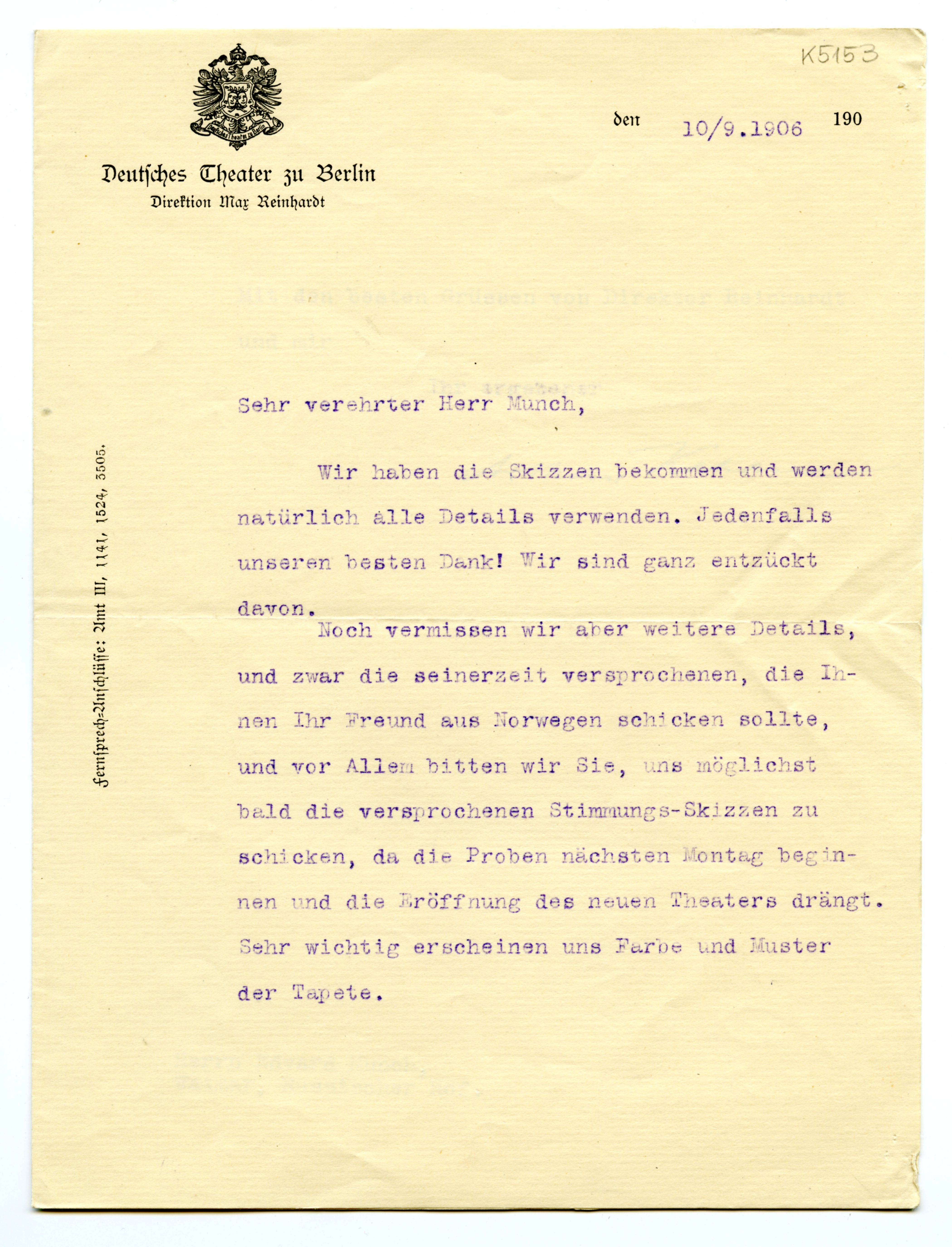 MM K 5153, Munchmuseet. Datert 10.09.1906. Brev fra Deutsches Theater zu Berlin.