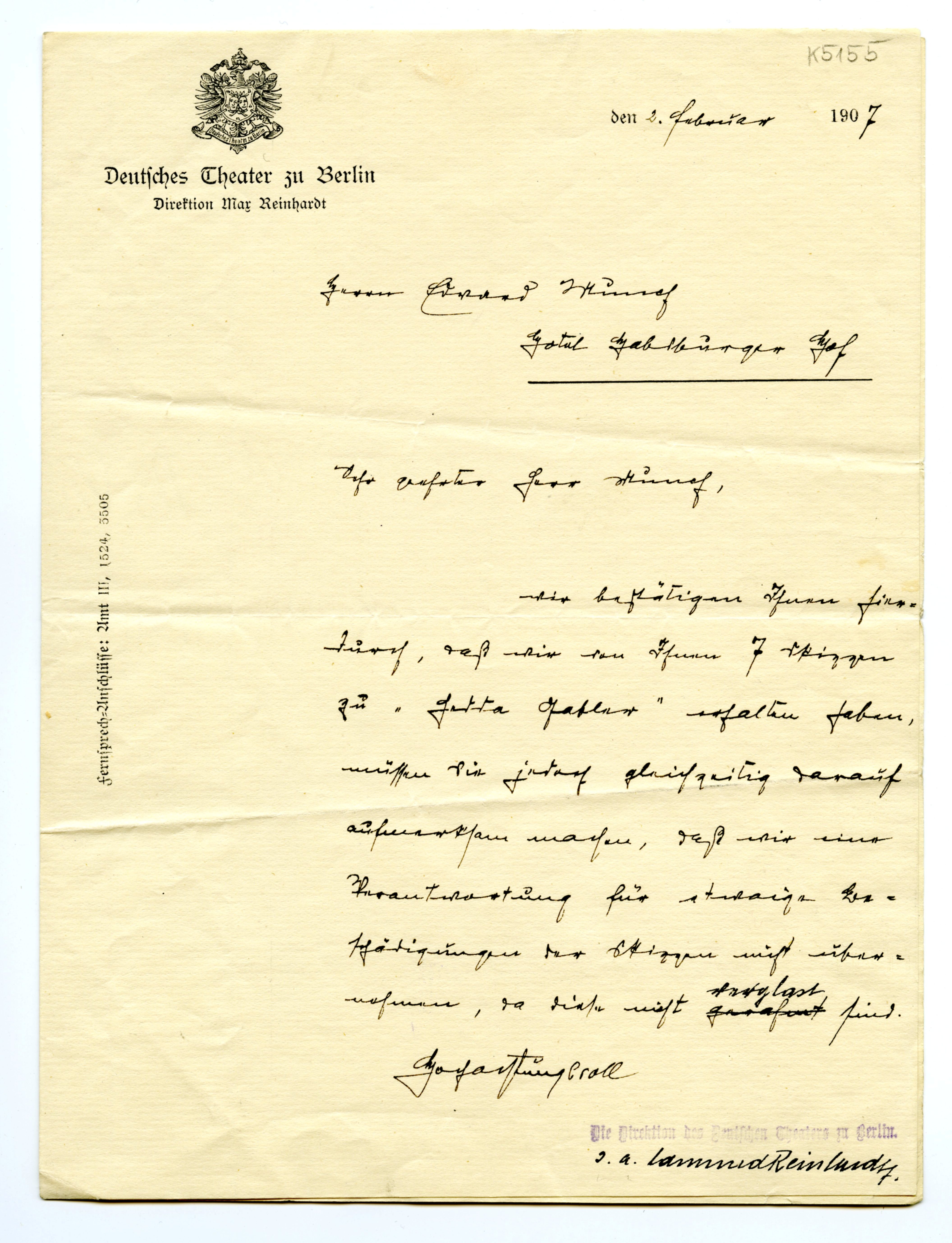 MM K 5155, Munchmuseet. Datert 02.02.1907. Brev fra Deutsches Theater zu Berlin.