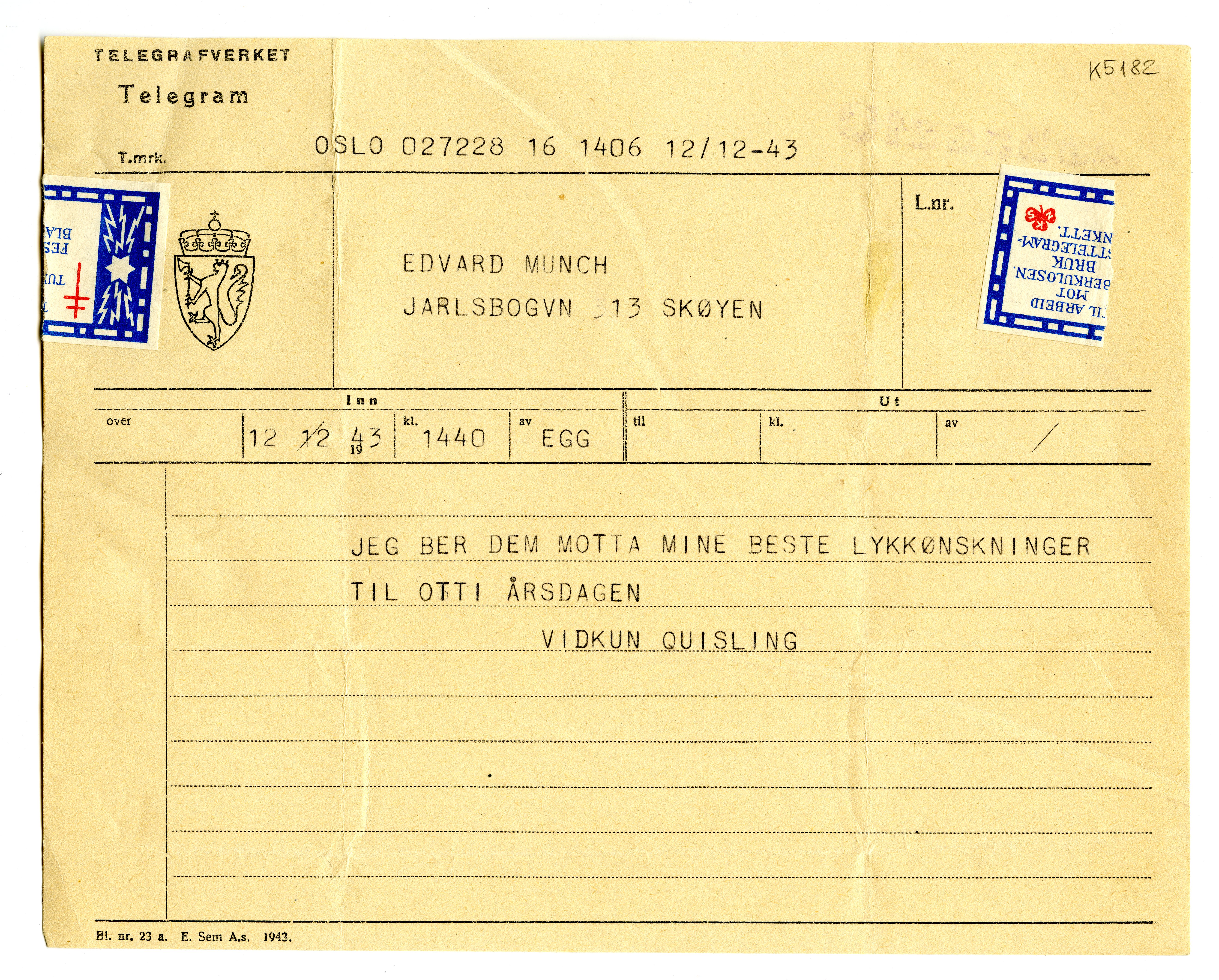 MM K 5182, Munchmuseet. Datert 12.12.1943. Brev fra Vidkun Quisling.