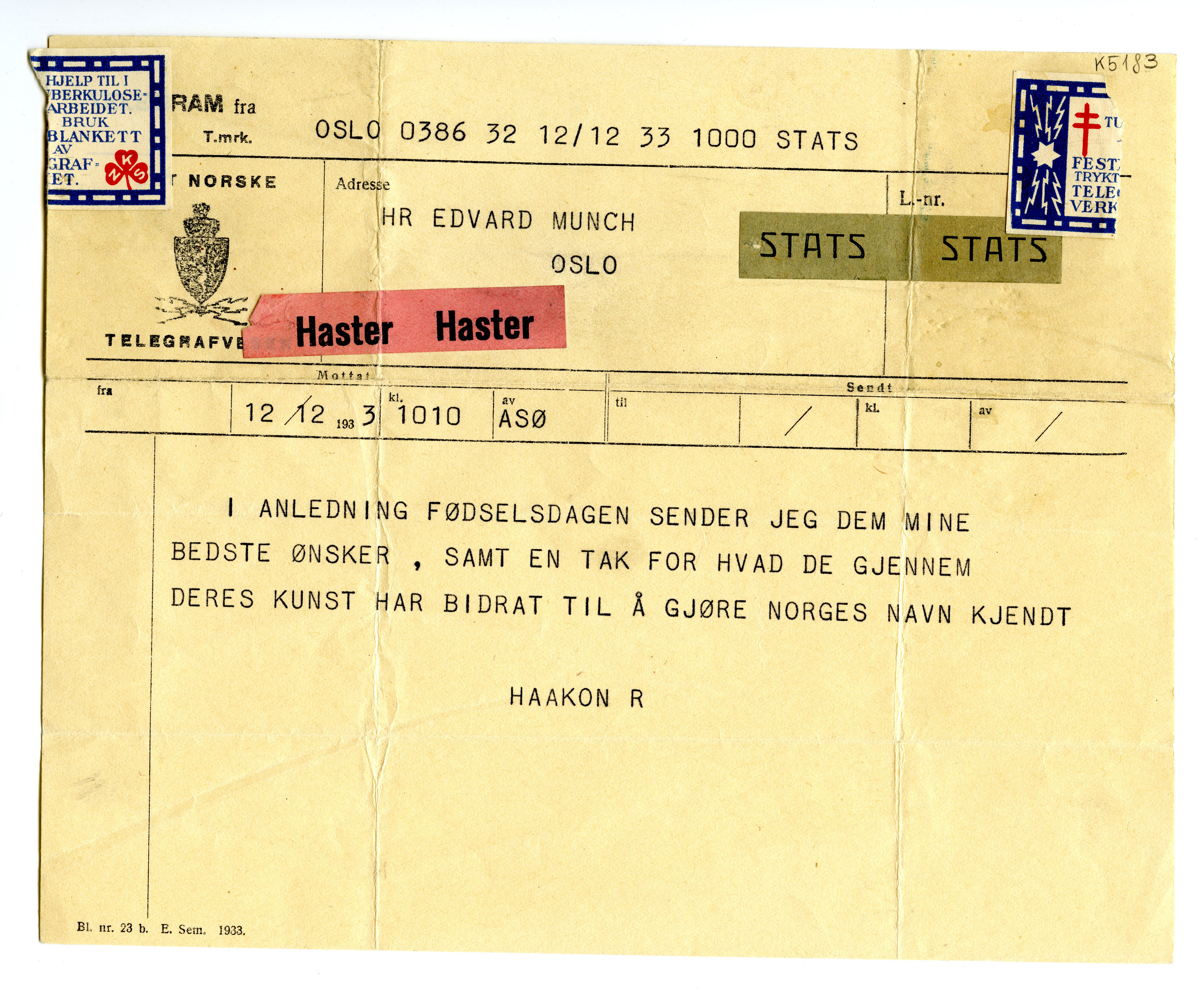 MM K 5183, Munchmuseet. Datert 12.12.1933. Brev fra Haakon VII Norges Konge.