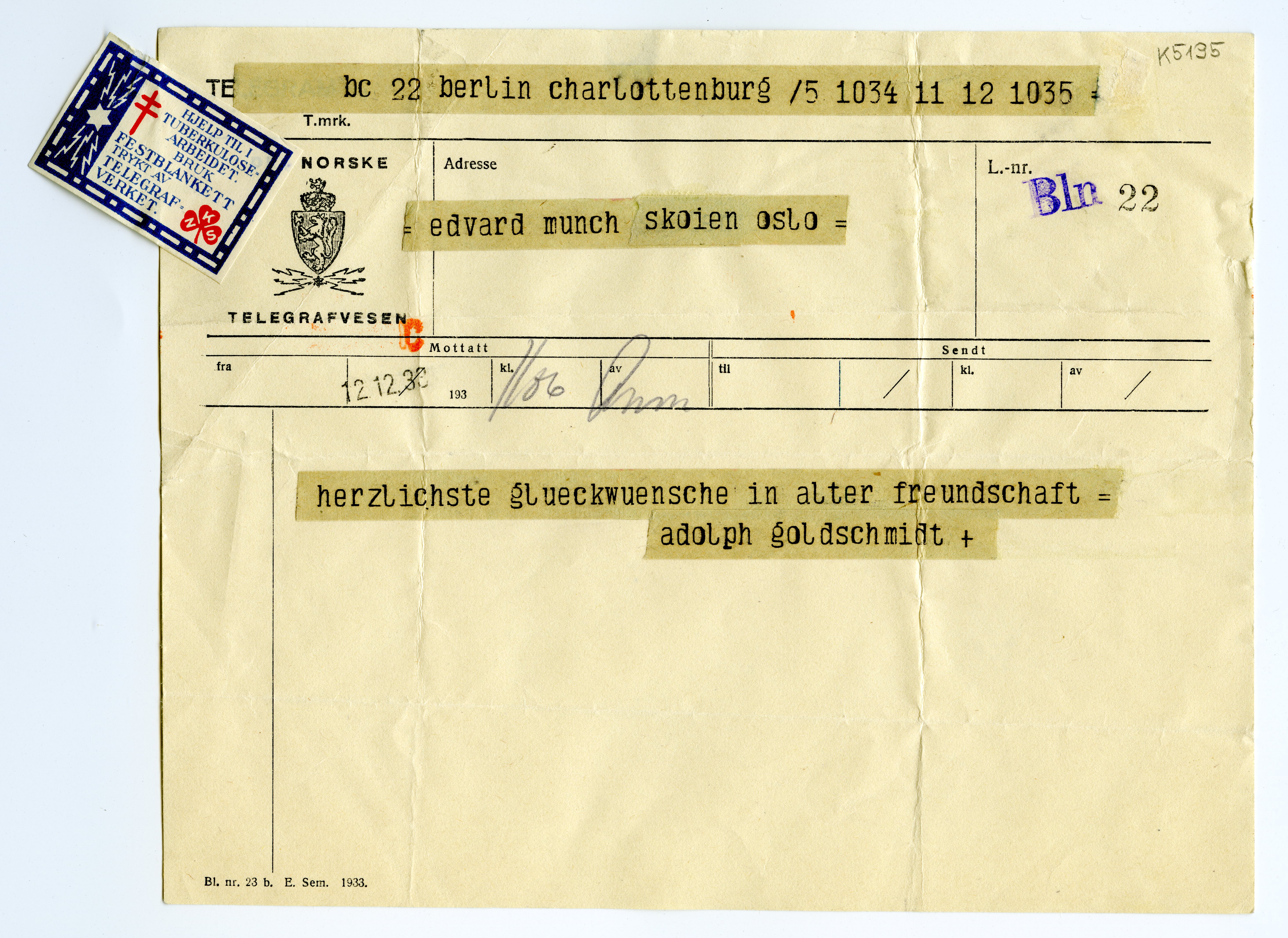 MM K 5195, Munchmuseet. Datert 12.12.1933. Brev fra Adolph Goldschmidt.