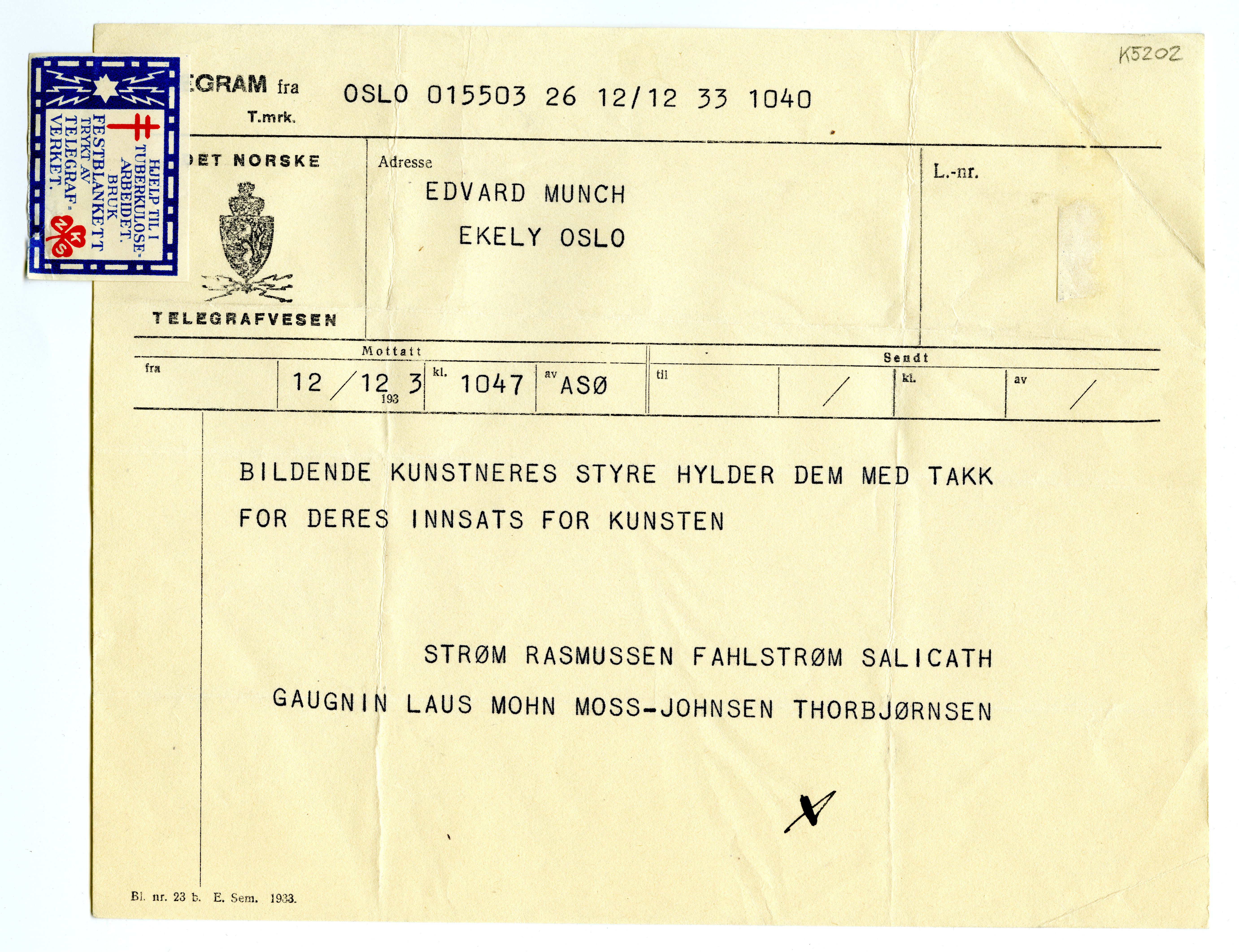 MM K 5202, Munchmuseet. Datert 12.12.1933. Brev fra Bildende Kunstneres Styre, Halfdan Strøm, Wilh. Rasmussen, Fahlstrøm, Salicath.
