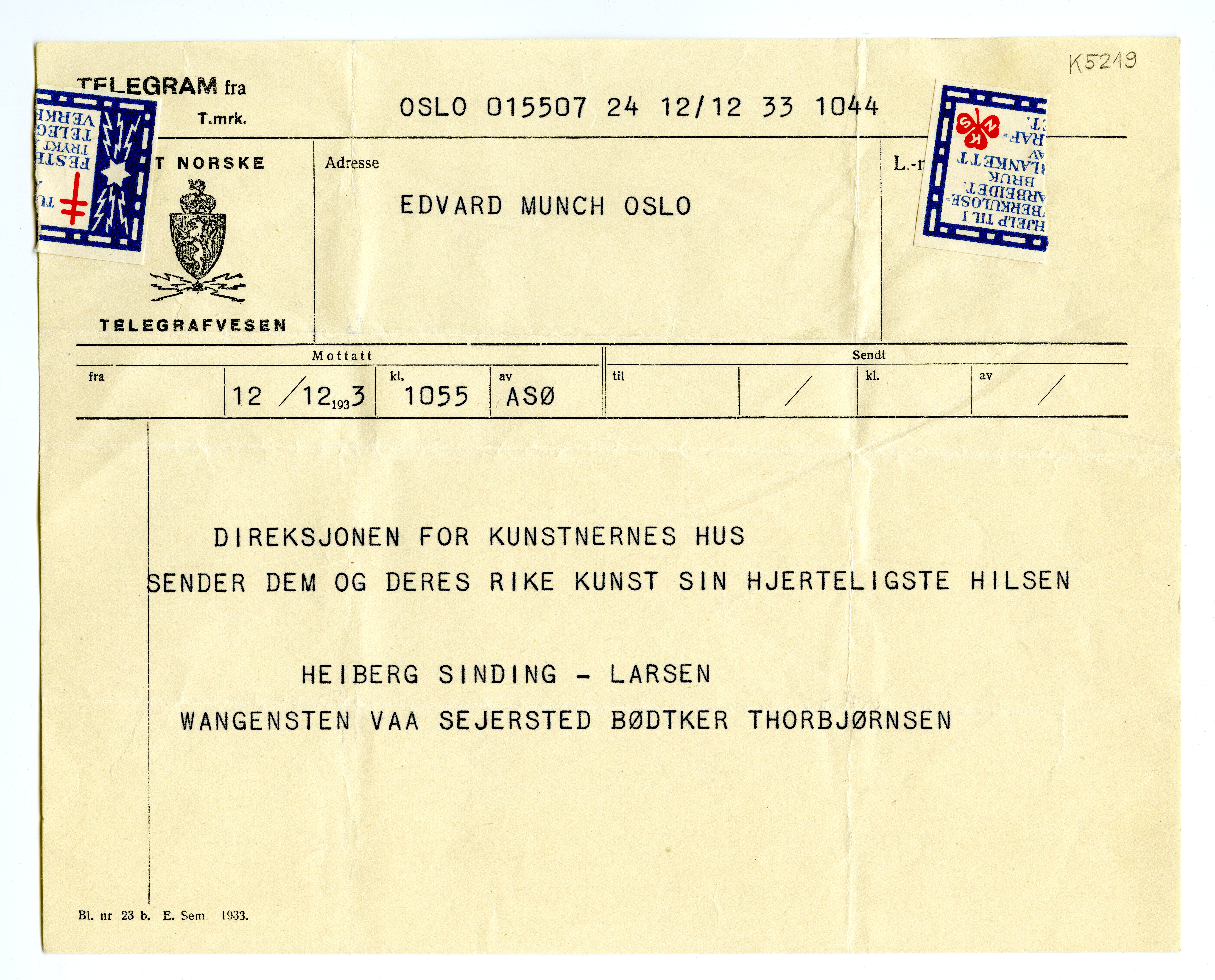 MM K 5219, Munchmuseet. Datert 12.12.1933. Brev fra Kunstnernes Hus, Sinding-Larsen, Heiberg, Sejersted Bødtker, Vaa.