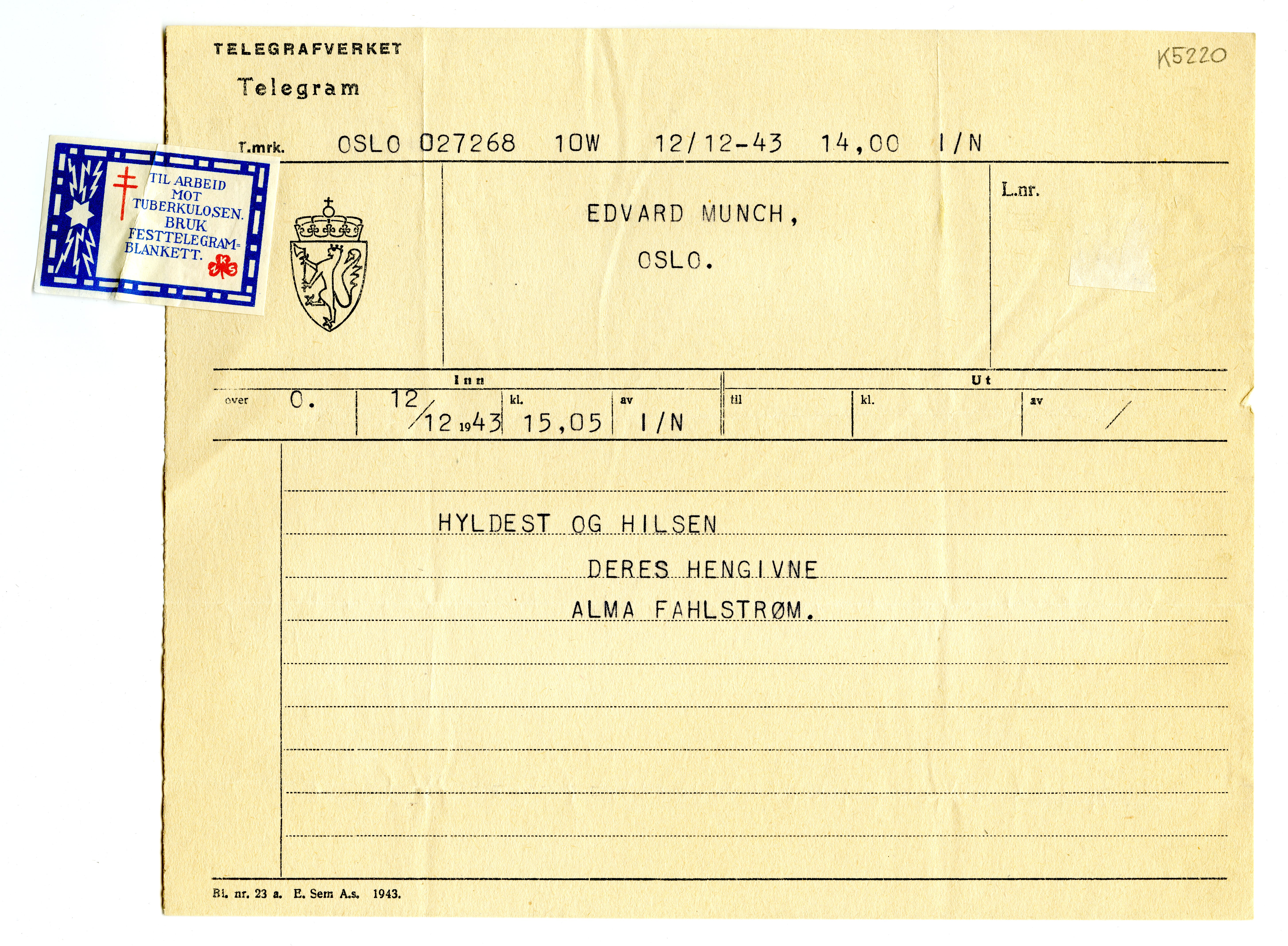 MM K 5220, Munchmuseet. Datert 12.12.1943. Brev fra Alma Fahlström.
