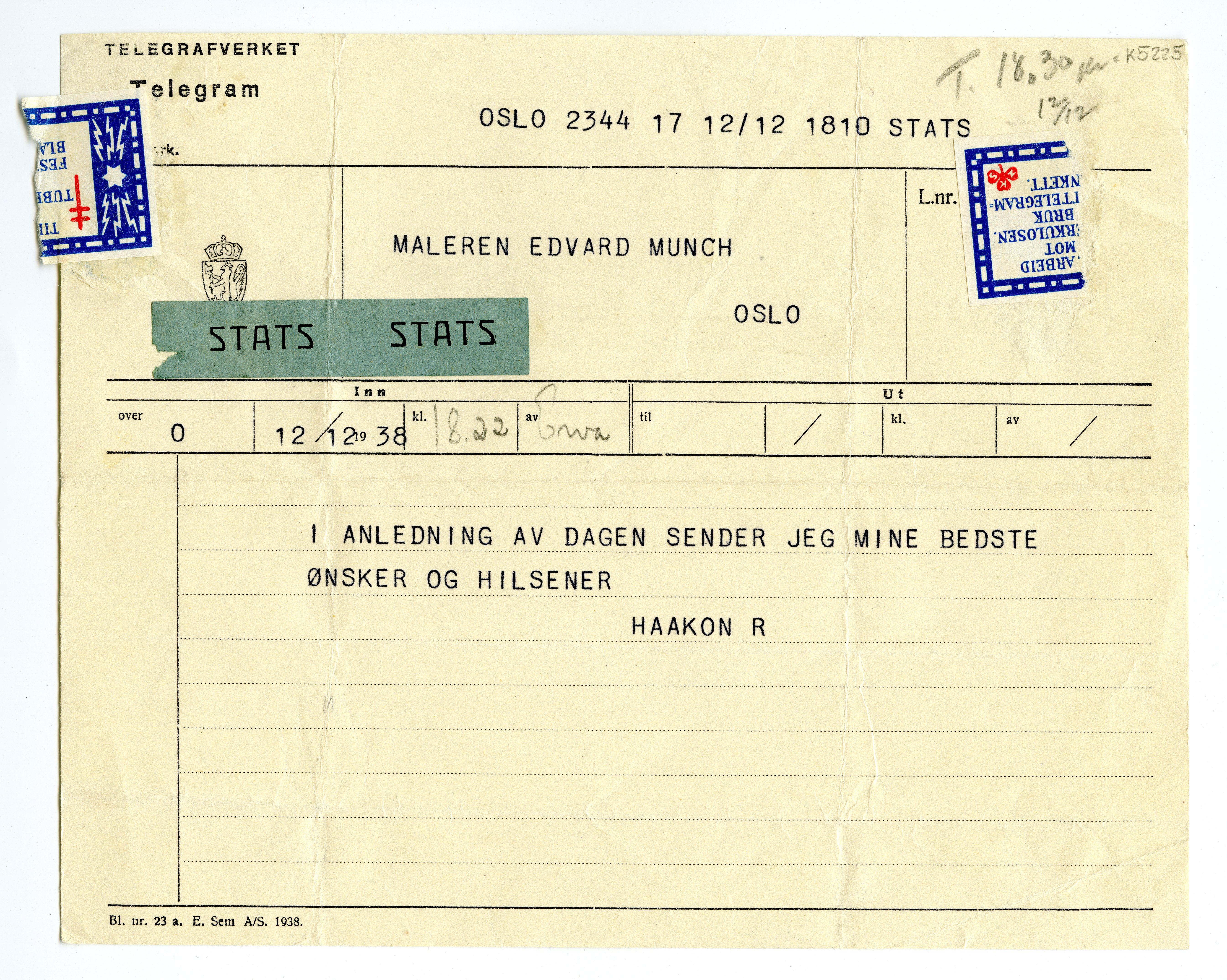 MM K 5225, Munchmuseet. Datert 12.12.1938. Brev fra Haakon VII Norges Konge.