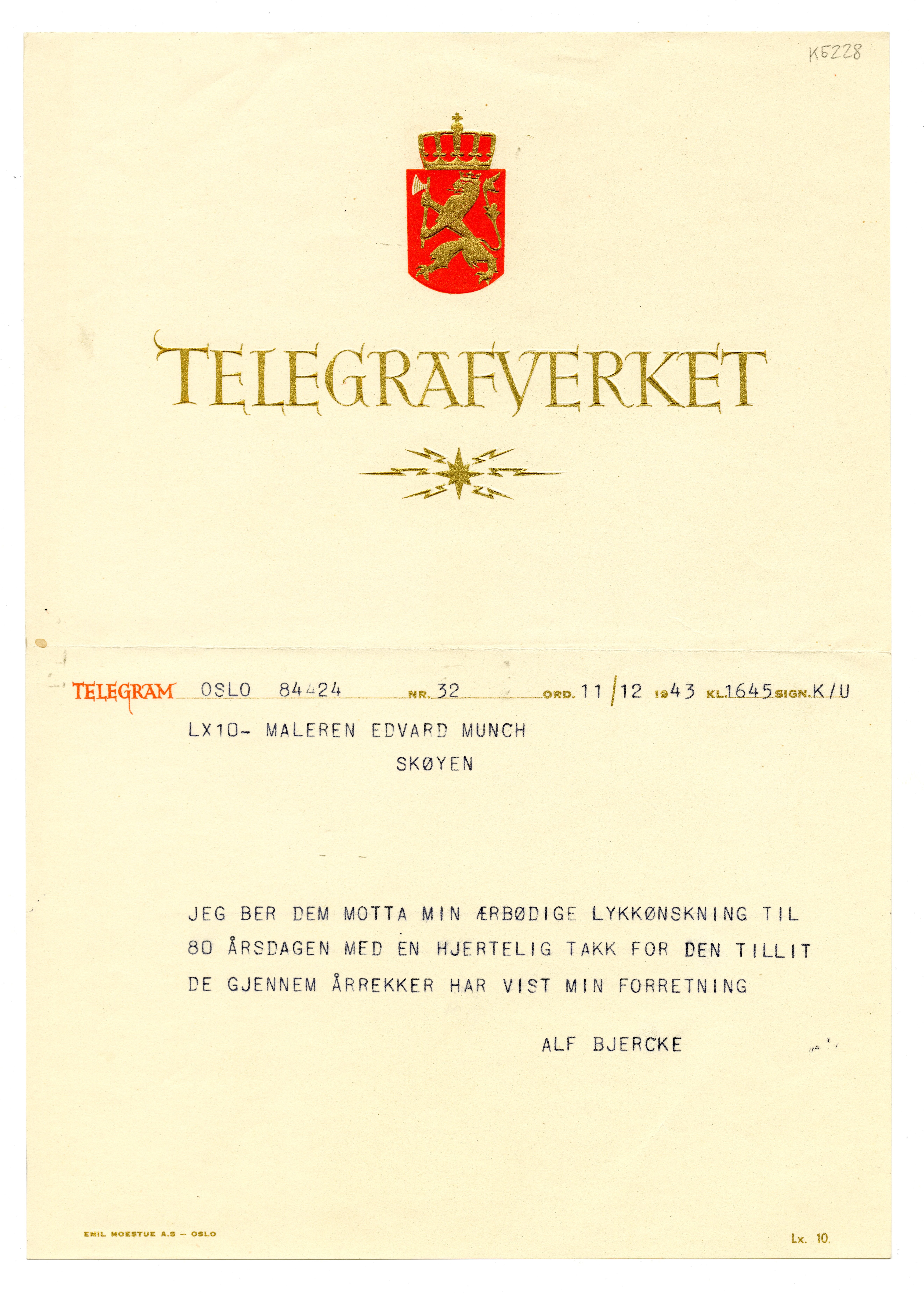 MM K 5228, Munchmuseet. Datert 11.12.1943. Brev fra Alf Bjercke Farvehandel og Fernissfabrikk.