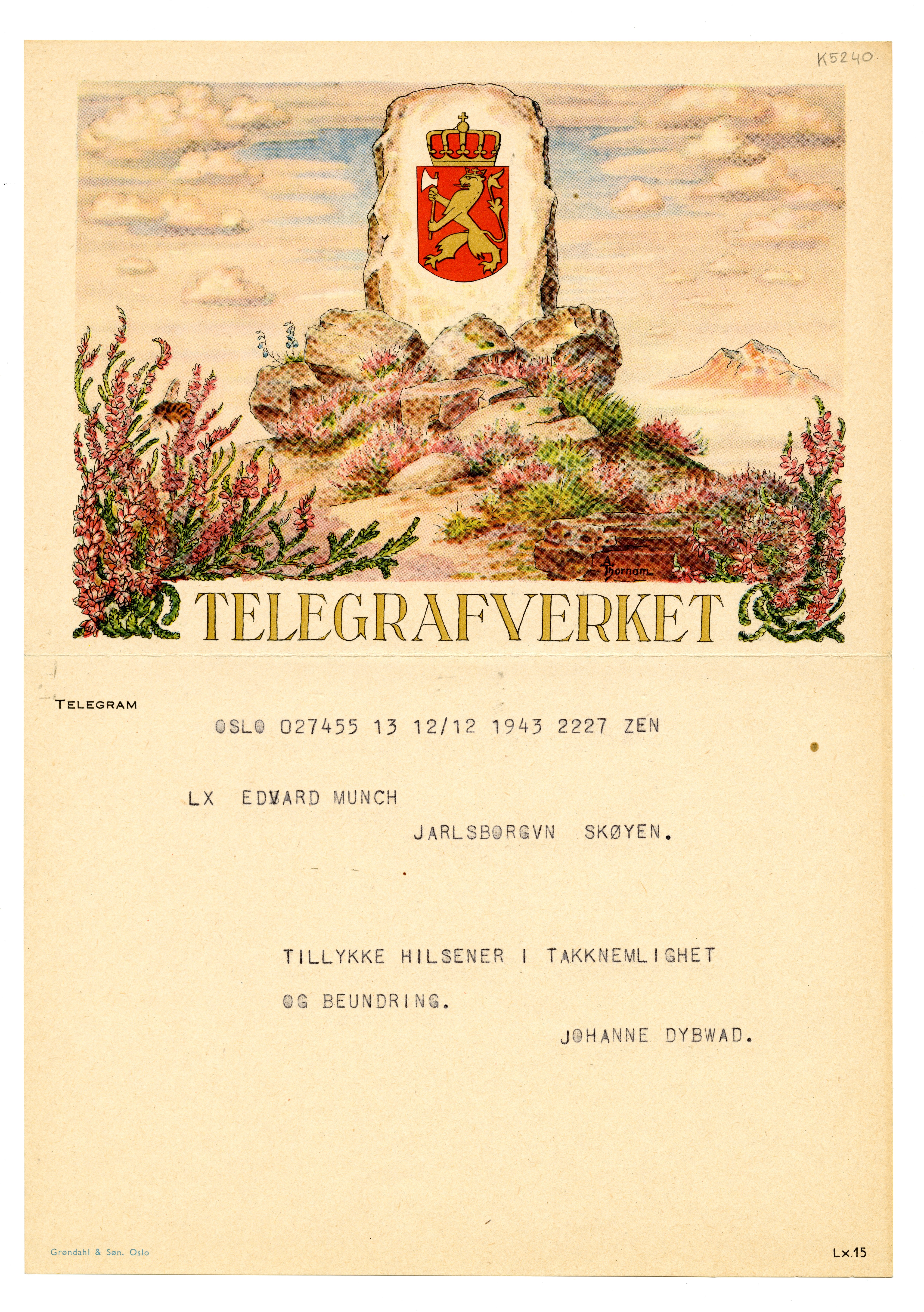 MM K 5240, Munchmuseet. Datert 12.12.1943. Brev fra Johanne Dybwad.