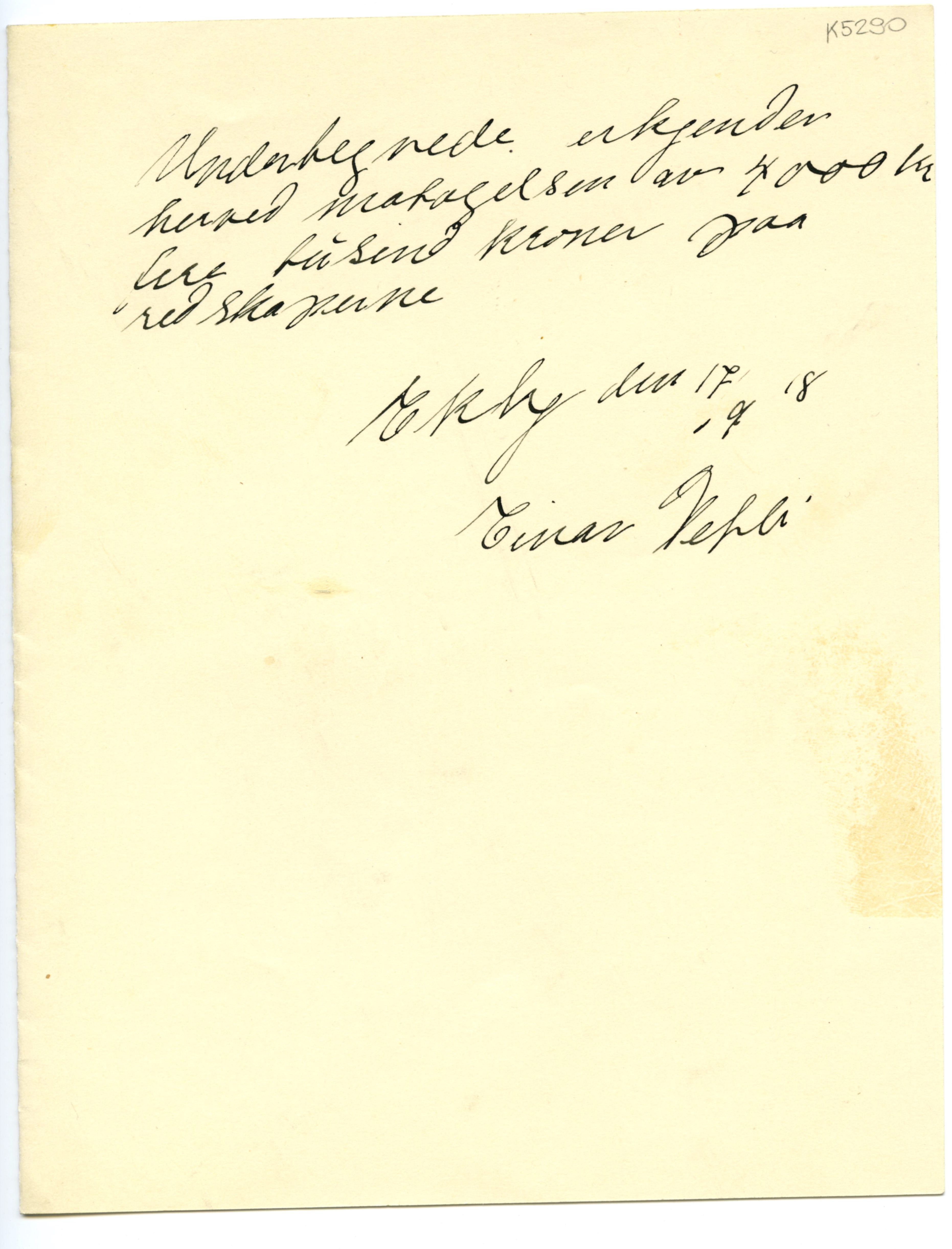 MM K 5290, Munchmuseet. Datert 17.09.1918. Brev fra Einar Dehli.