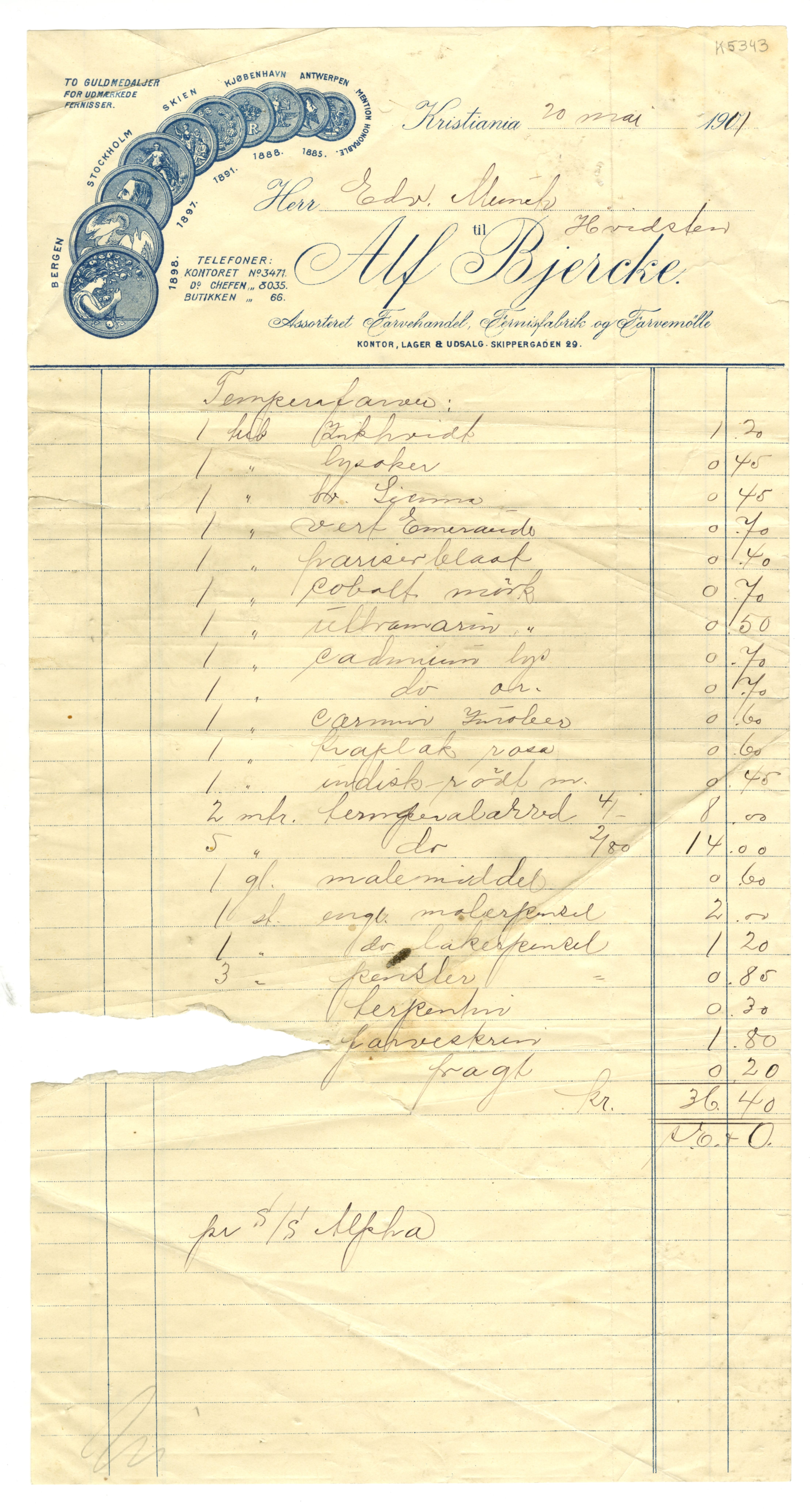 MM K 5343, Munchmuseet. Datert 20.05.1901. Brev fra Alf Bjercke Farvehandel og Fernissfabrikk.