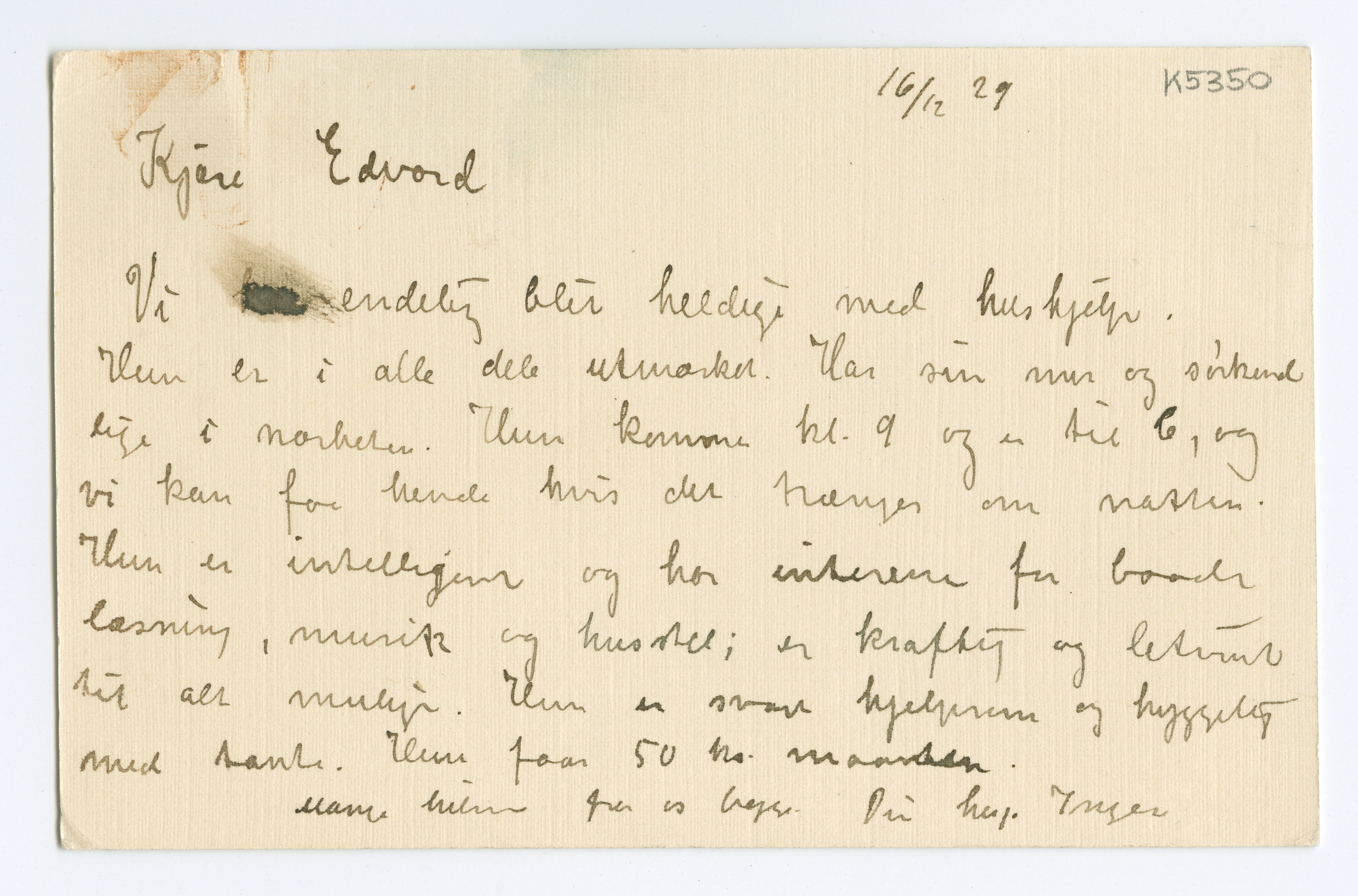MM K 5350, Munchmuseet. Datert 16.12.1929. Brev fra Inger Munch.