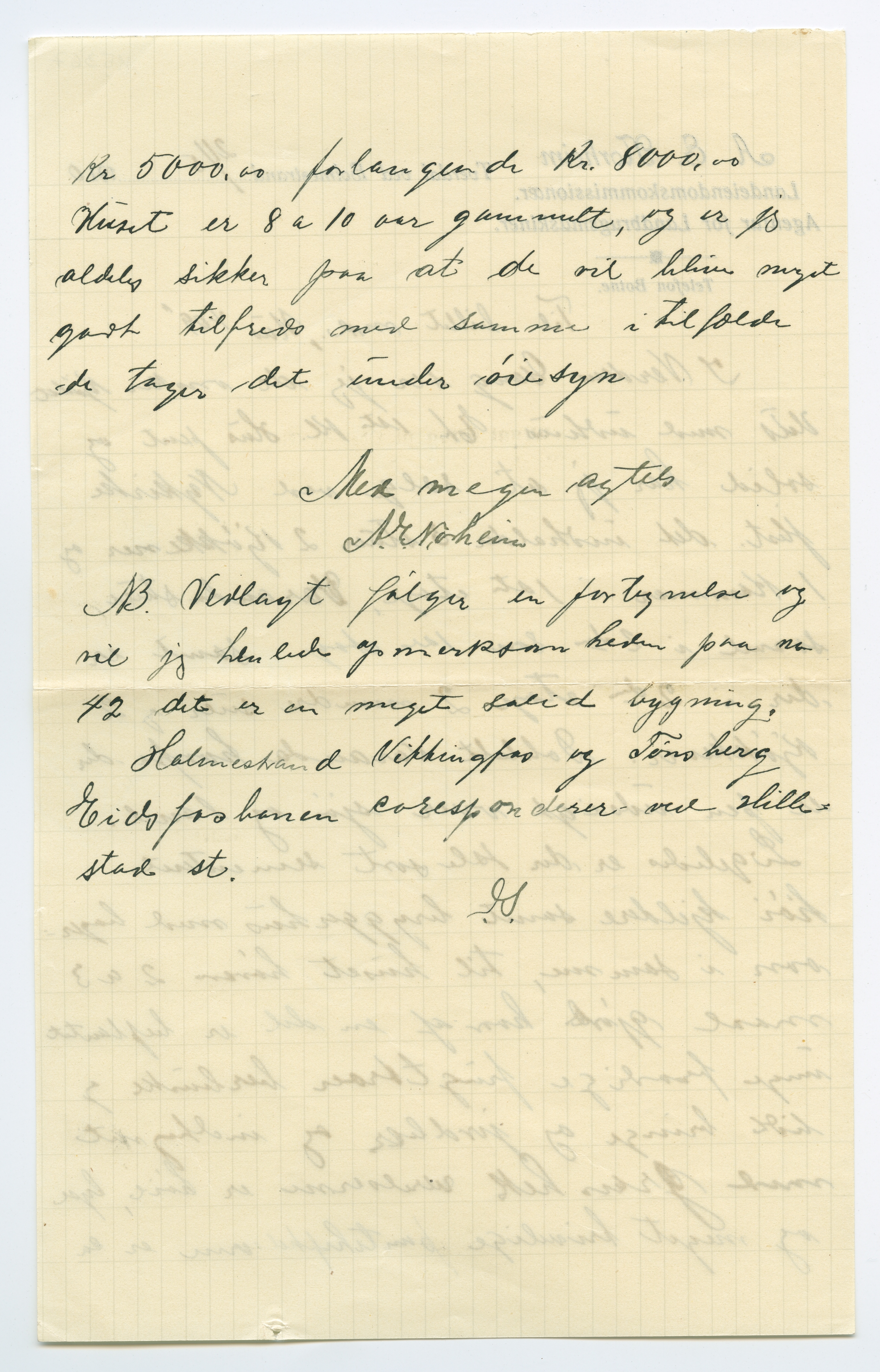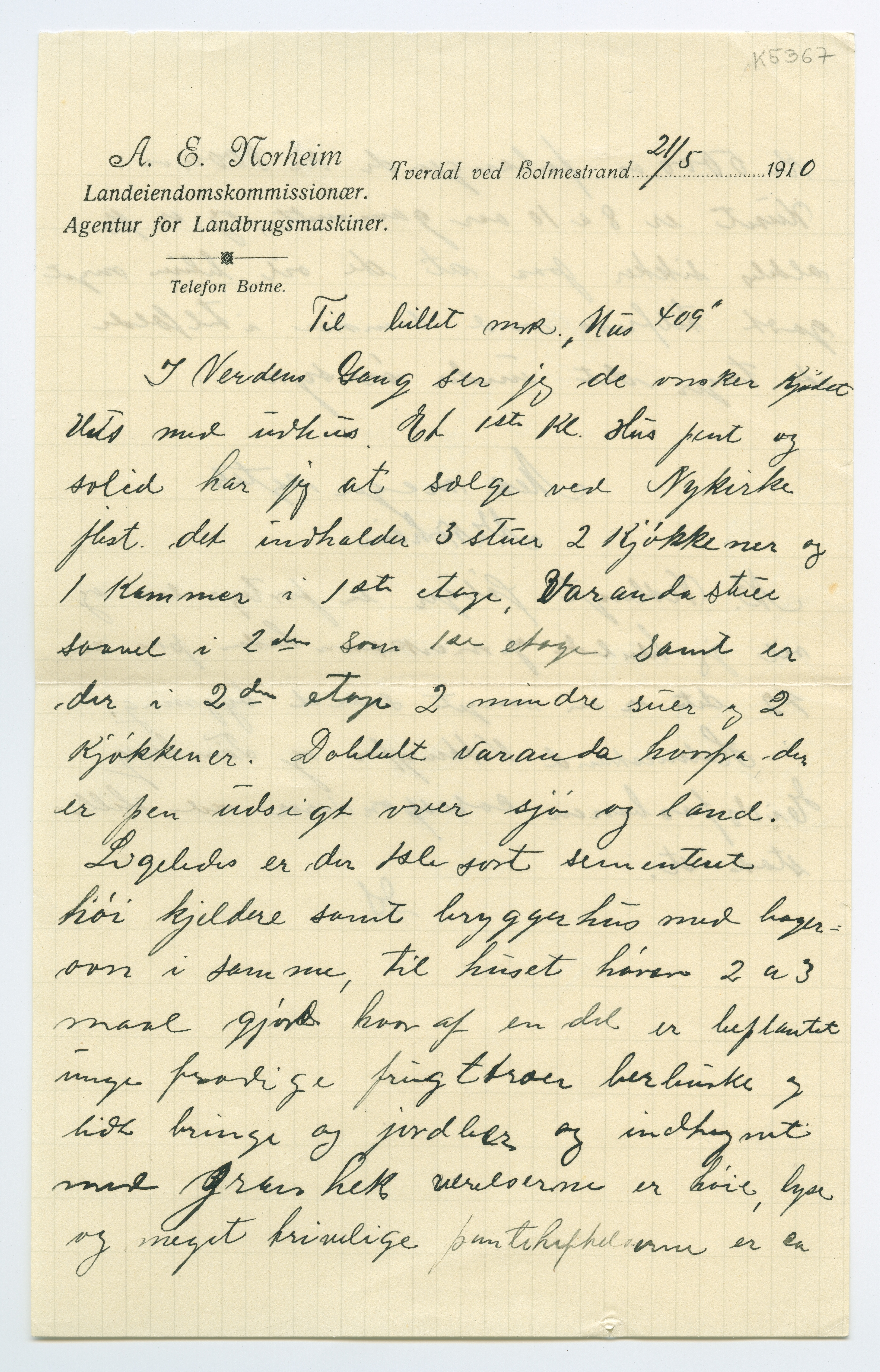 MM K 5367, Munchmuseet. Datert 21.05.1910. Brev fra A. E. Norheim, A. E. Norheim Landeiendomskomissionær.