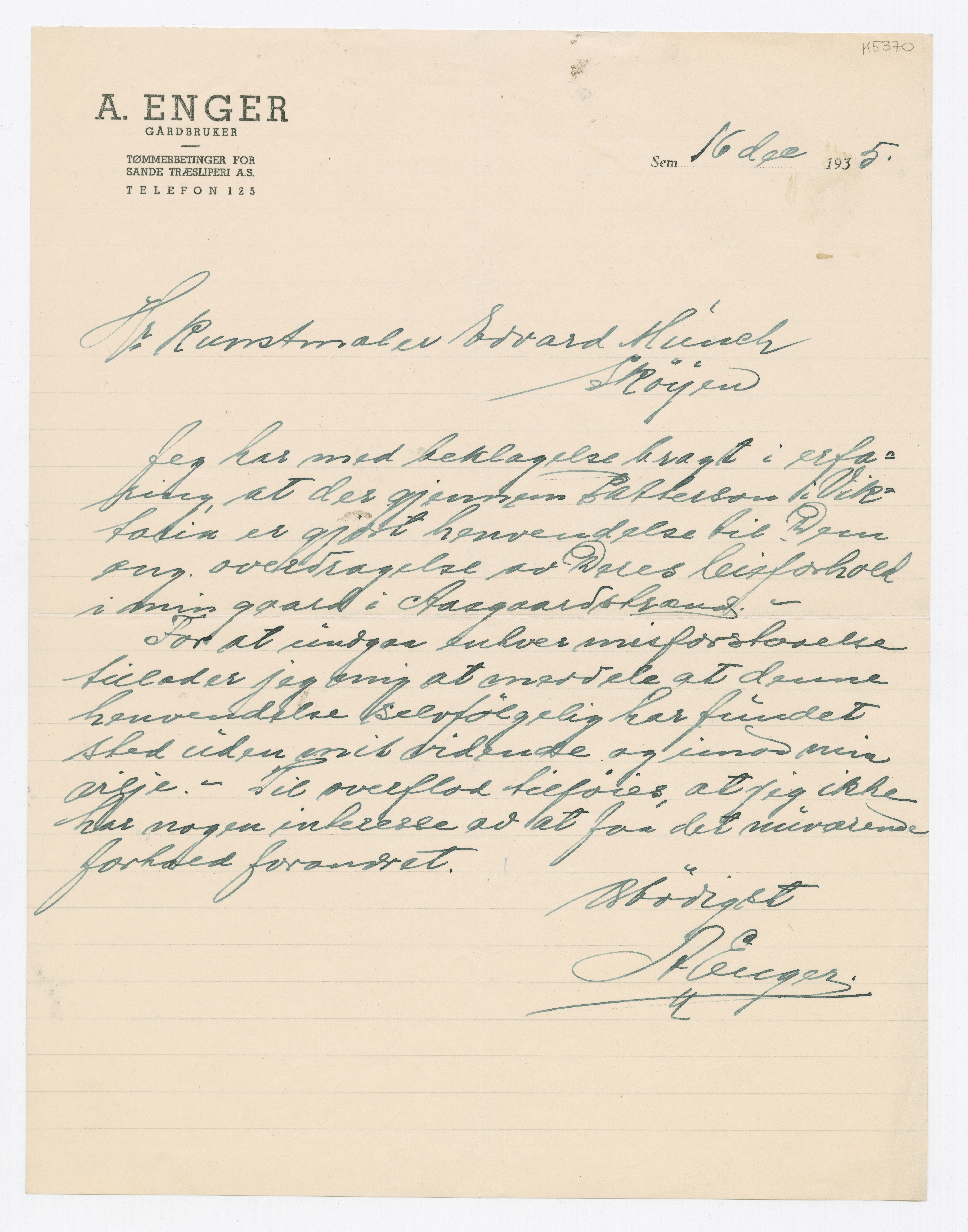 MM K 5370, Munchmuseet. Datert 16.12.1935. Brev fra Alfred Enger.