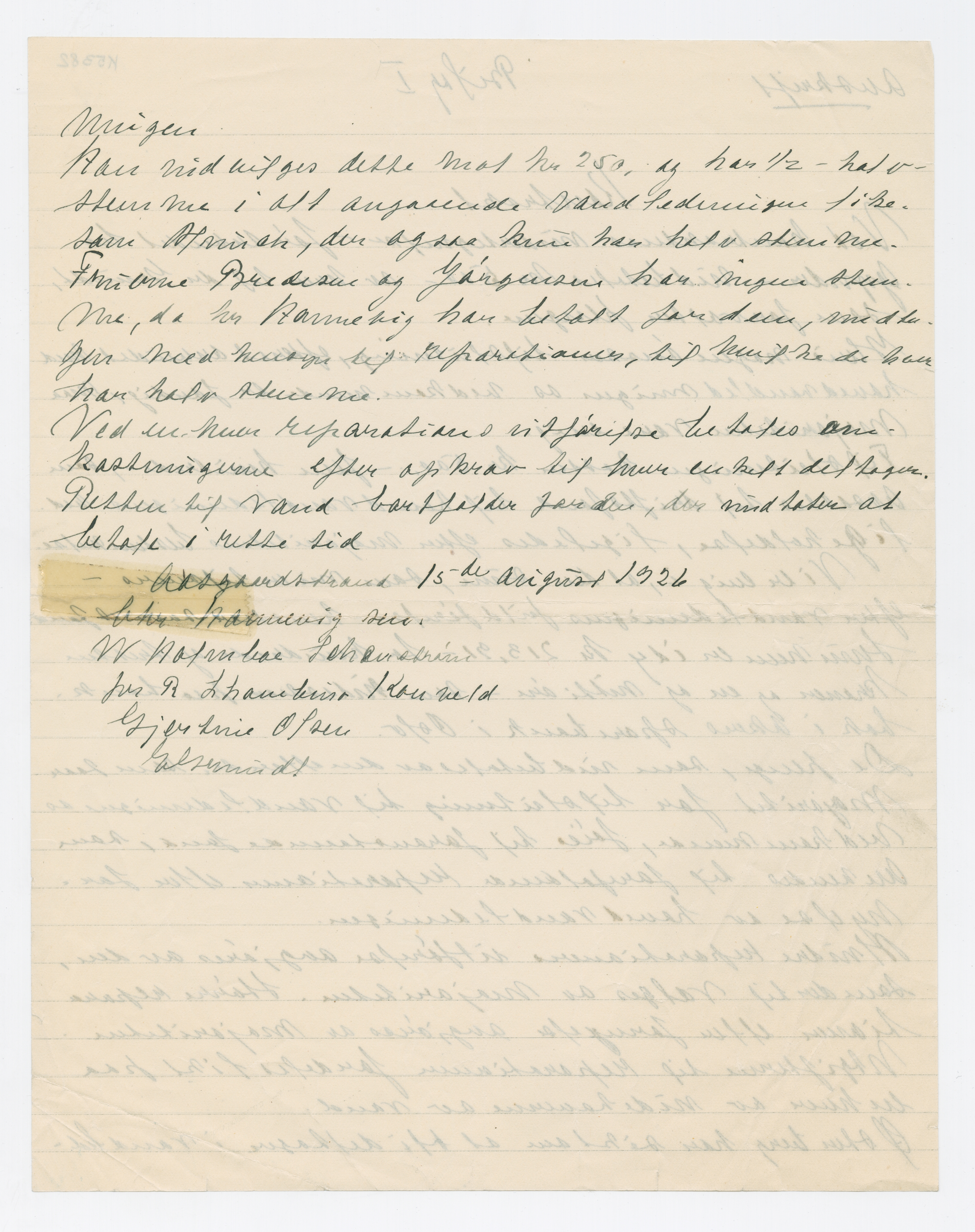 MM K 5382, Munchmuseet. Datert 15.08.1926. Brev fra Chr. Hannevig, W. Holmboe Schderstrøm, Gjertine Olsen.