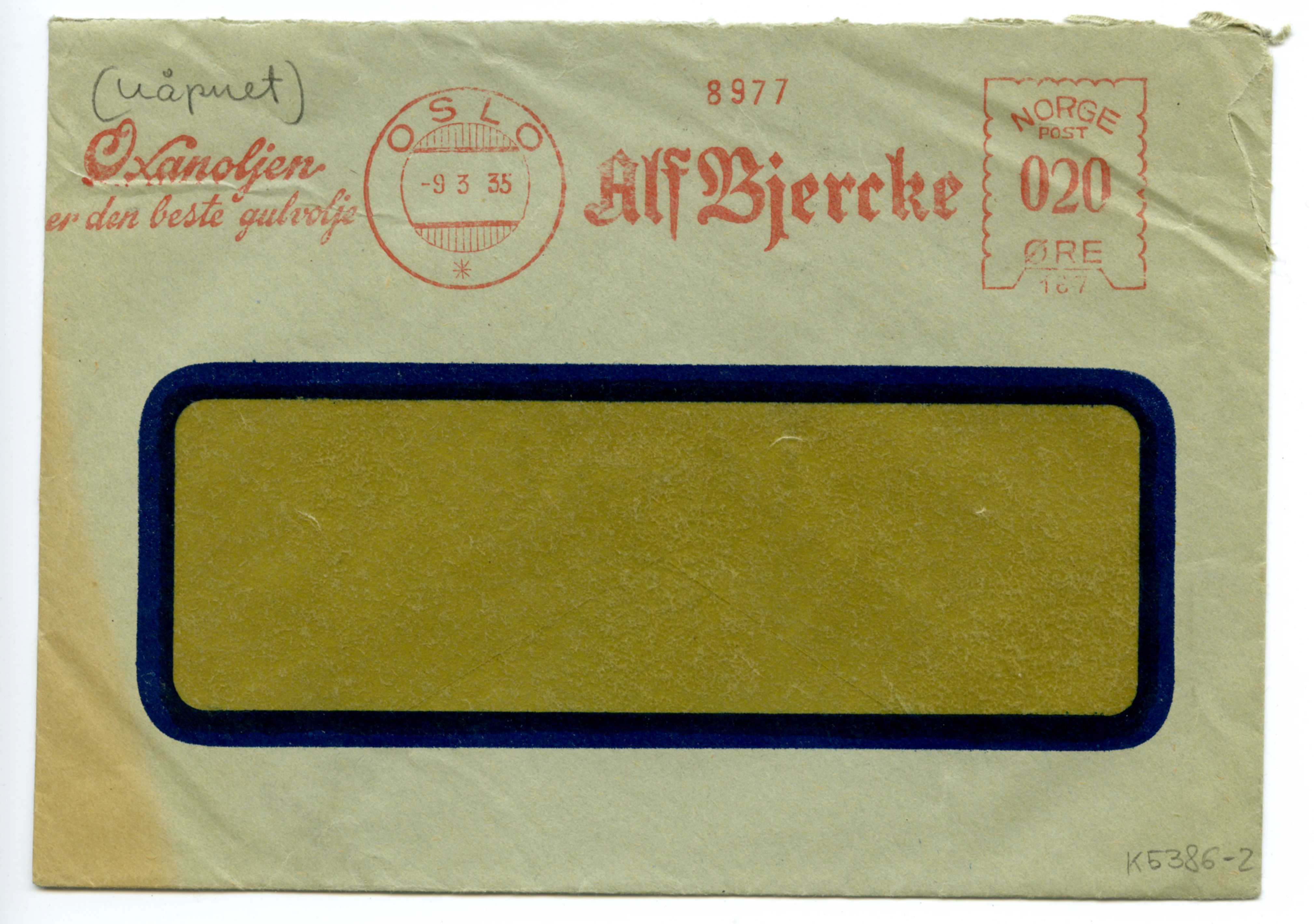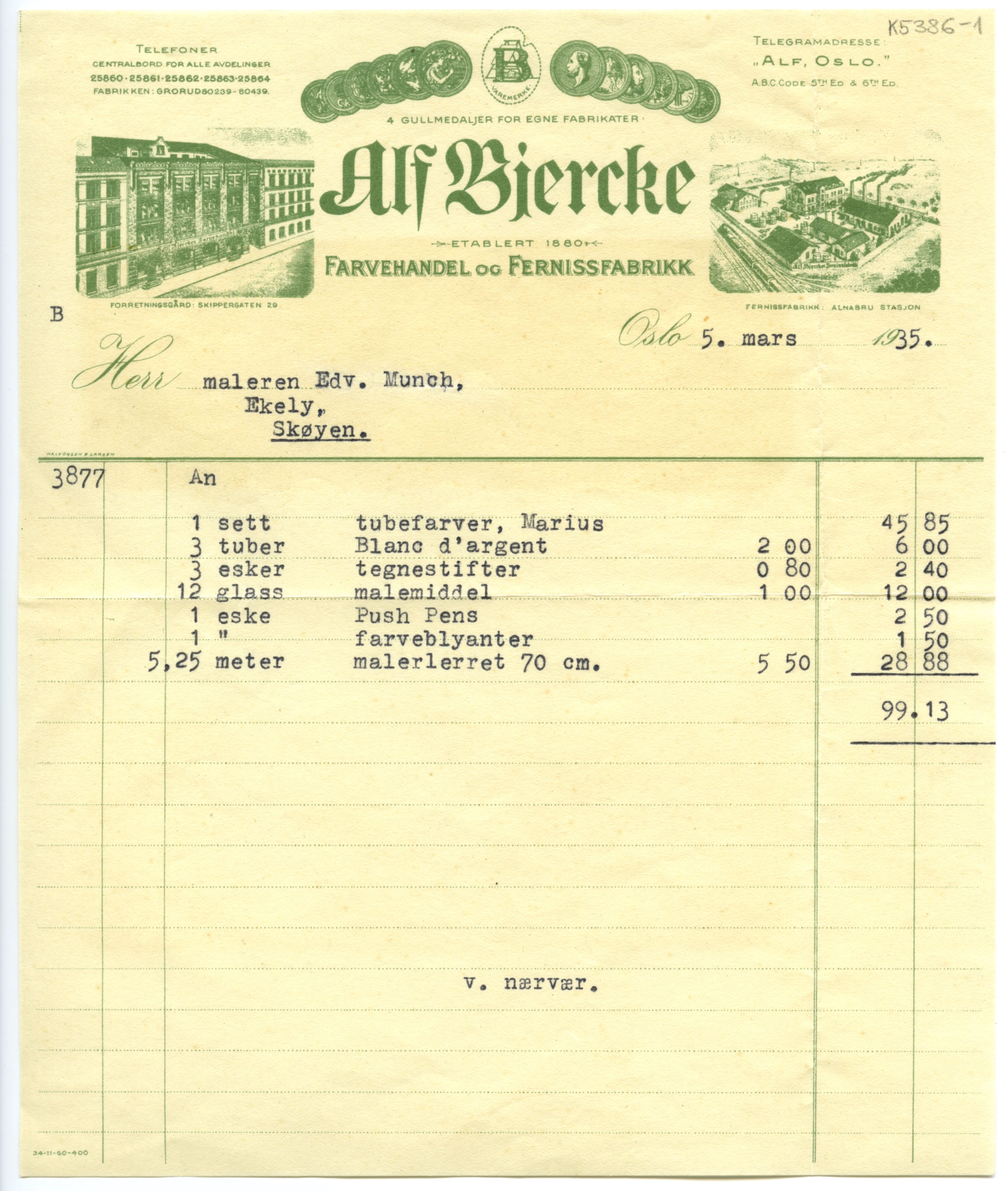 MM K 5386, Munchmuseet. Datert 05.03.1935. Brev fra Alf Bjercke Farvehandel og Fernissfabrikk.