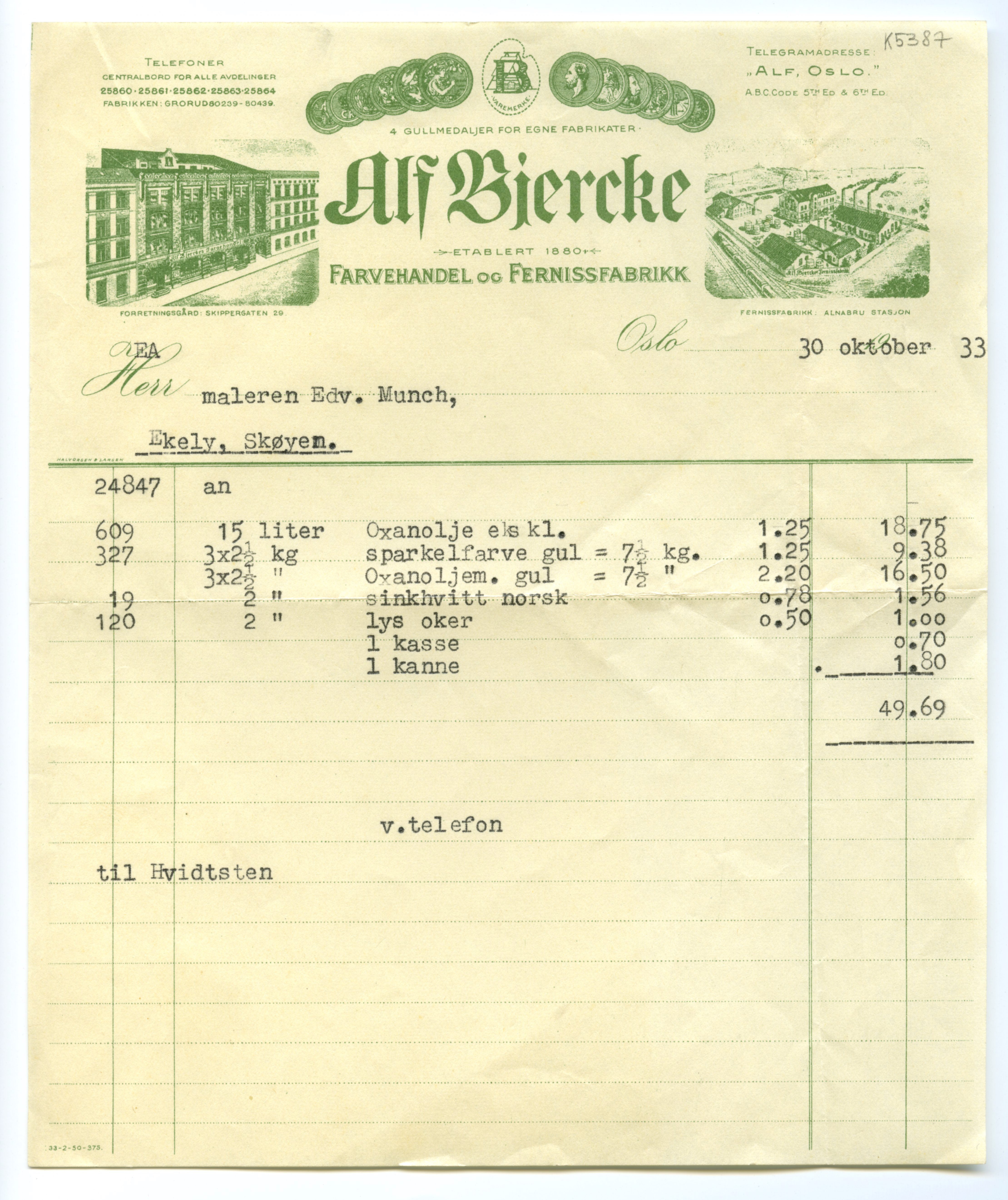 MM K 5387, Munchmuseet. Datert 30.10.1933. Brev fra Alf Bjercke Farvehandel og Fernissfabrikk.