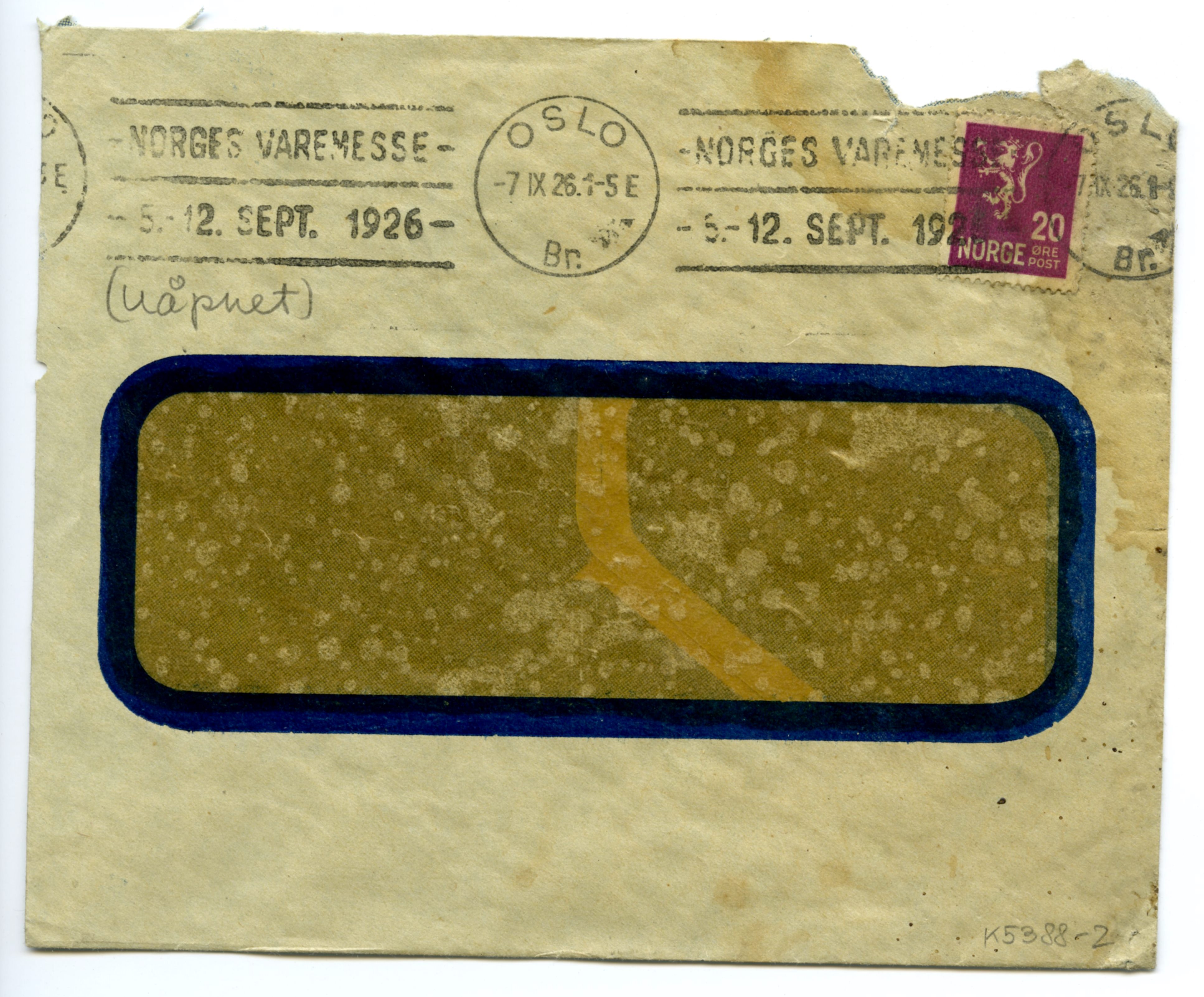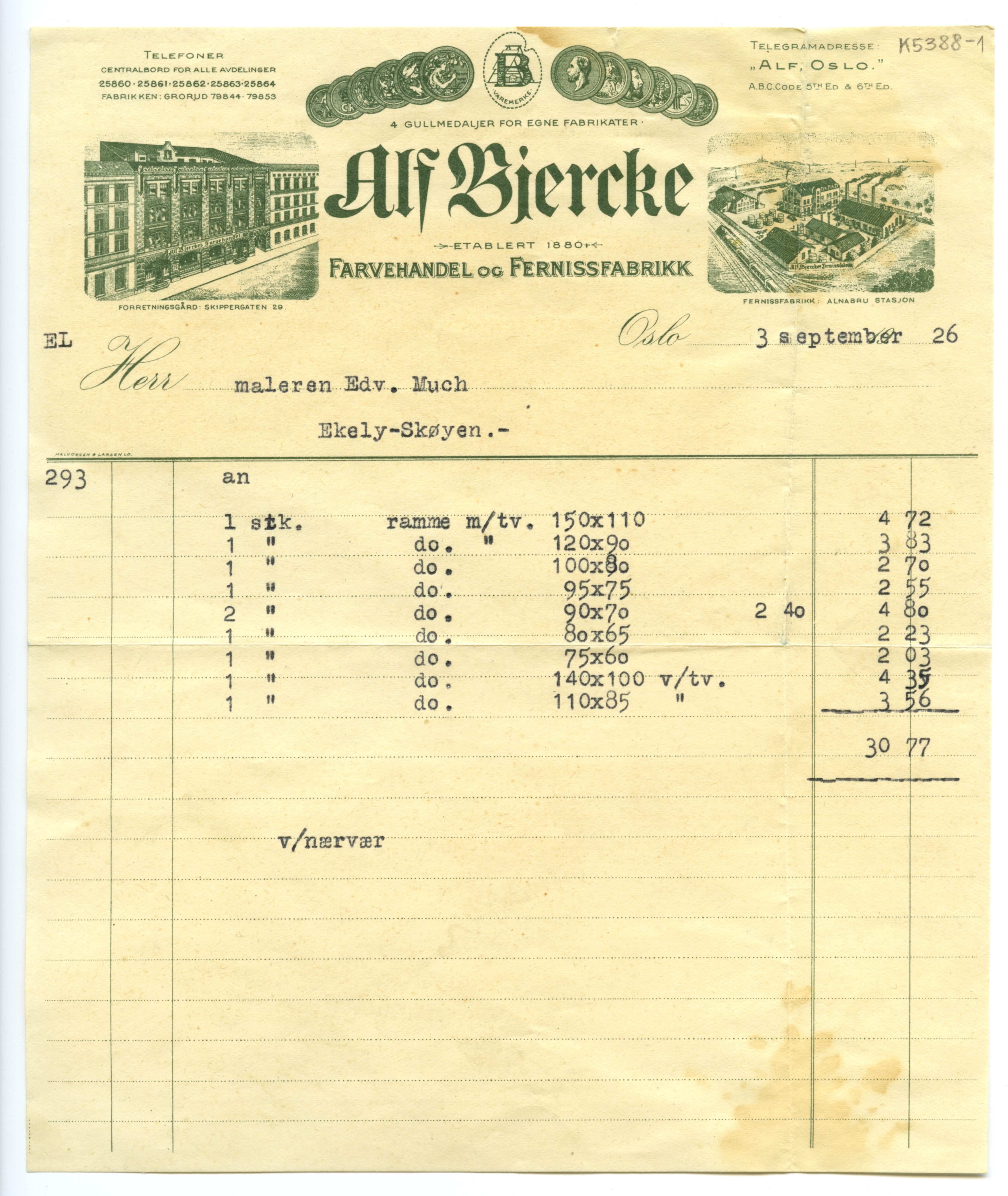 MM K 5388, Munchmuseet. Datert 03.09.1926. Brev fra Alf Bjercke Farvehandel og Fernissfabrikk.