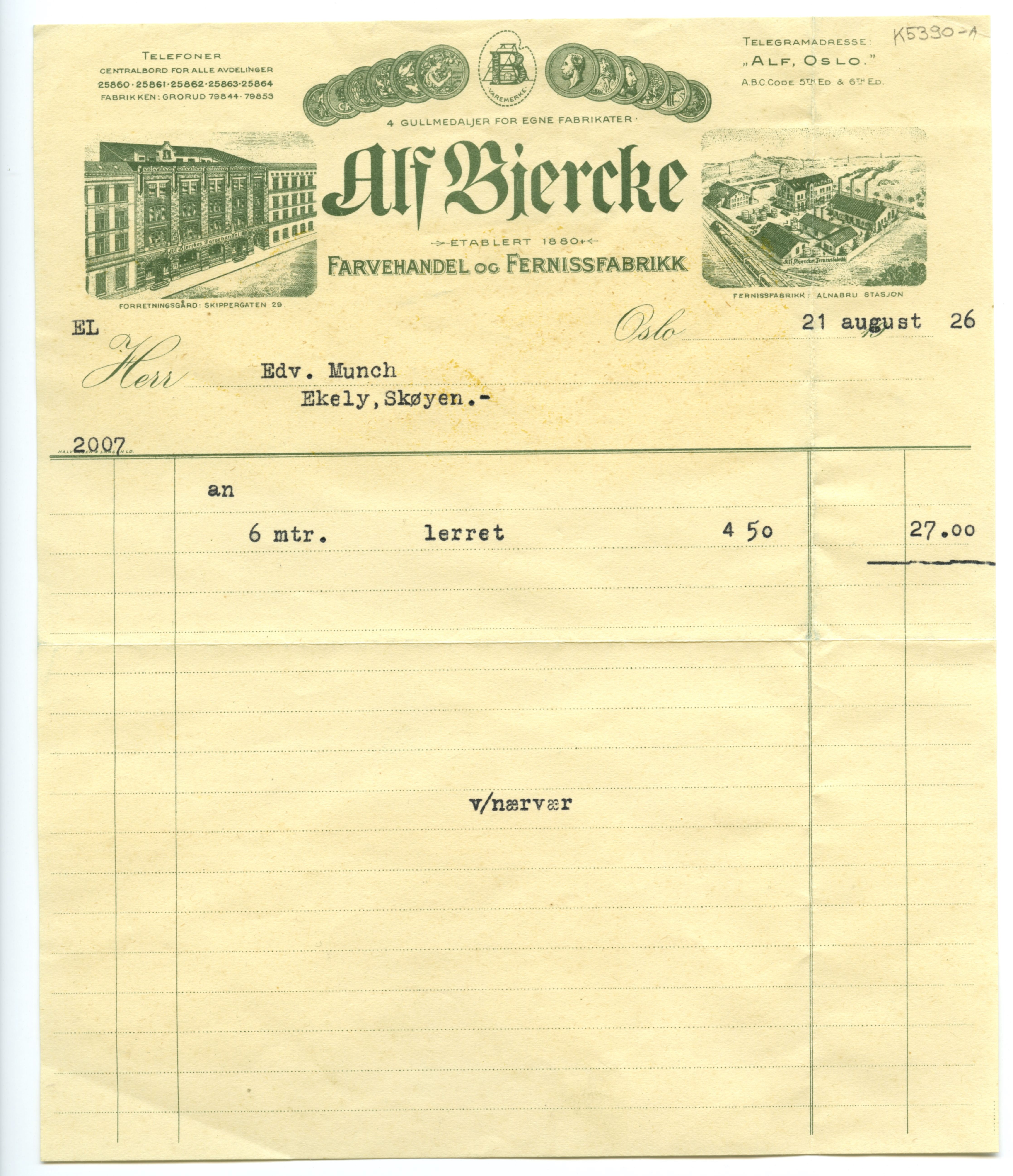 MM K 5390, Munchmuseet. Datert 21.08.1926. Brev fra Alf Bjercke Farvehandel og Fernissfabrikk.