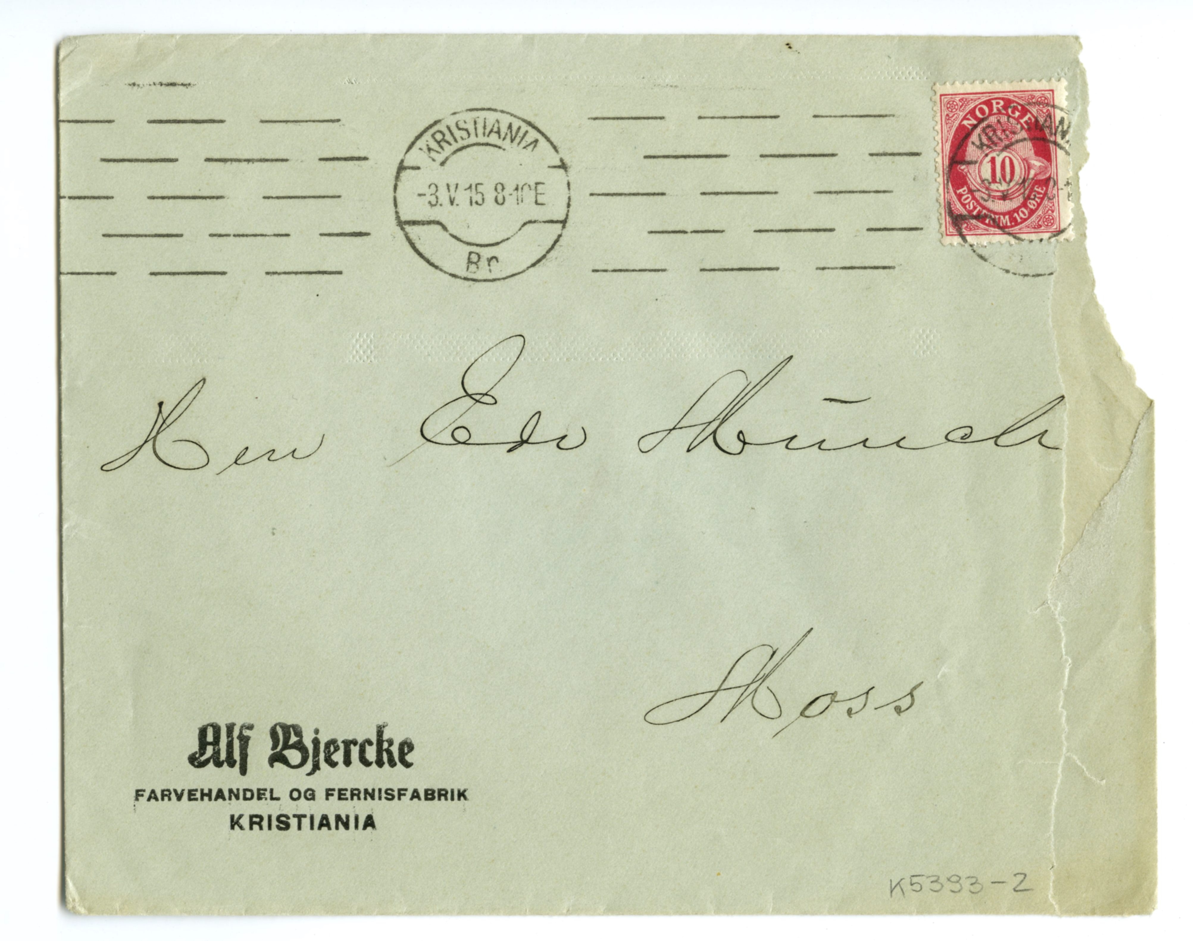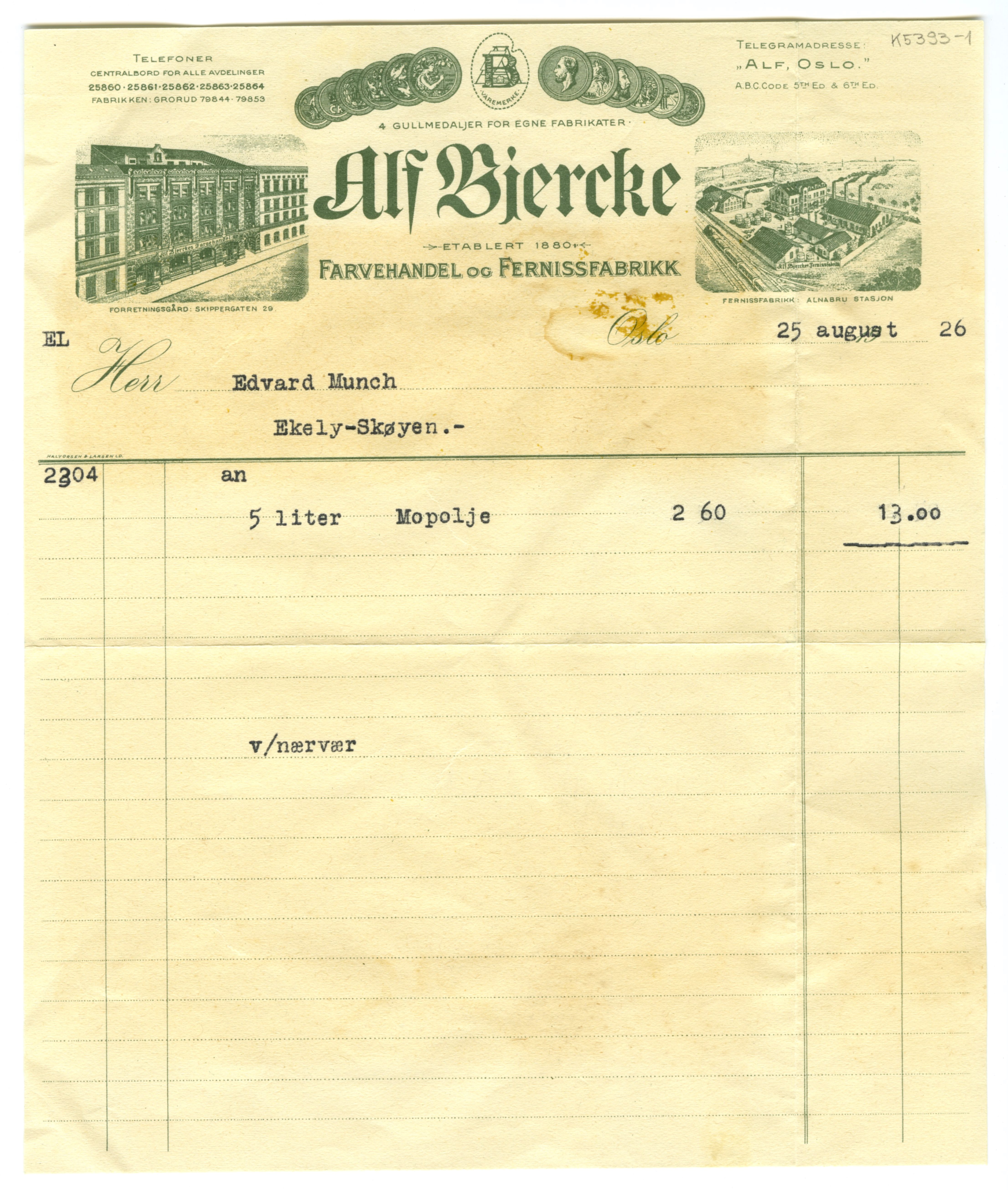 MM K 5393, Munchmuseet. Datert 25.08.1926. Brev fra Alf Bjercke Farvehandel og Fernissfabrikk.