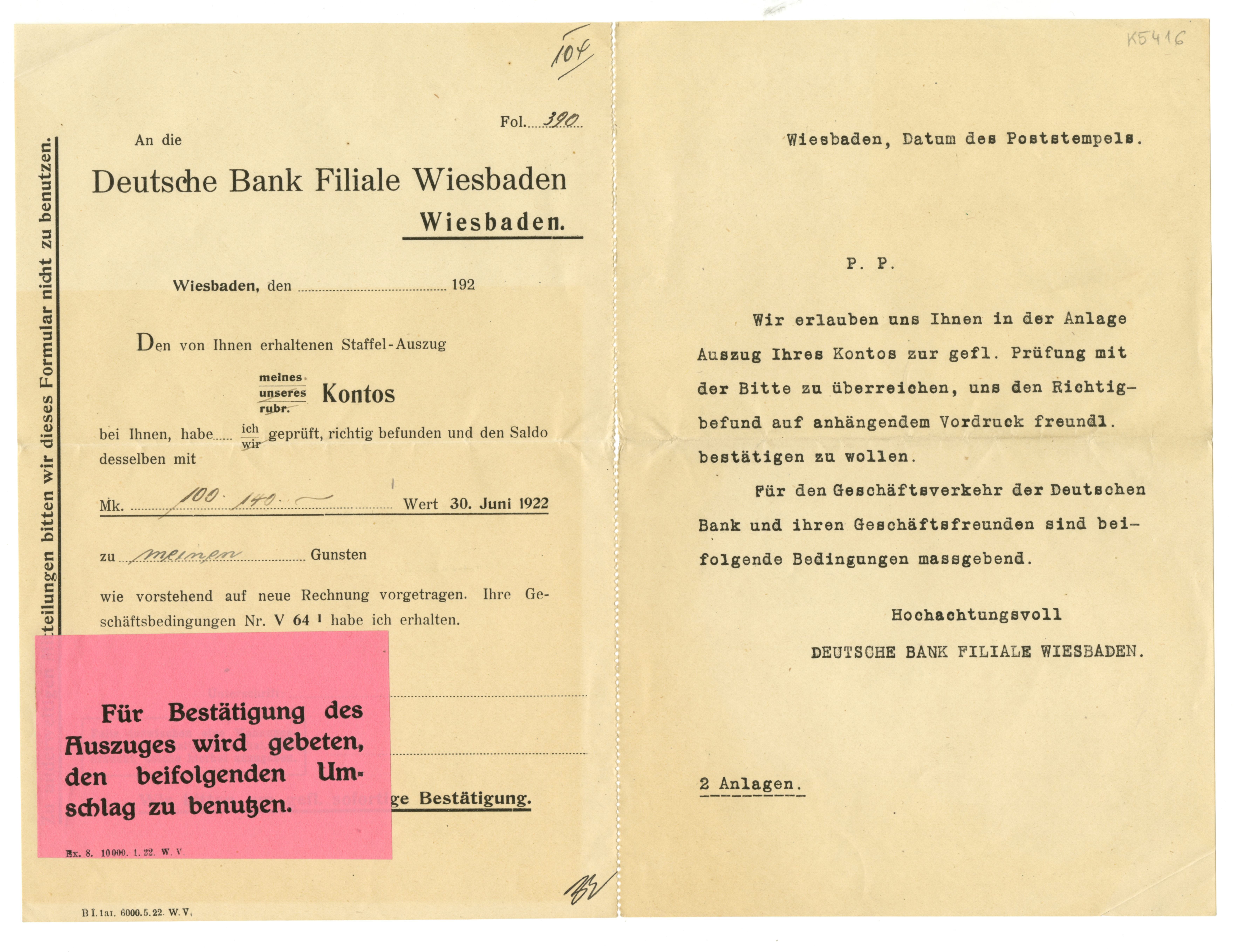 MM K 5416, Munchmuseet. Ikke datert. Brev fra Deutsche Bank Filiale Wiesbaden.