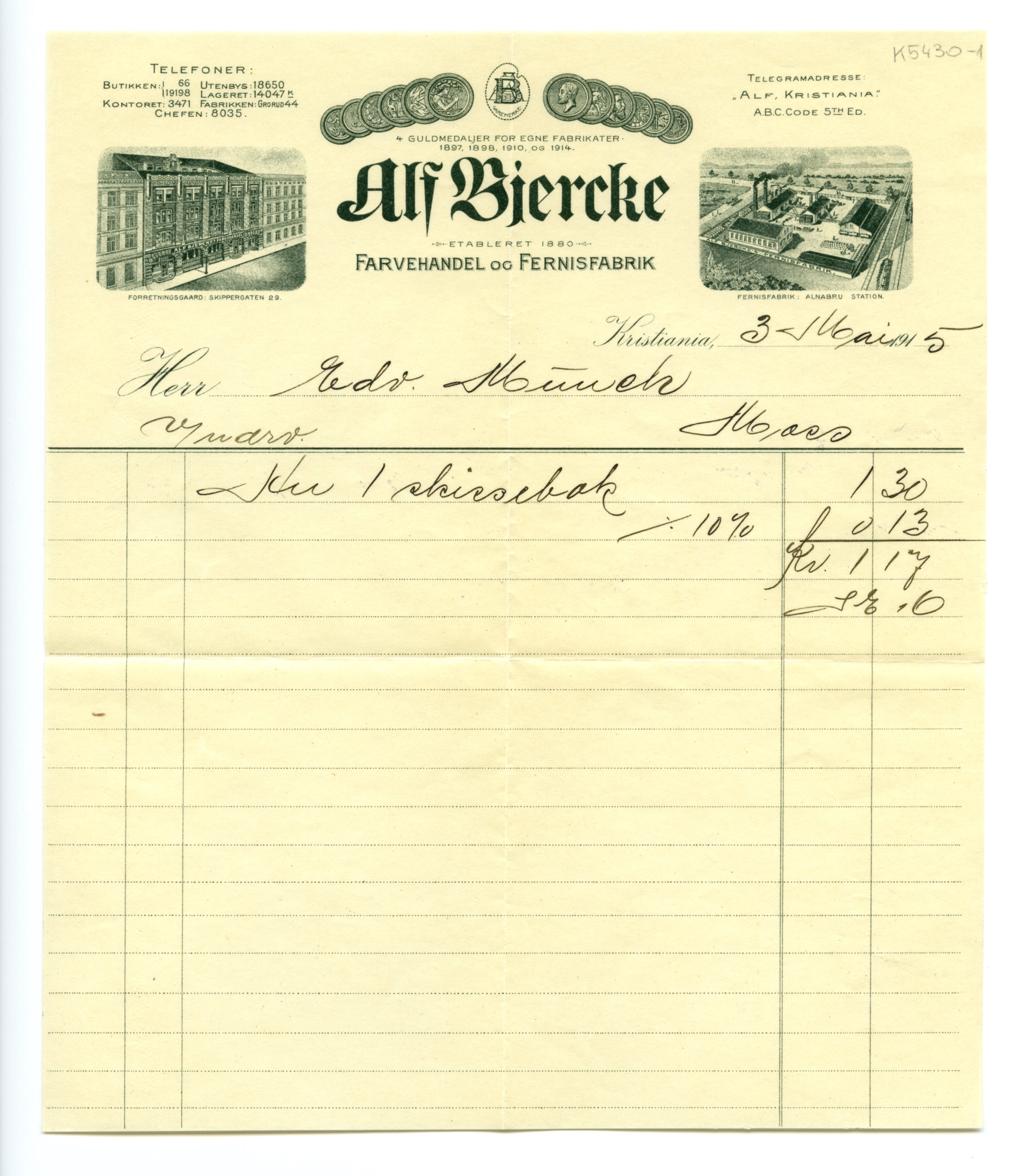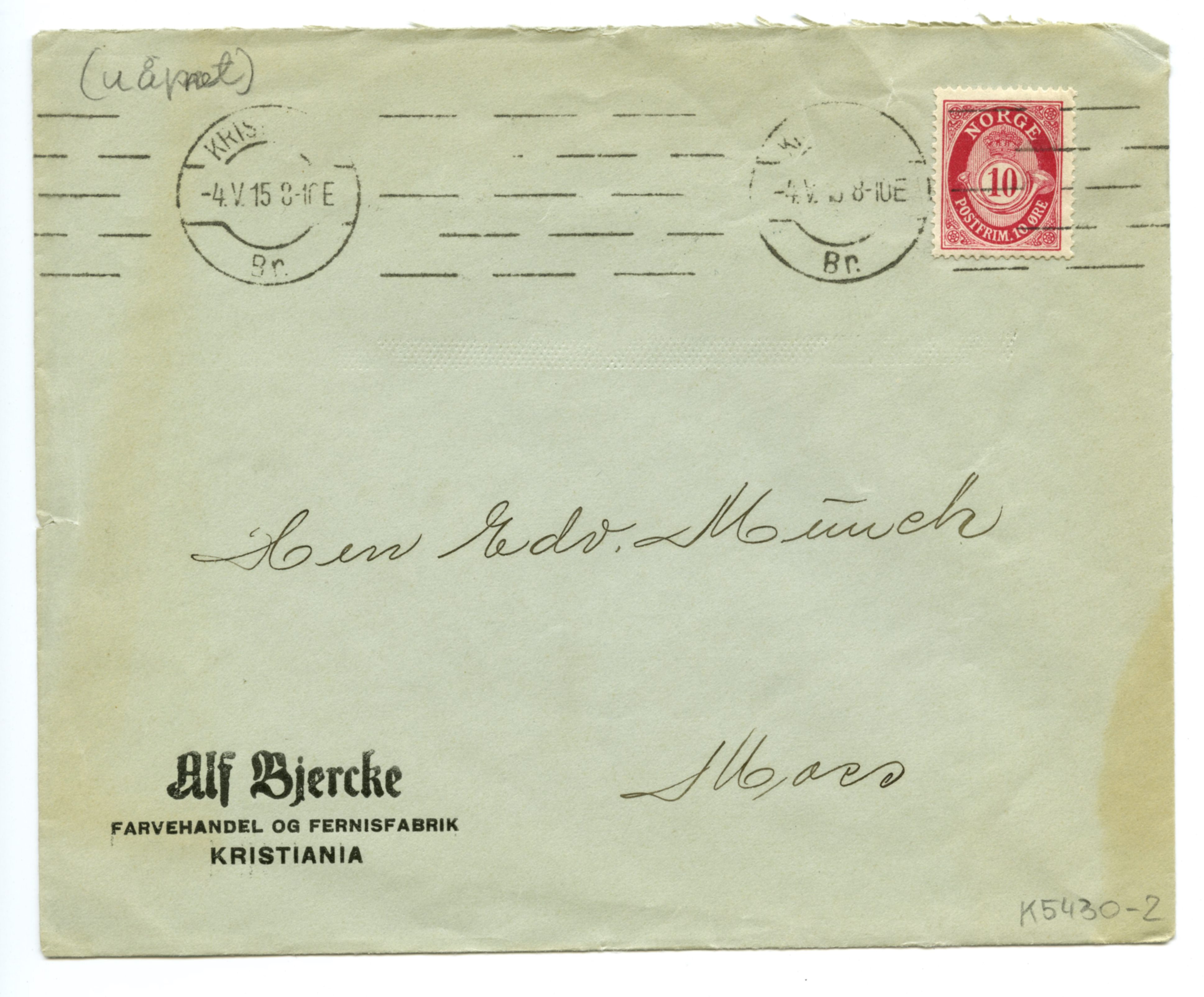 MM K 5430, Munchmuseet. Datert 03.05.1915. Brev fra Alf Bjercke Farvehandel og Fernissfabrikk.
