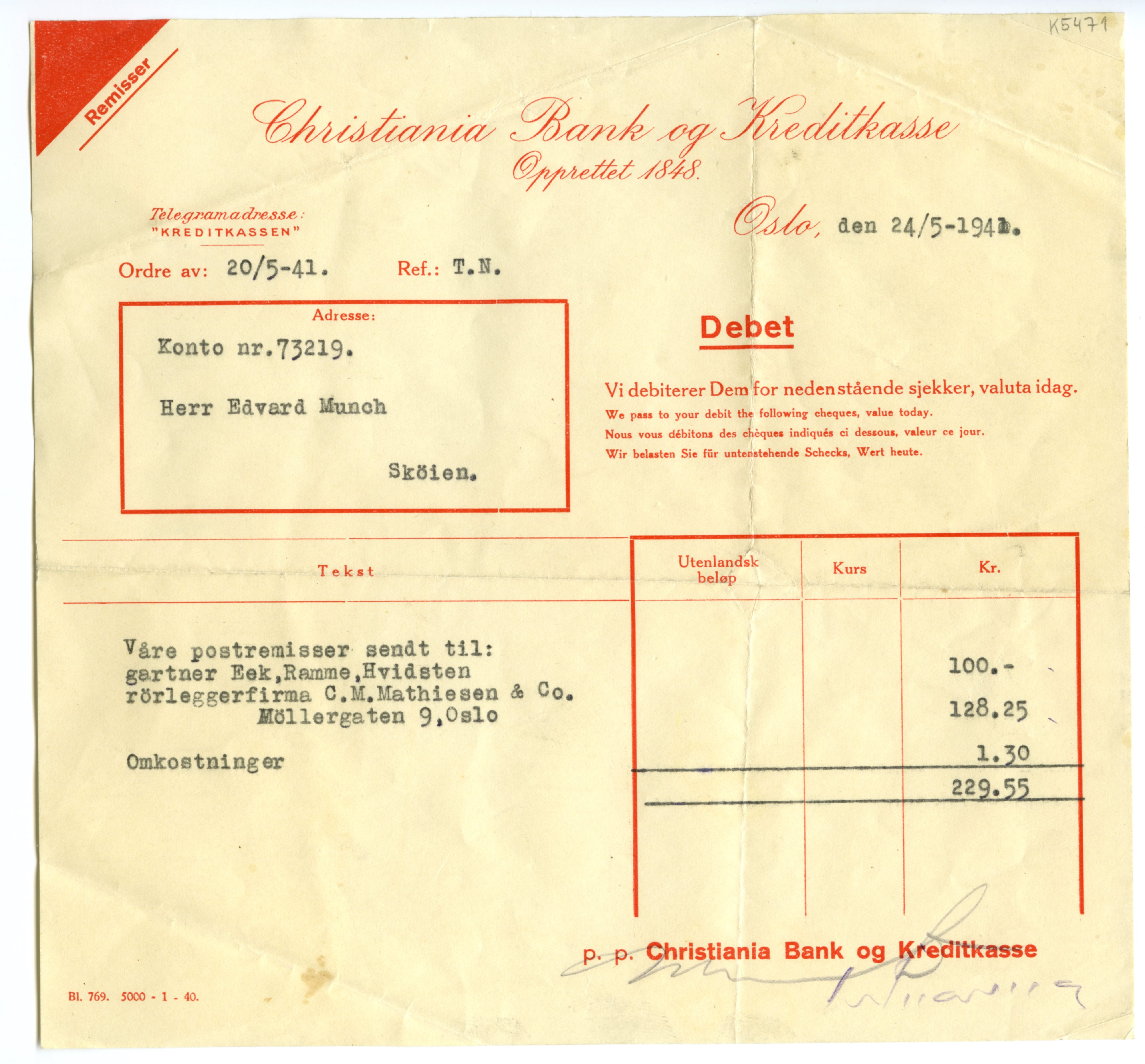 MM K 5471, Munchmuseet. Datert 24.05.1941. Brev fra Christiania Bank og Kreditkasse.