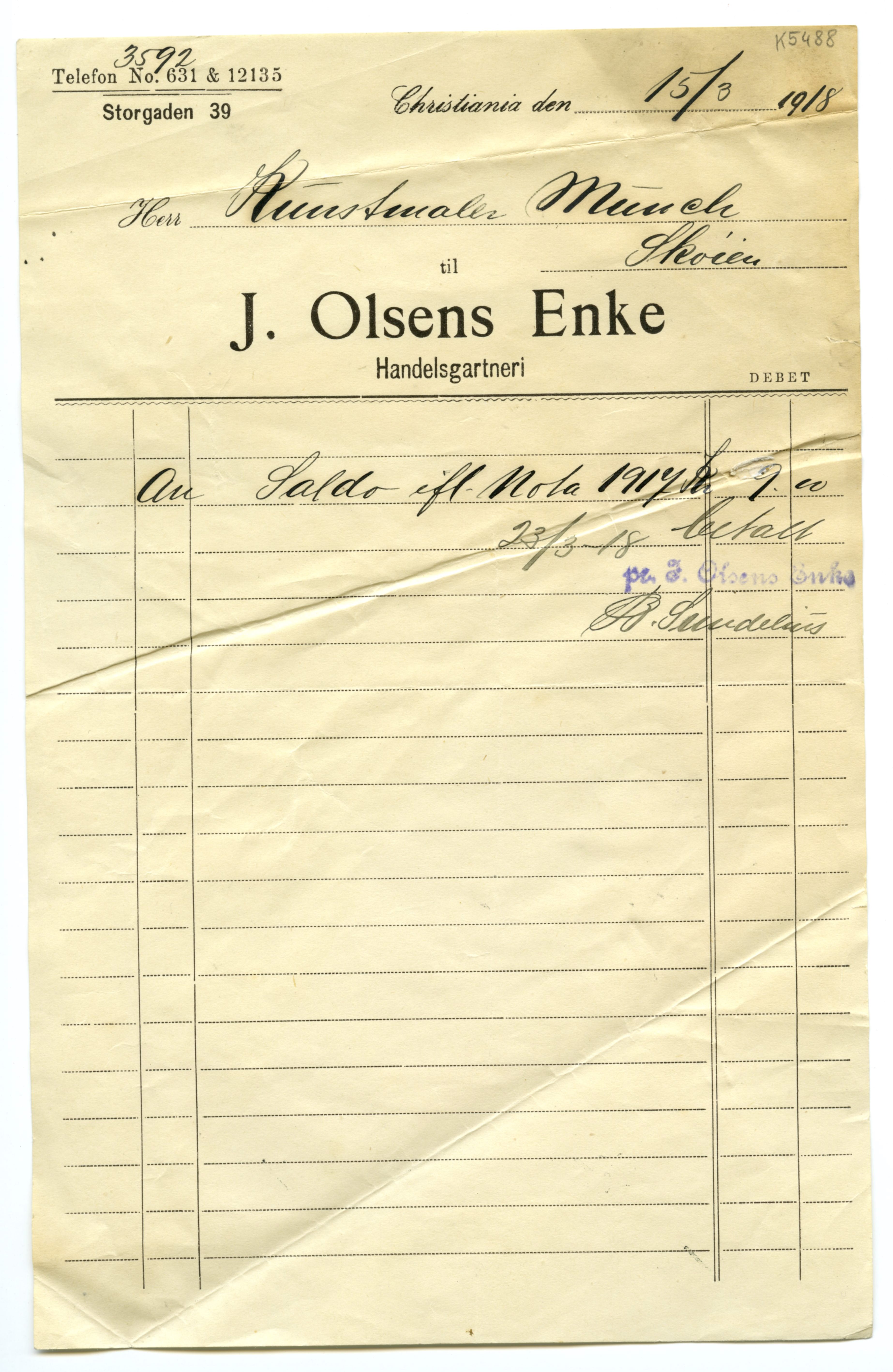 MM K 5488, Munchmuseet. Datert 15.03.1918. Brev fra J. Olsens Enke Handelsgartneri.