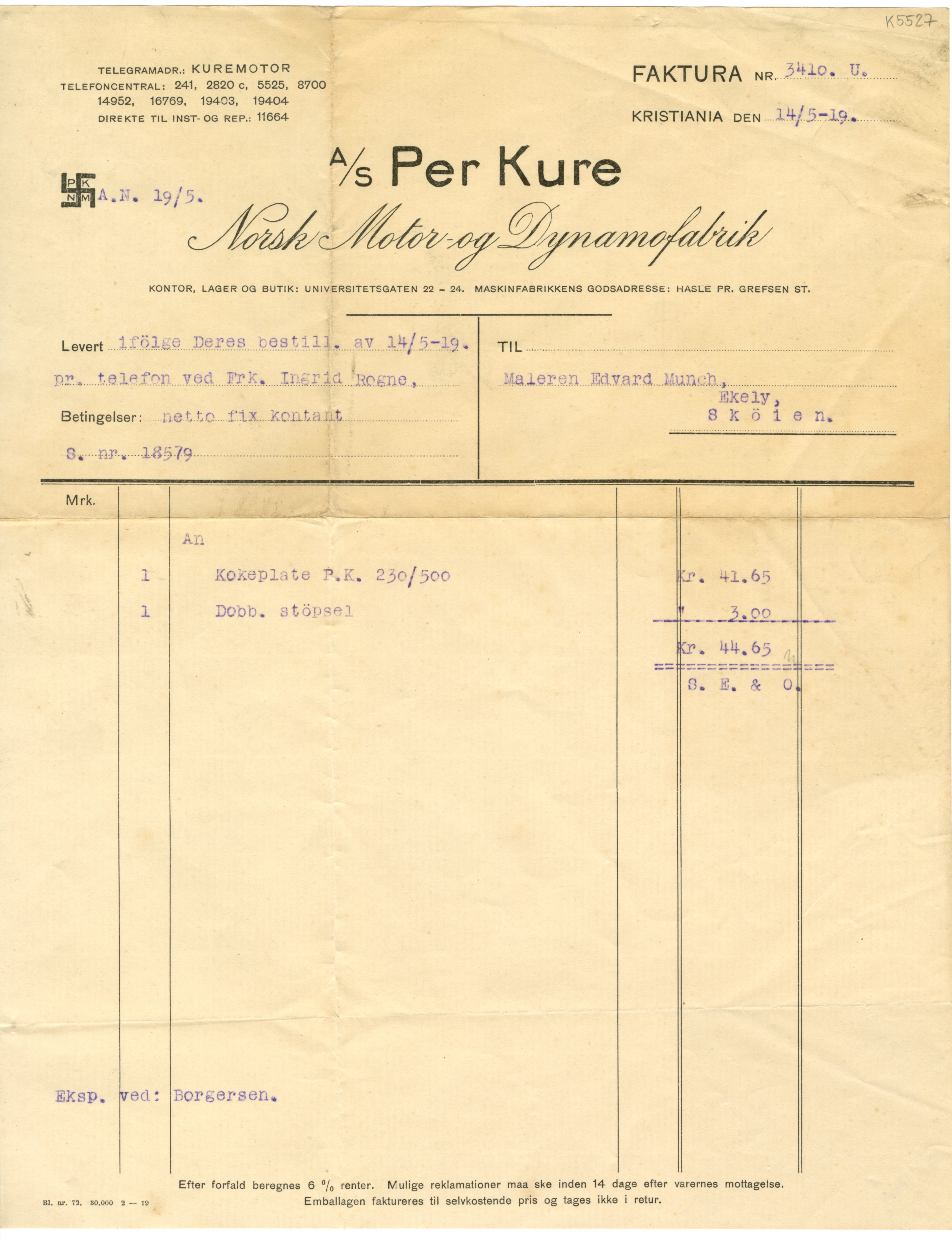 MM K 5527, Munchmuseet. Datert 14.05.1919. Brev fra Per Kure.