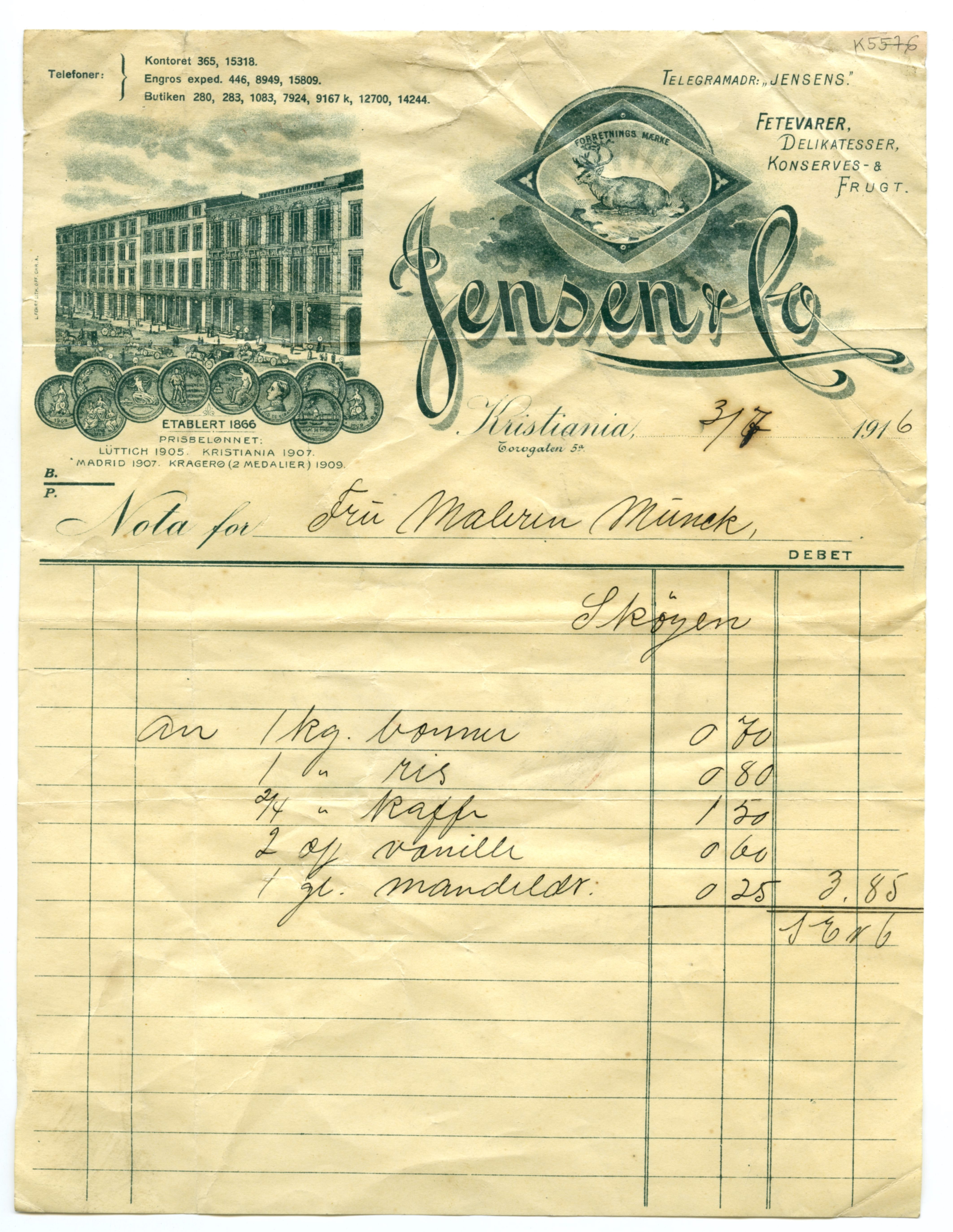 MM K 5576, Munchmuseet. Datert 03.07.1916. Brev fra konserves- & frugt Jensen & Co Fetevarer. Delikatesser.