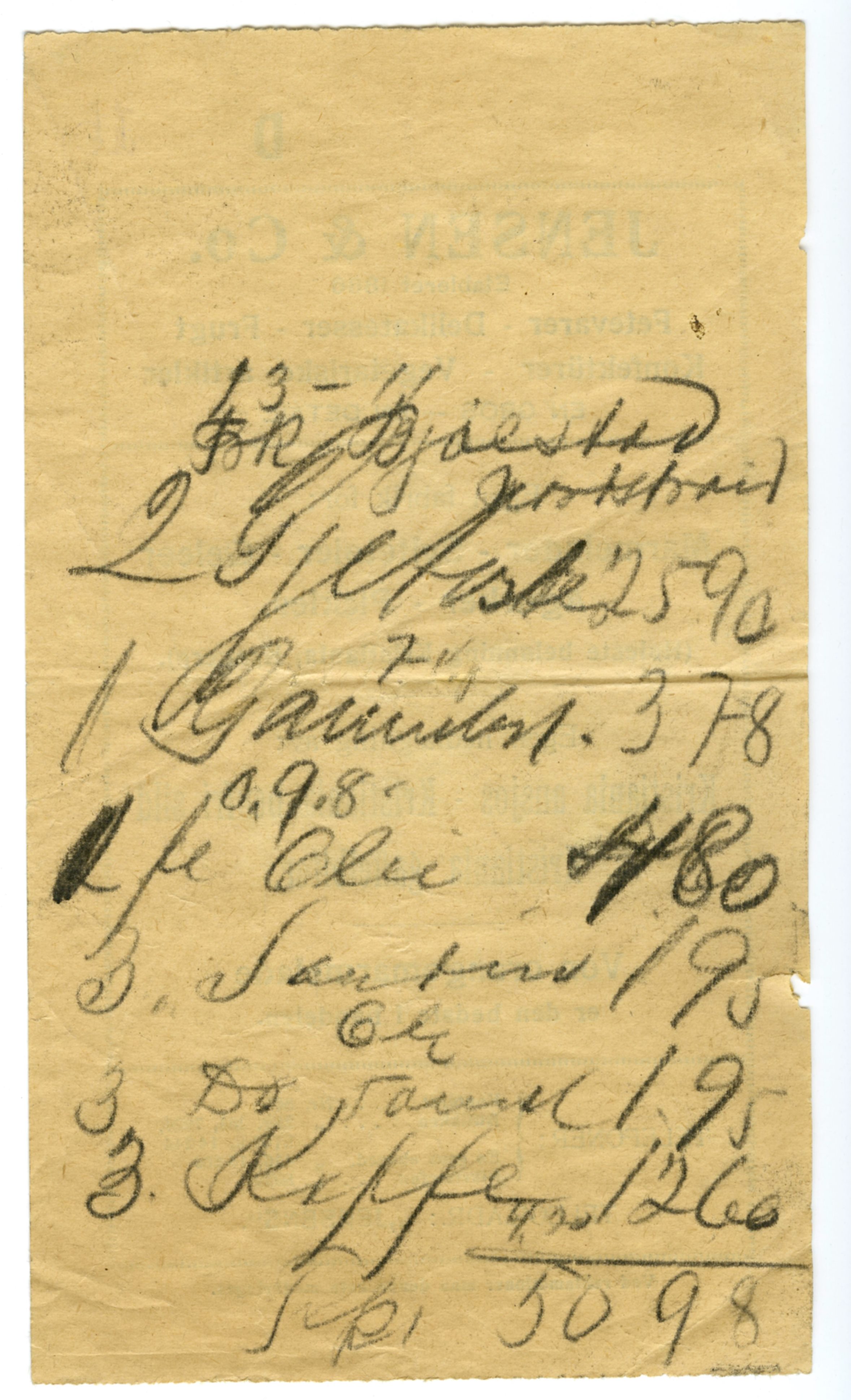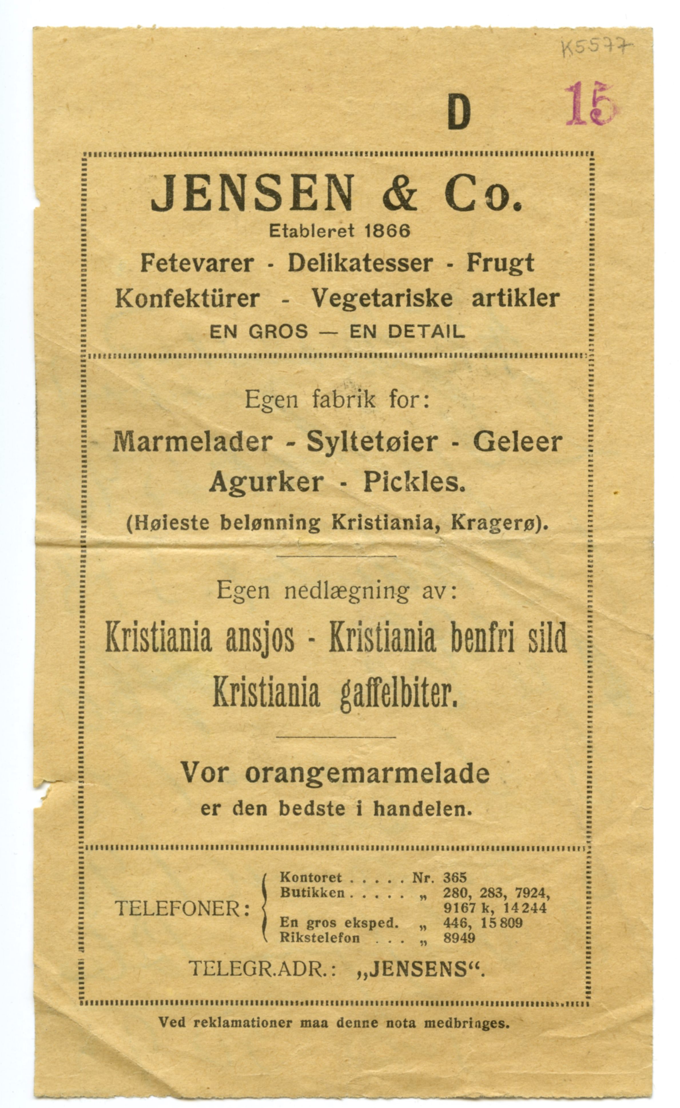 MM K 5577, Munchmuseet. Ikke datert. Brev fra konserves- & frugt Jensen & Co Fetevarer. Delikatesser.