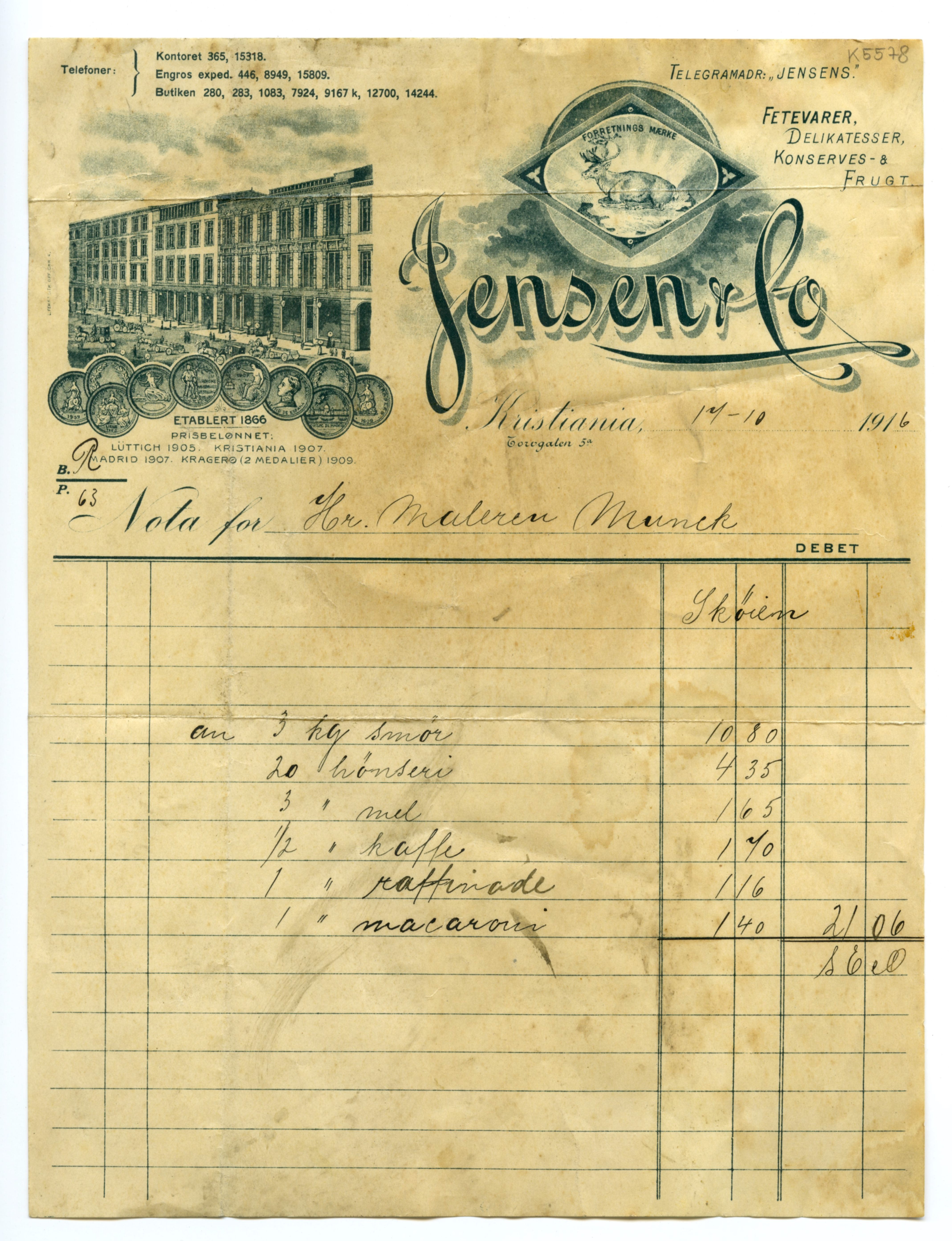 MM K 5578, Munchmuseet. Datert 19.10.1916. Brev fra konserves- & frugt Jensen & Co Fetevarer. Delikatesser.