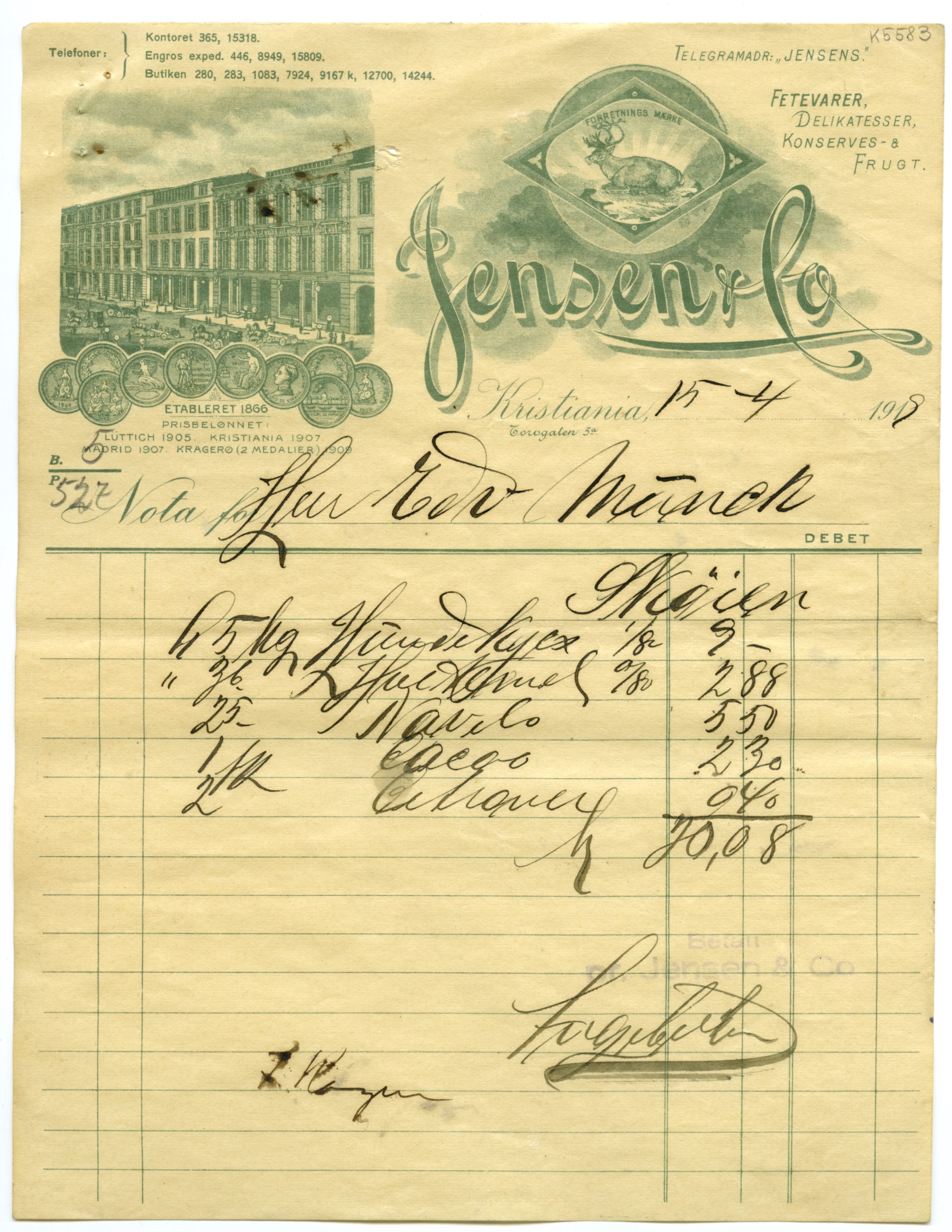 MM K 5583, Munchmuseet. Datert 15.04.1919. Brev fra konserves- & frugt Jensen & Co Fetevarer. Delikatesser.