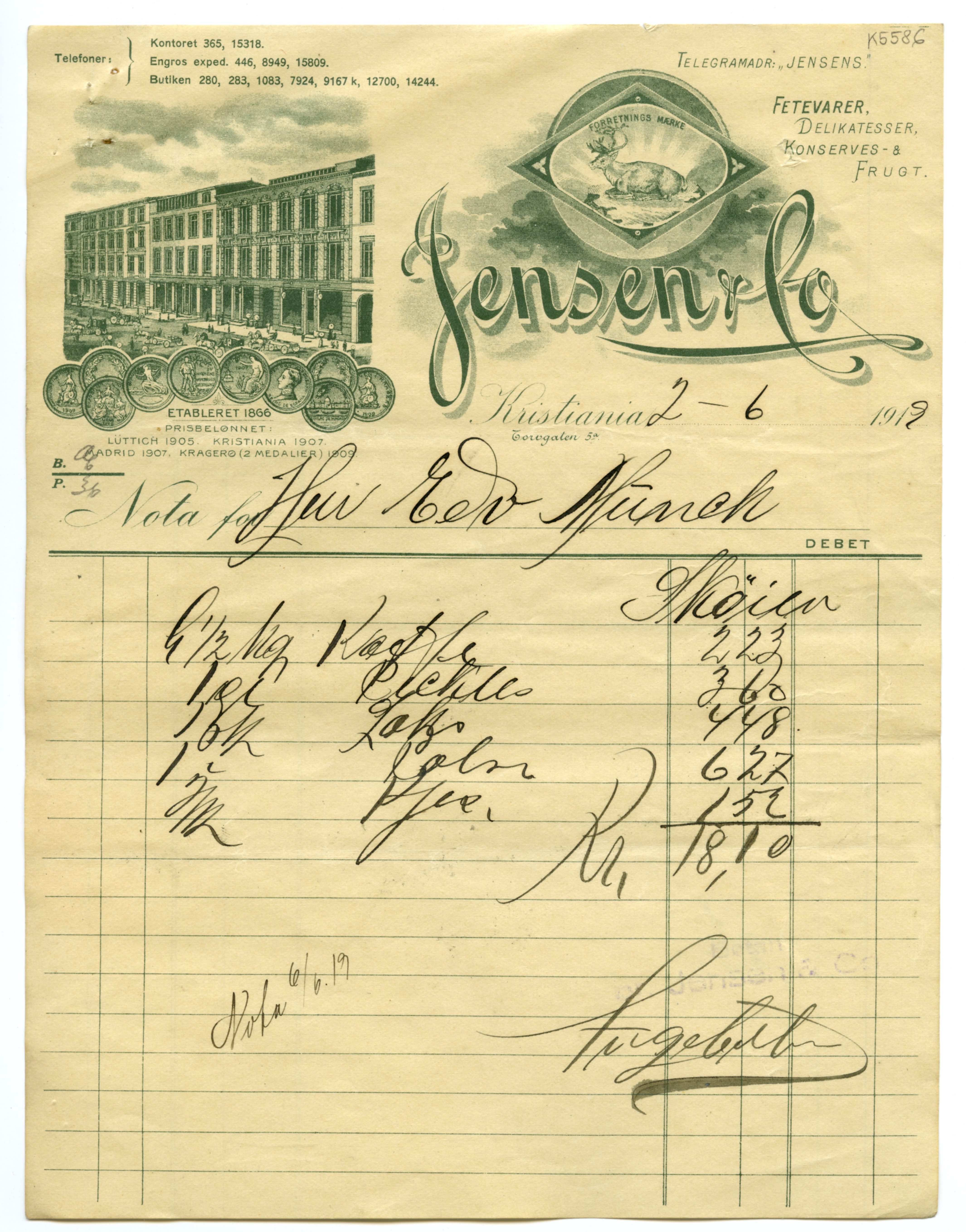 MM K 5586, Munchmuseet. Datert 02.06.1919. Brev fra konserves- & frugt Jensen & Co Fetevarer. Delikatesser.