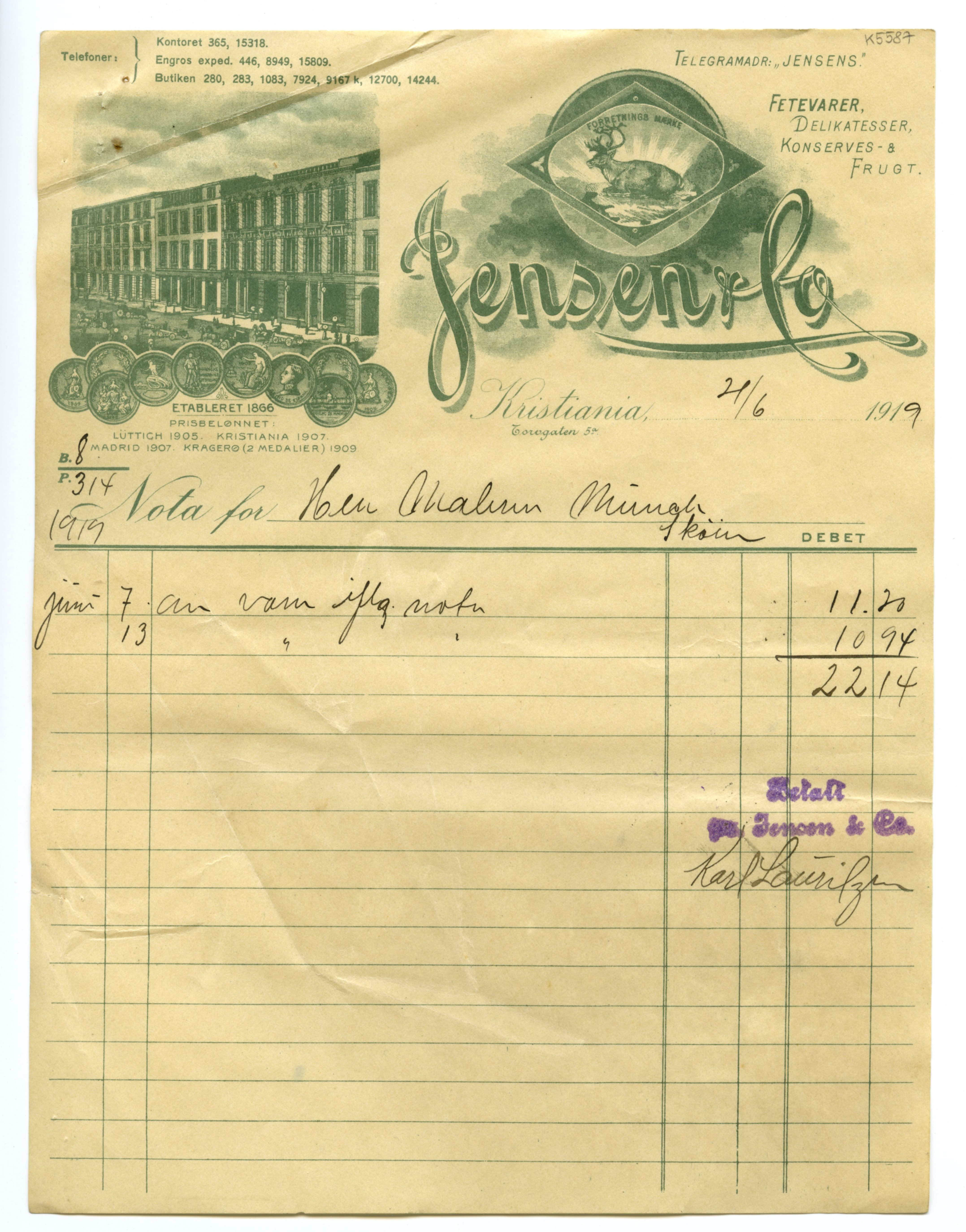 MM K 5587, Munchmuseet. Datert 21.06.1919. Brev fra konserves- & frugt Jensen & Co Fetevarer. Delikatesser.