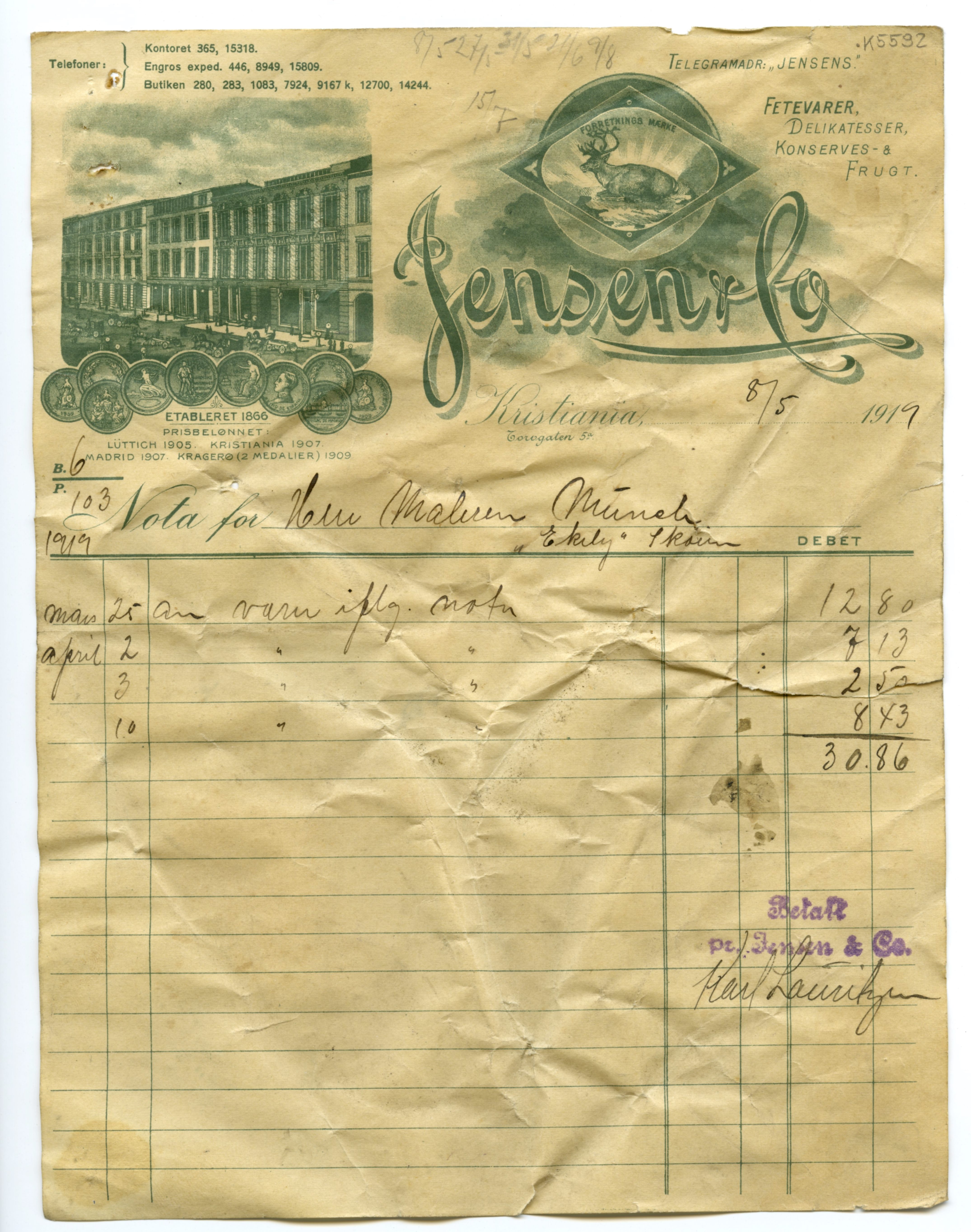 MM K 5592, Munchmuseet. Datert 08.05.1919. Brev fra konserves- & frugt Jensen & Co Fetevarer. Delikatesser.