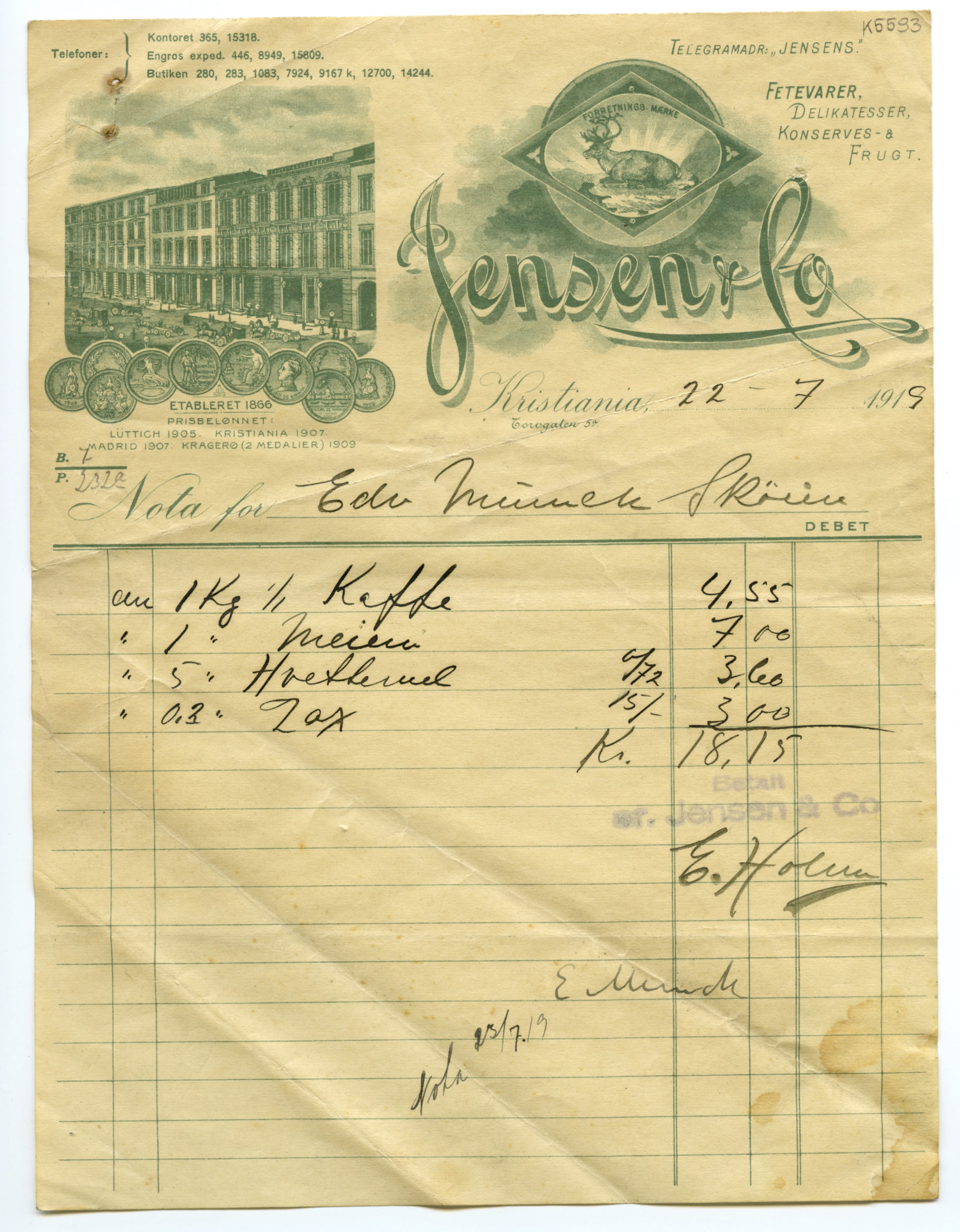 MM K 5593, Munchmuseet. Datert 22.07.1919. Brev fra konserves- & frugt Jensen & Co Fetevarer. Delikatesser.