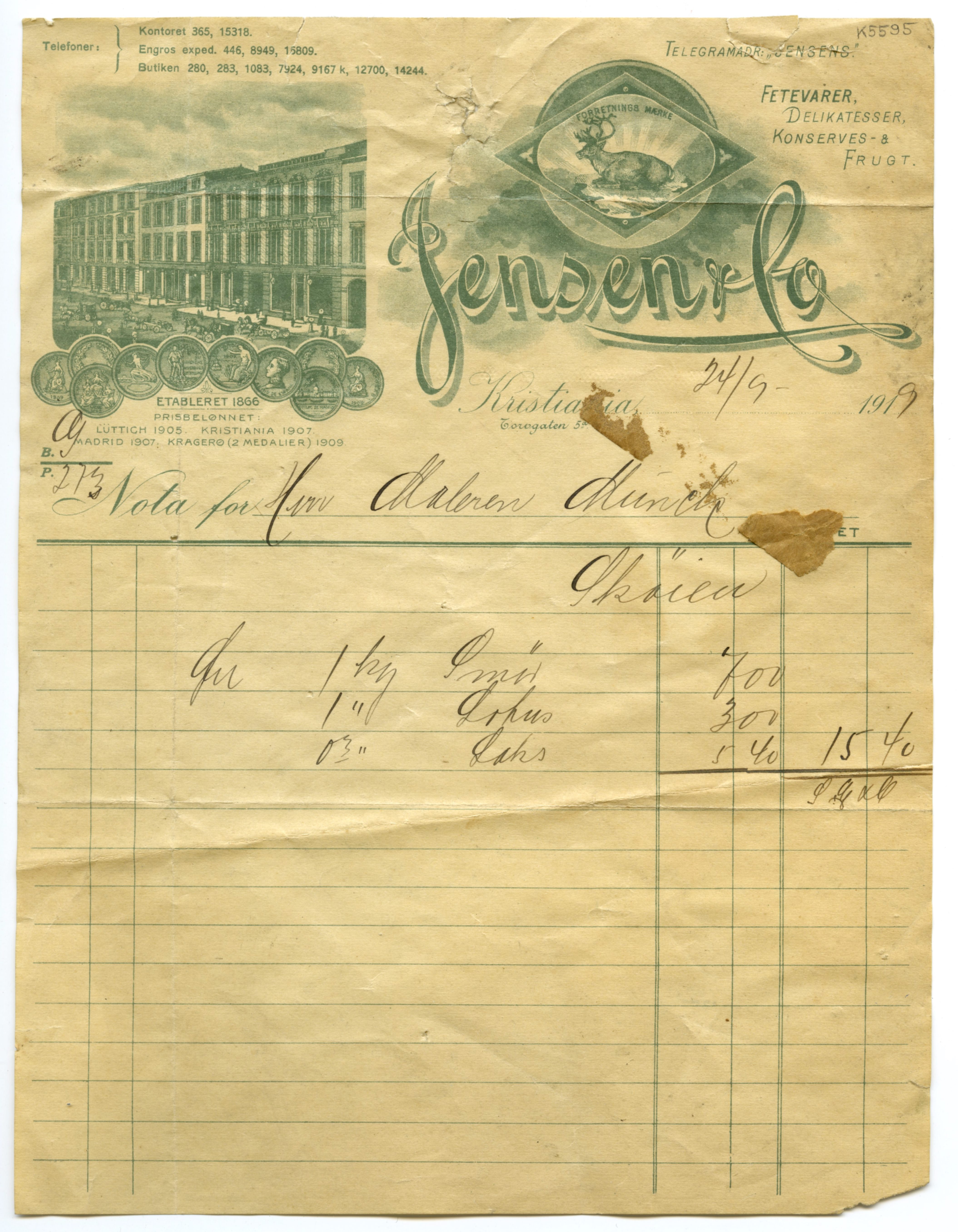 MM K 5595, Munchmuseet. Datert 24.09.1919. Brev fra konserves- & frugt Jensen & Co Fetevarer. Delikatesser.