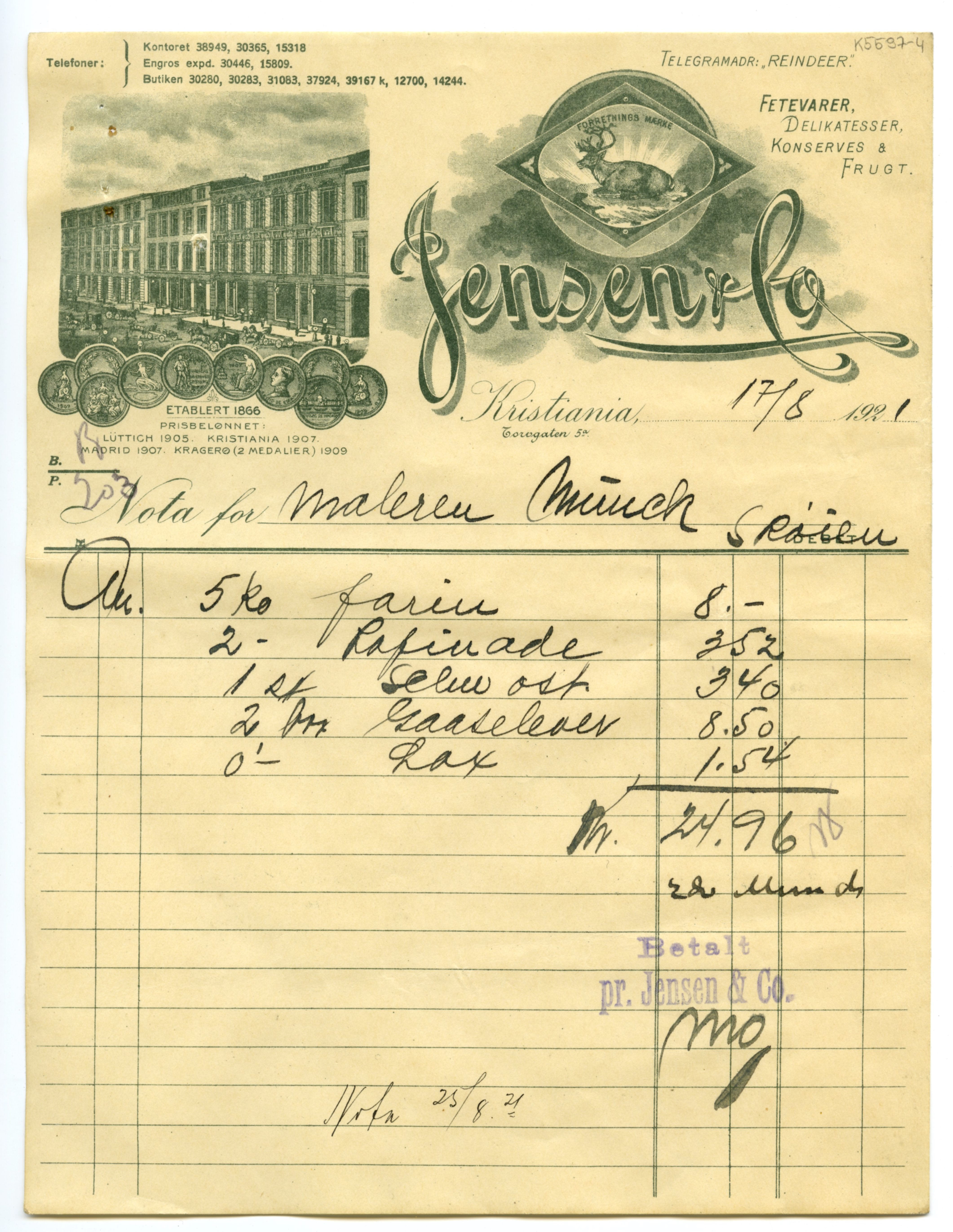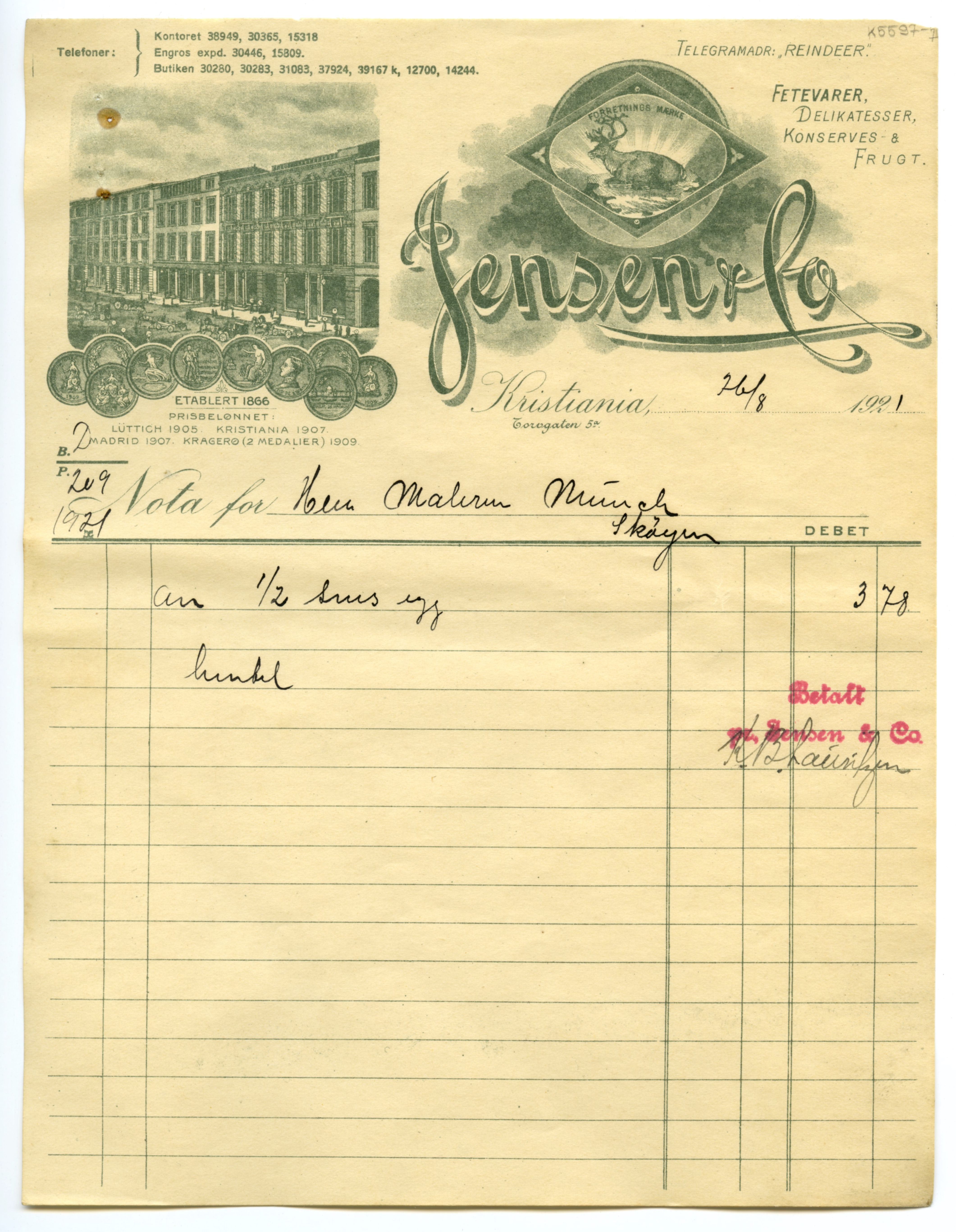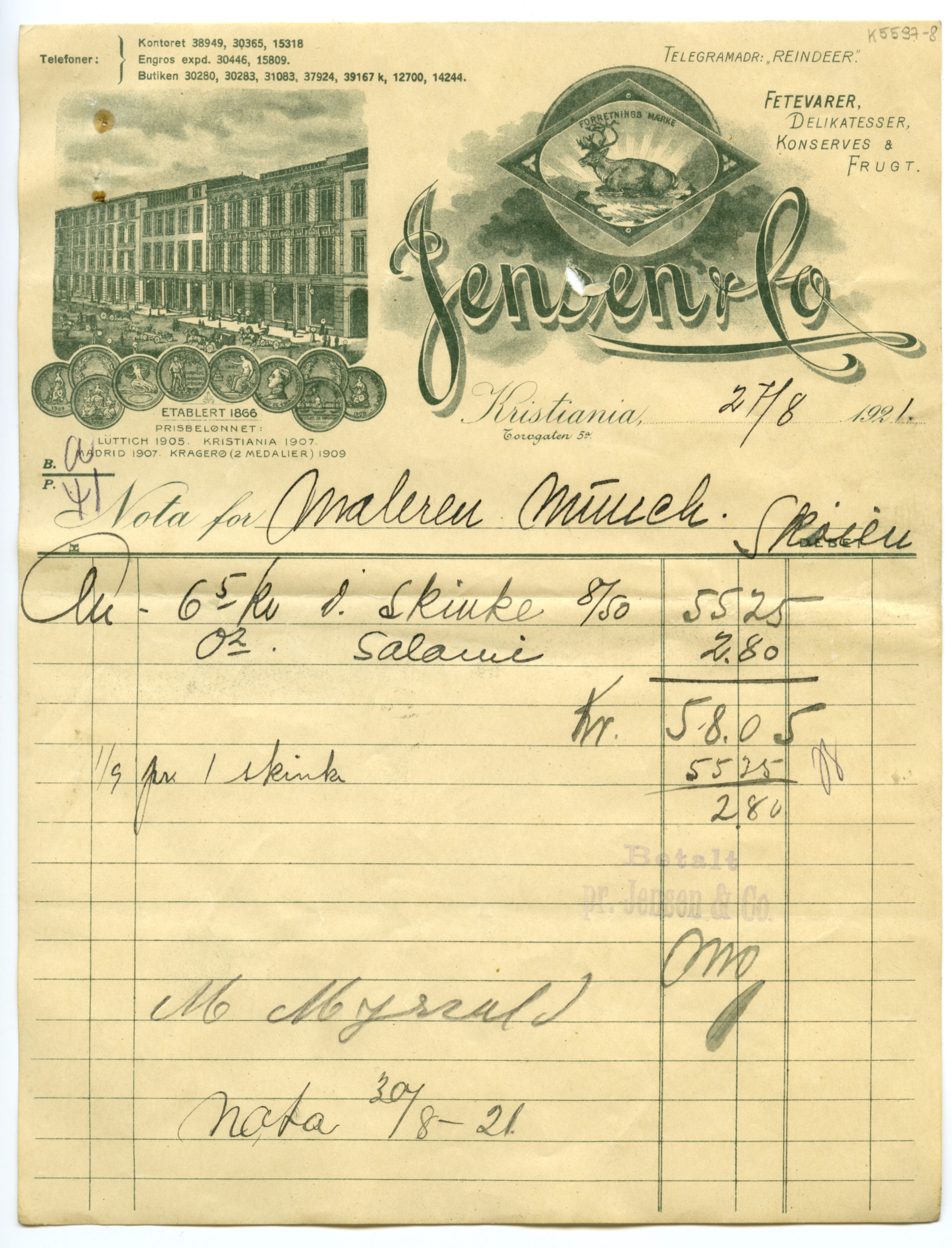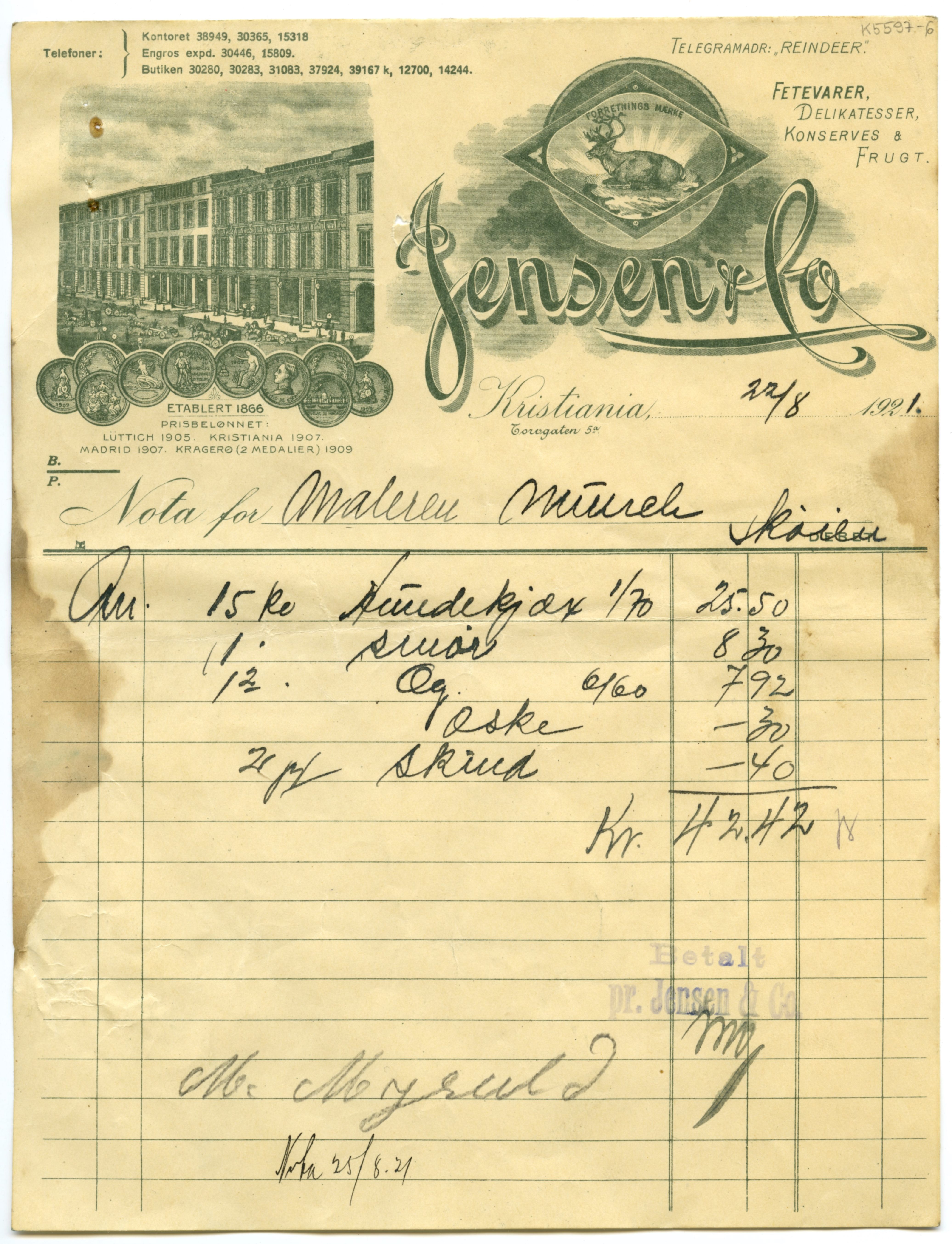 MM K 5597, Munchmuseet. Datert [??].[??].1921. Brev fra konserves- & frugt Jensen & Co Fetevarer. Delikatesser.