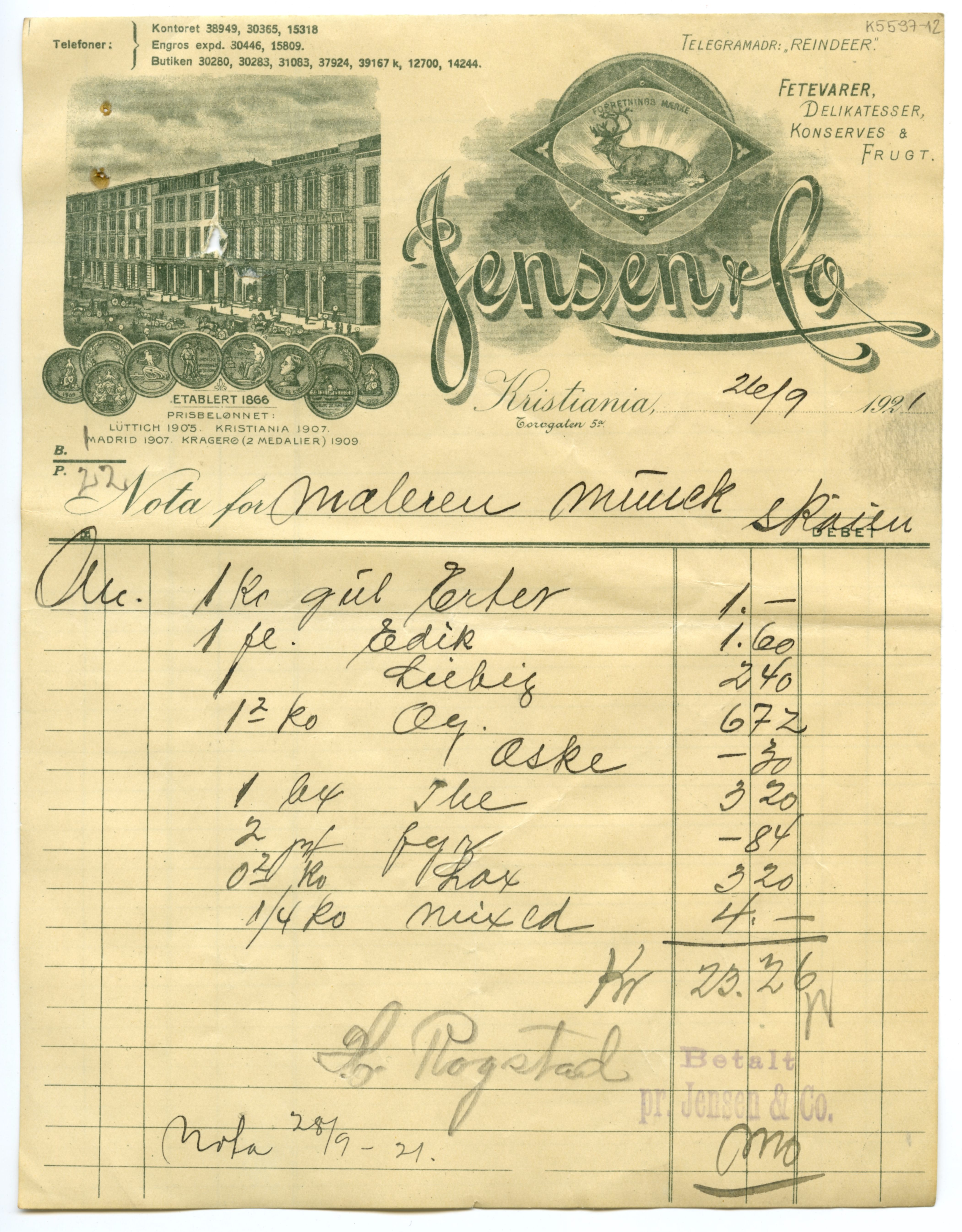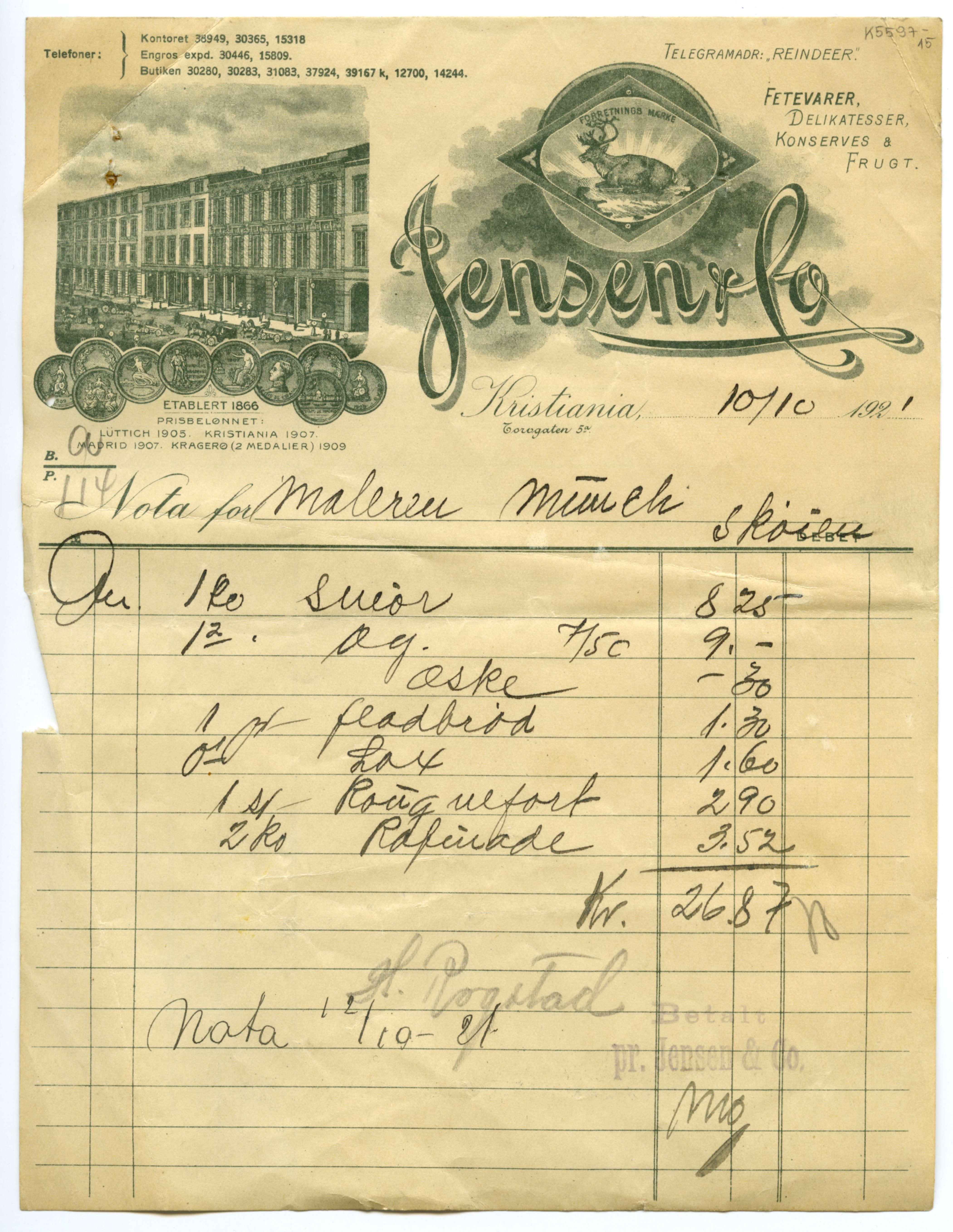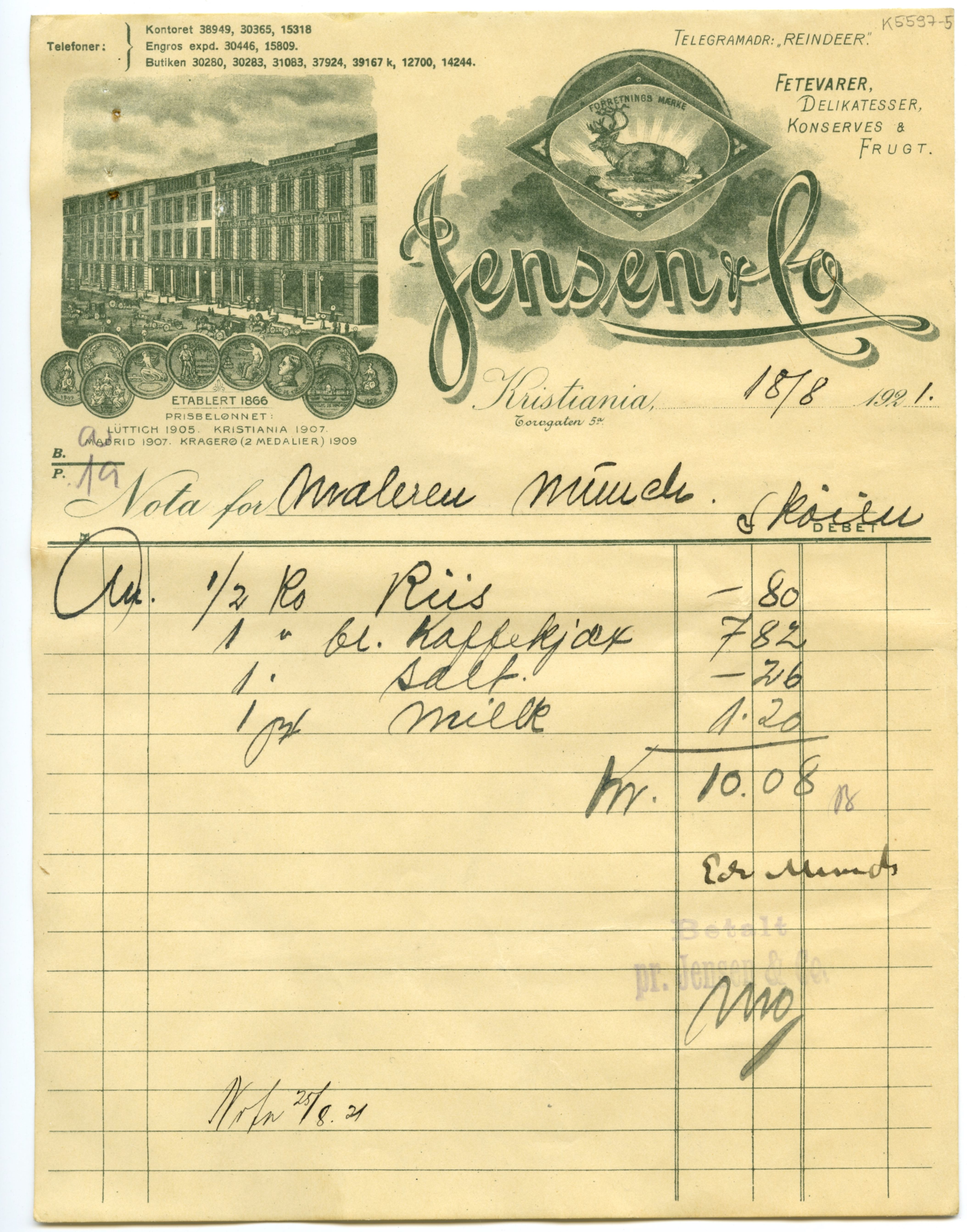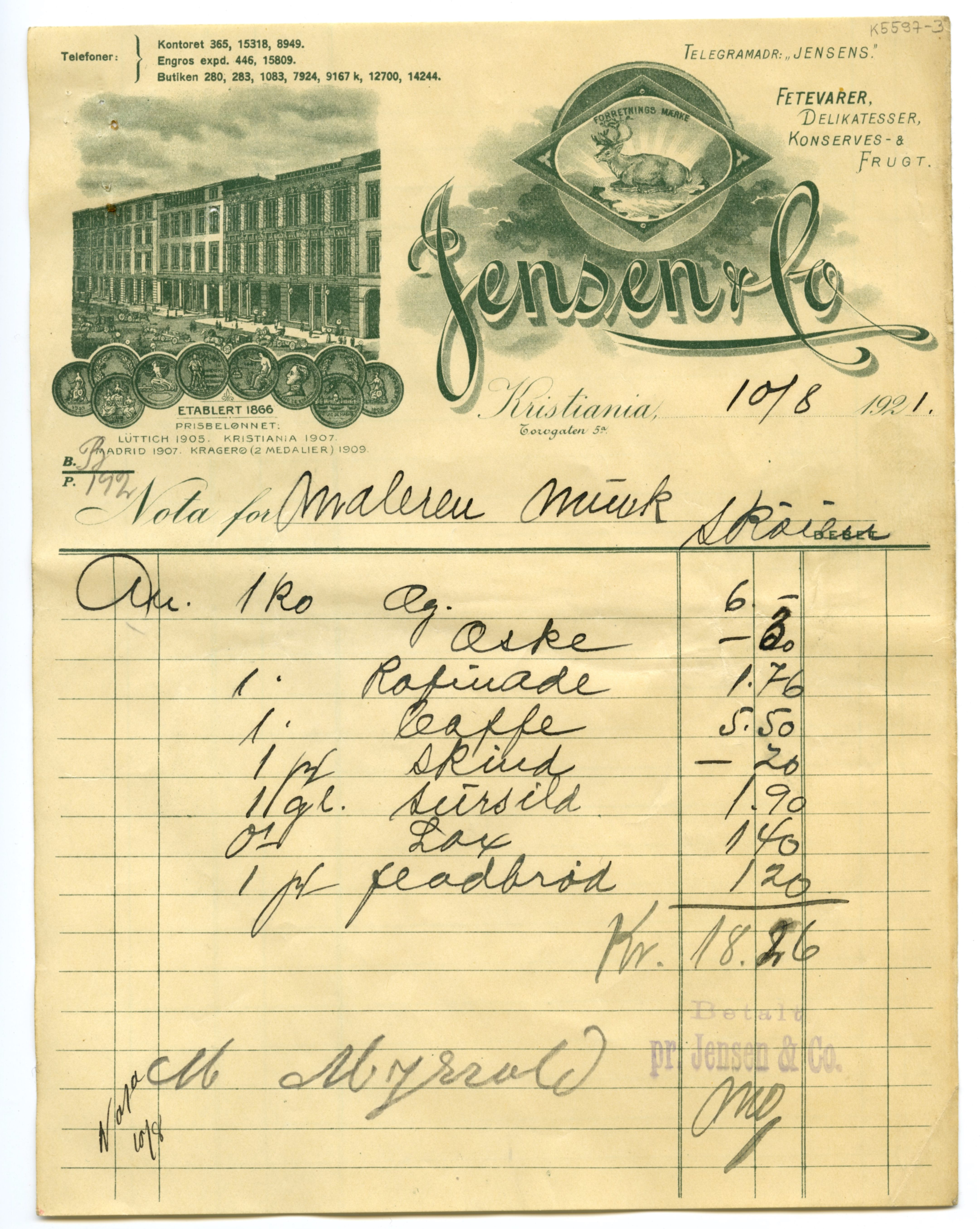 MM K 5597, Munchmuseet. Datert [??].[??].1921. Brev fra konserves- & frugt Jensen & Co Fetevarer. Delikatesser.