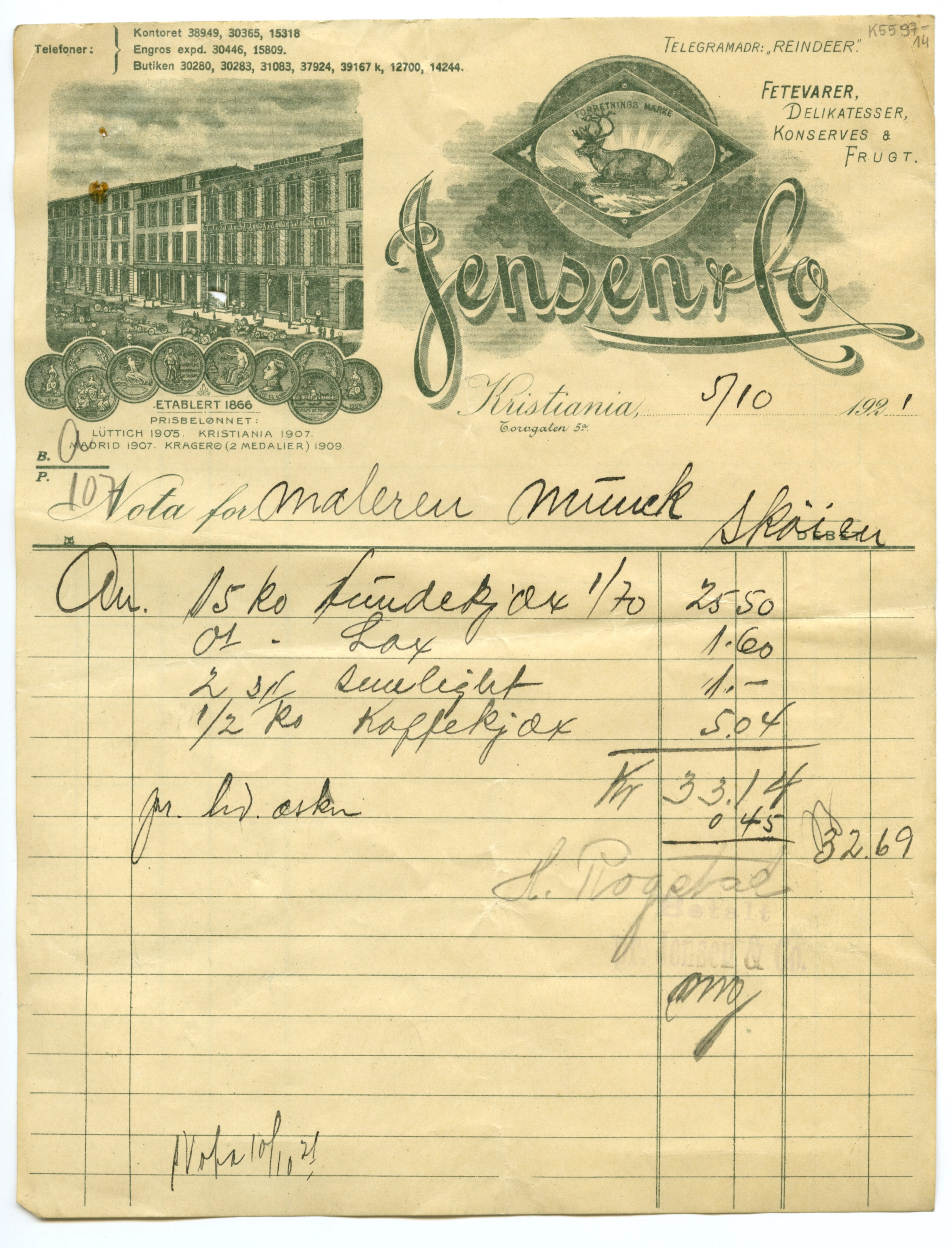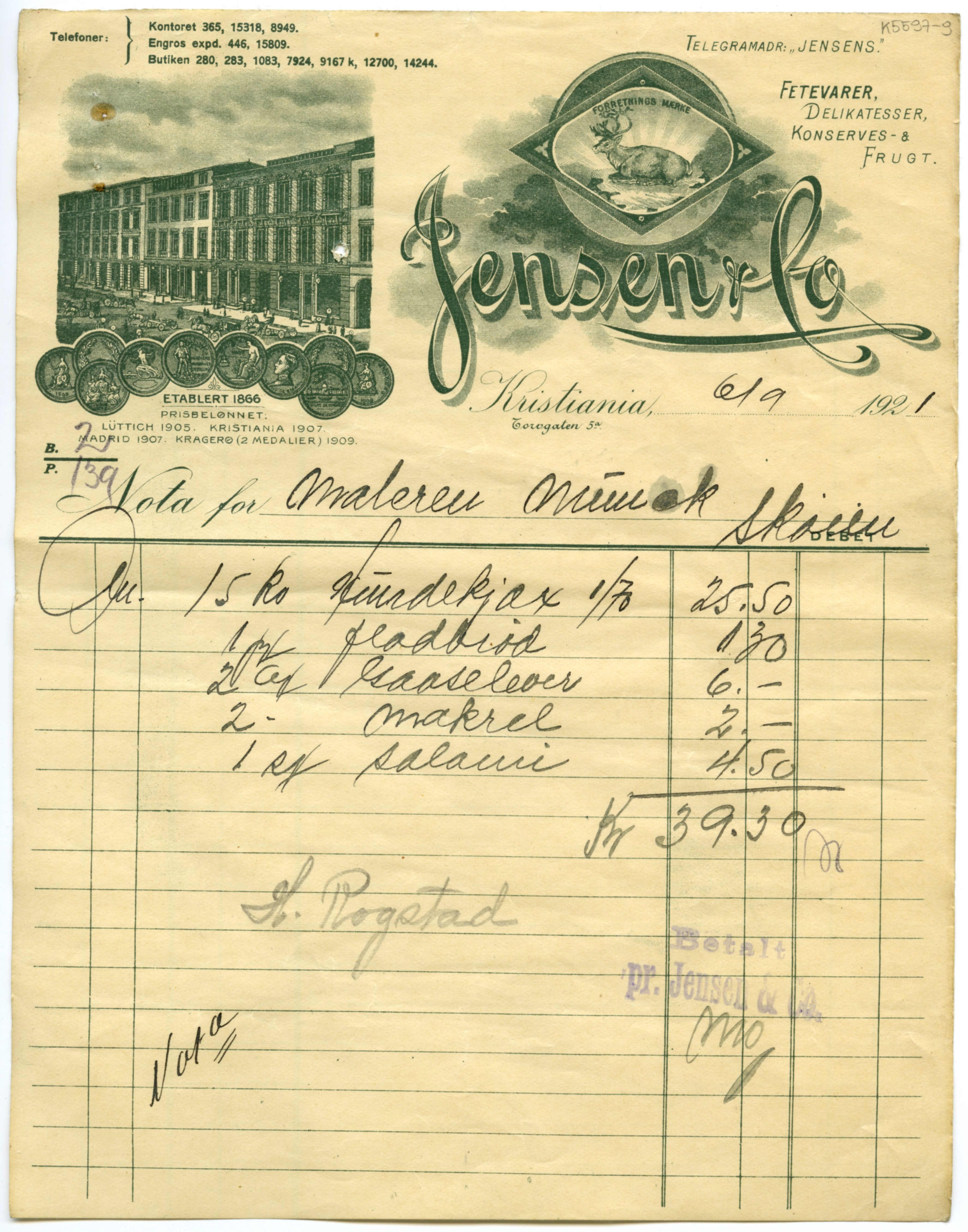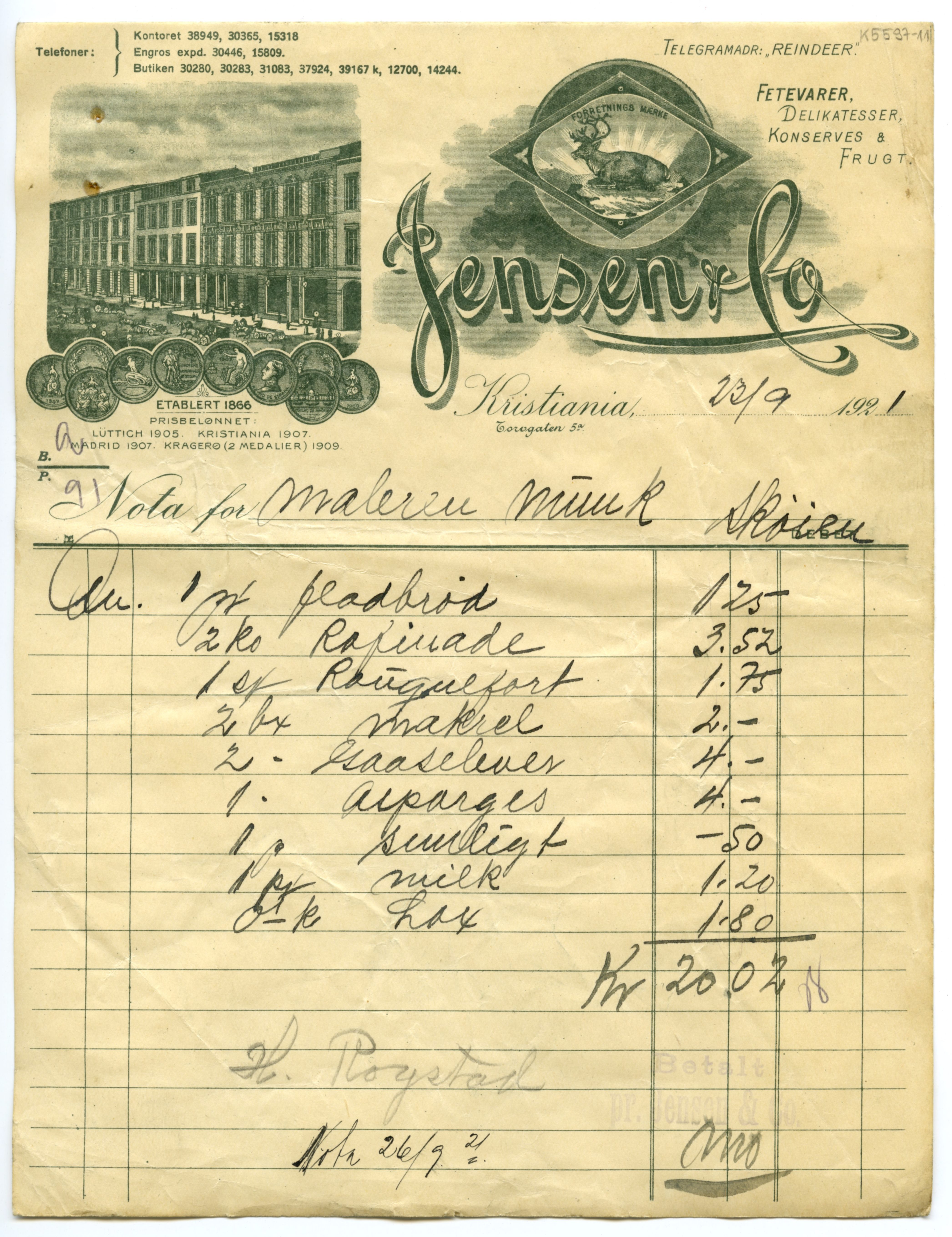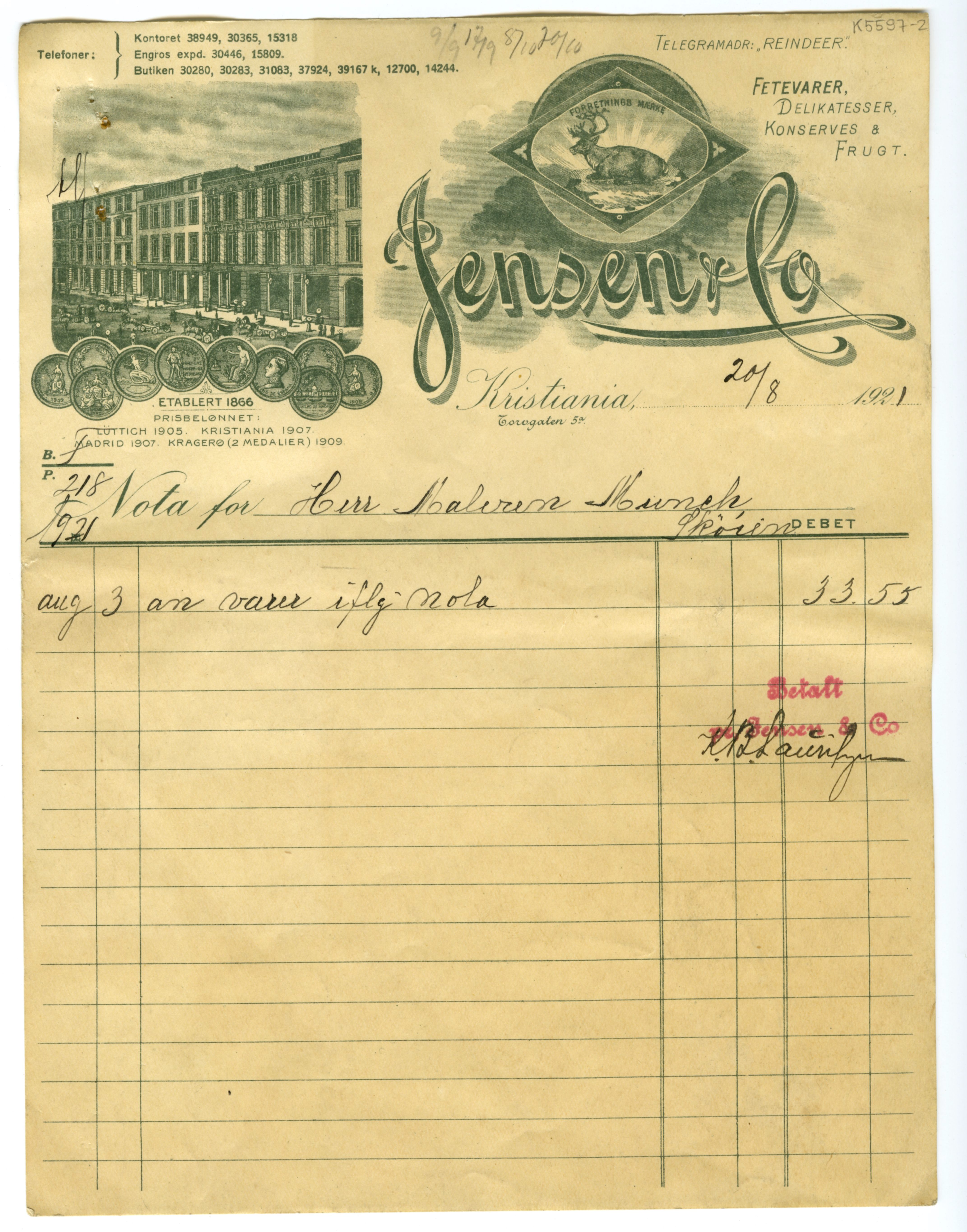 MM K 5597, Munchmuseet. Datert [??].[??].1921. Brev fra konserves- & frugt Jensen & Co Fetevarer. Delikatesser.