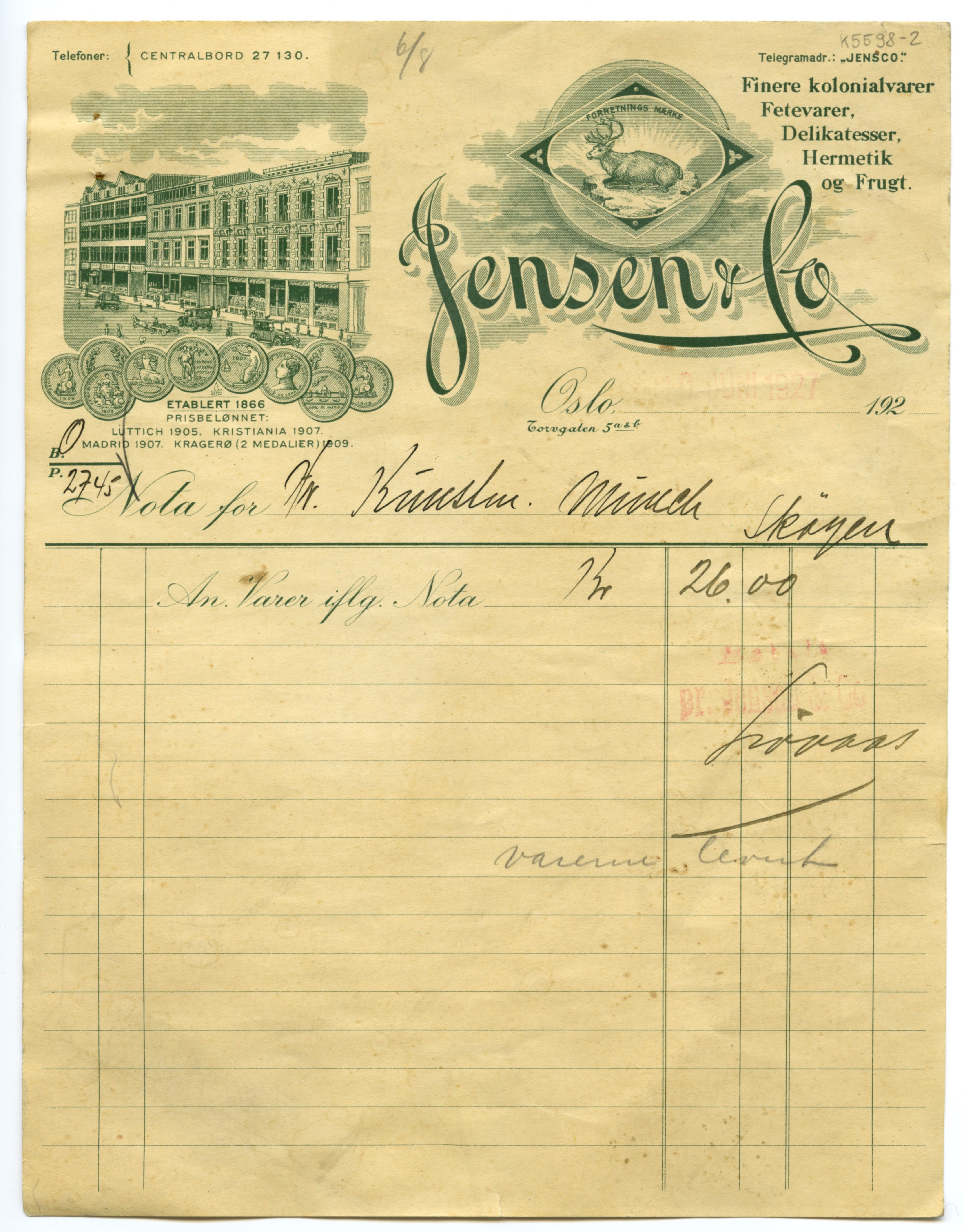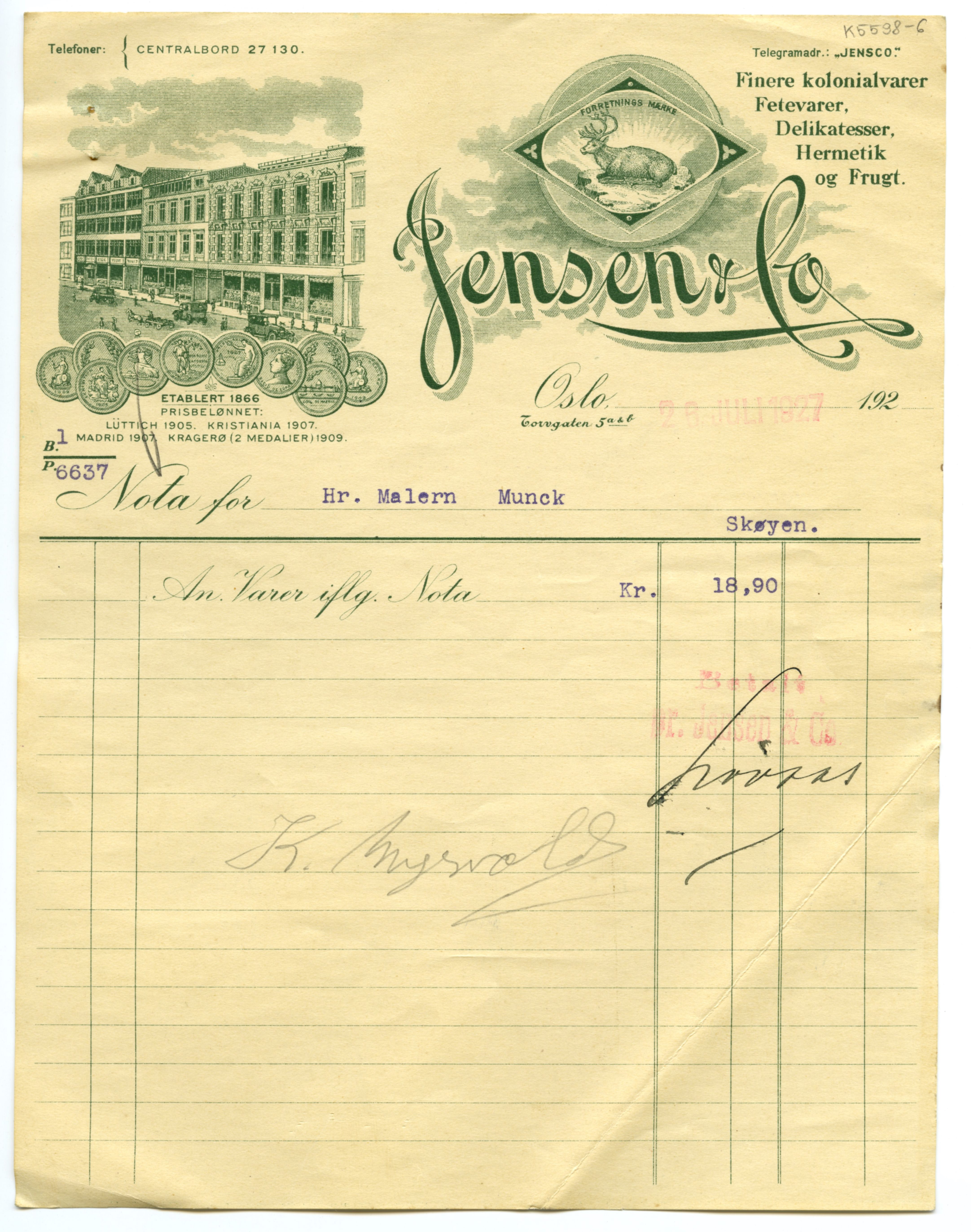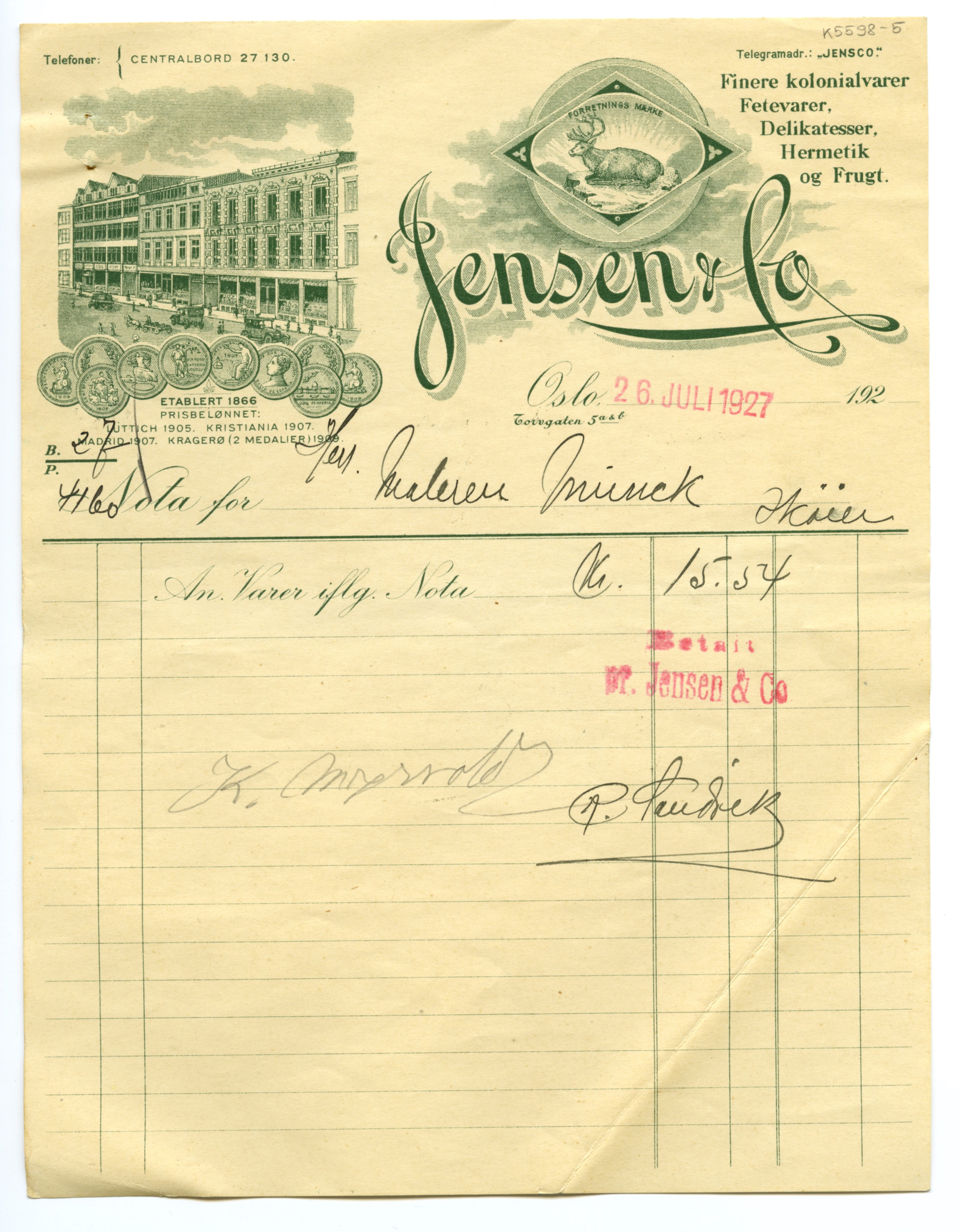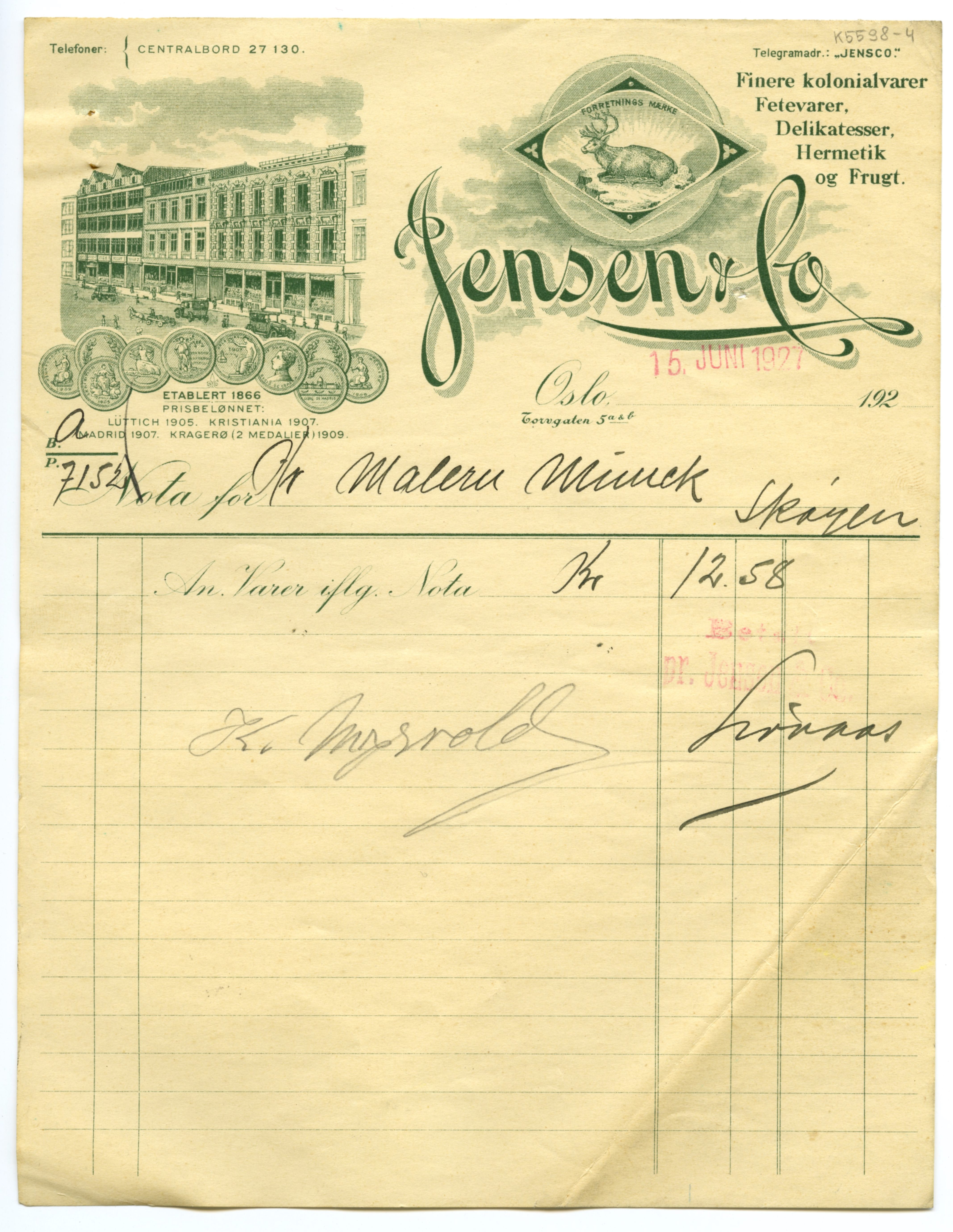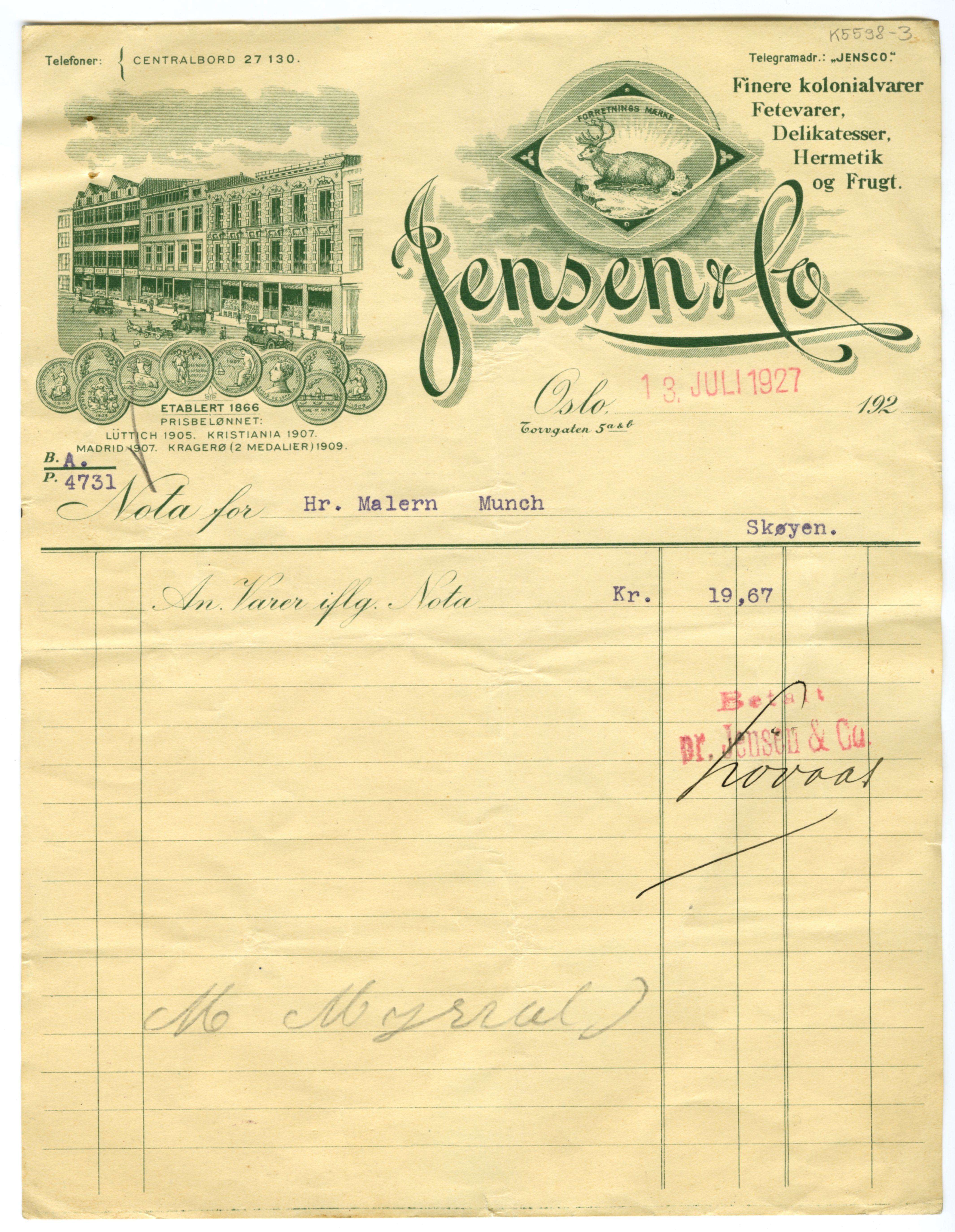 MM K 5598, Munchmuseet. Datert [??].[??].1927. Brev fra konserves- & frugt Jensen & Co Fetevarer. Delikatesser.