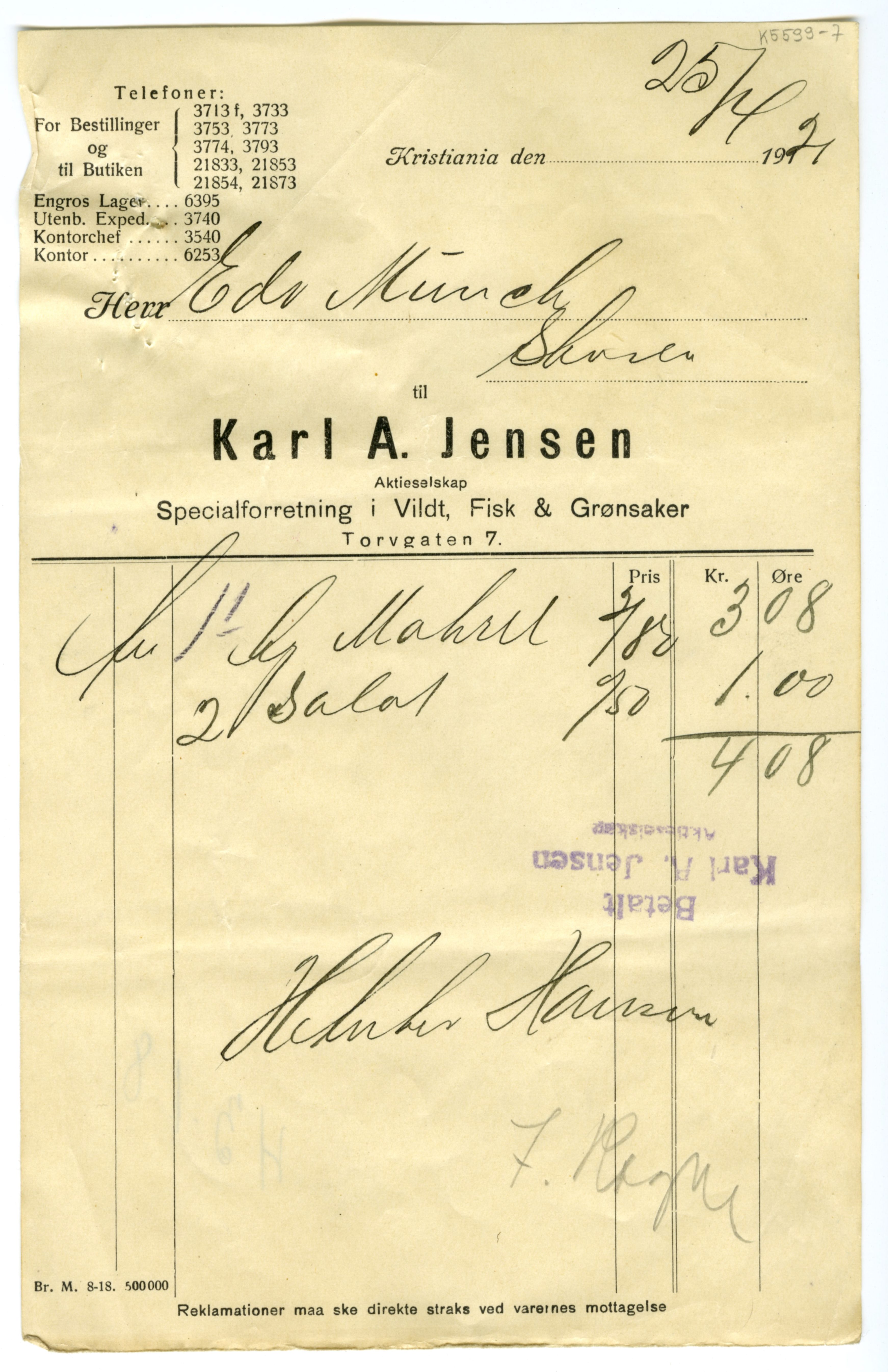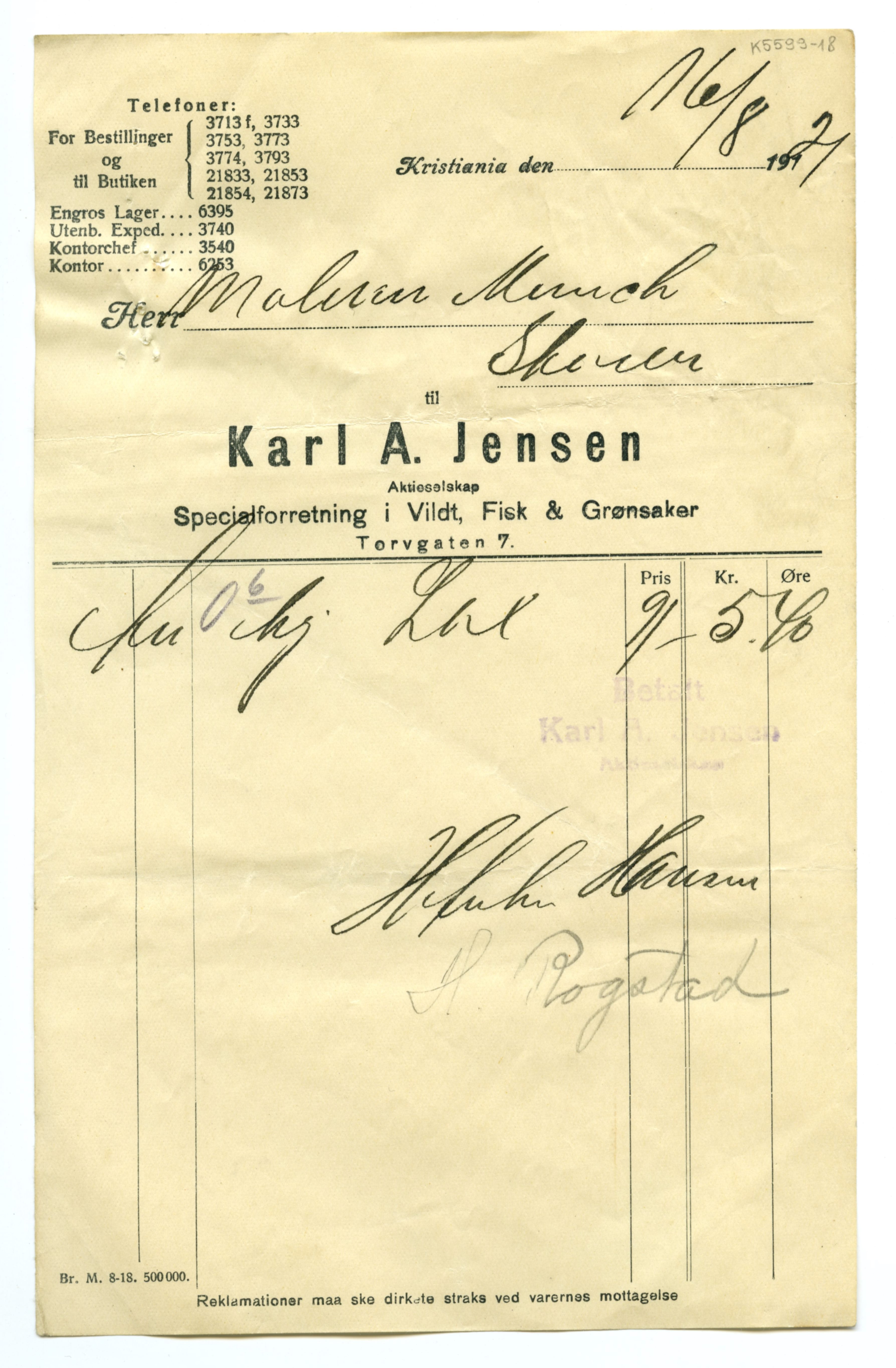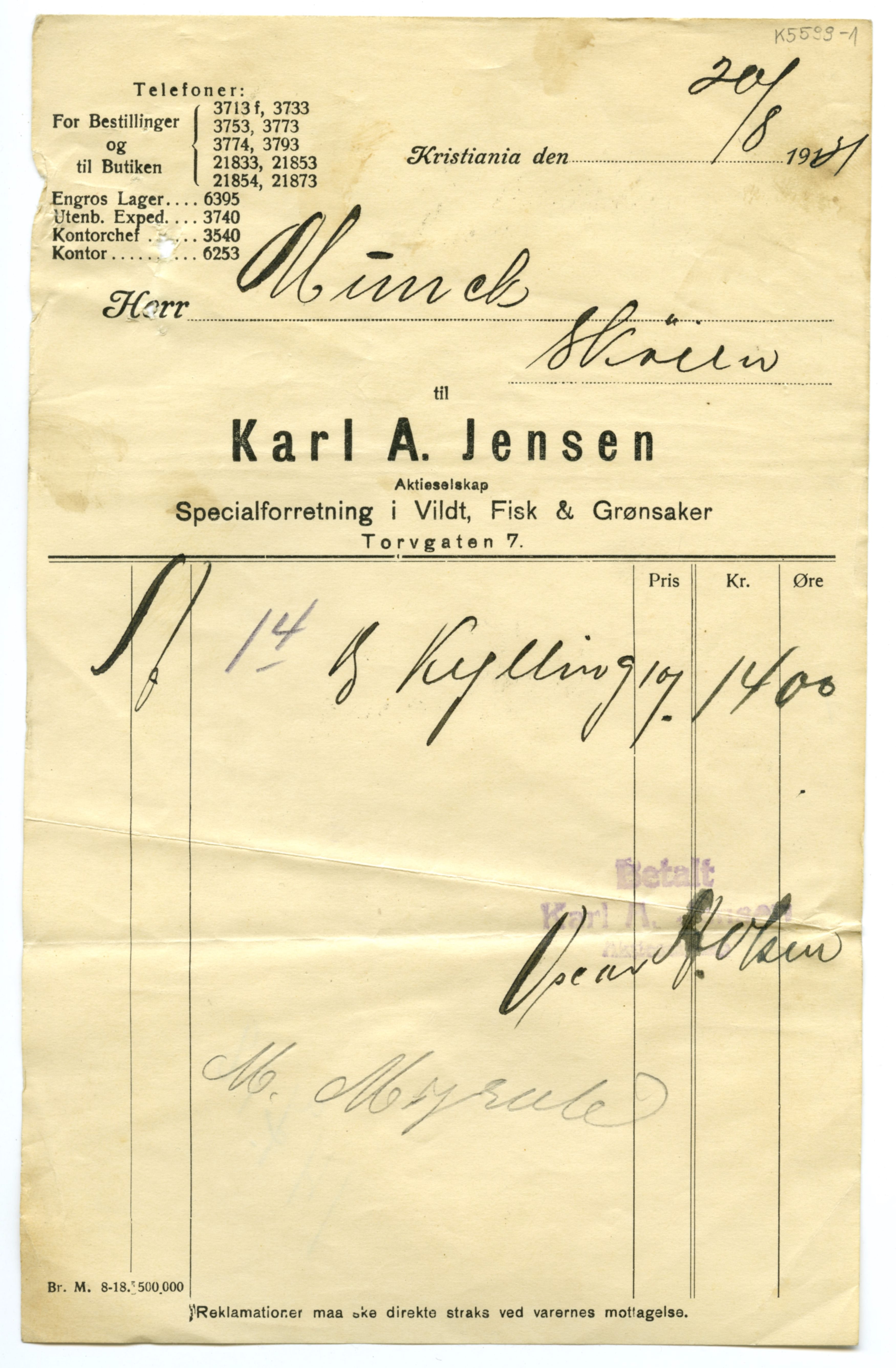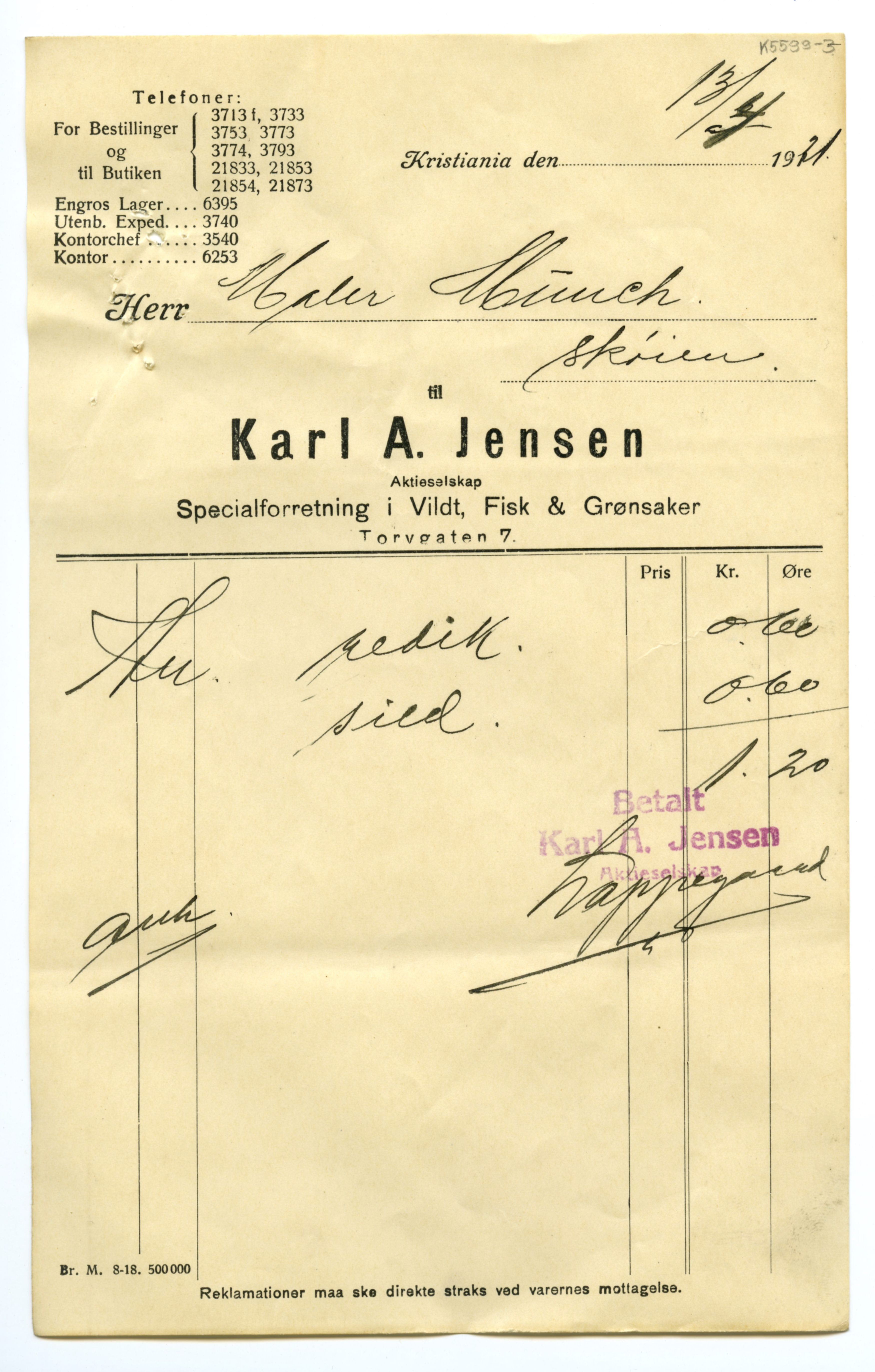 MM K 5599, Munchmuseet. Datert 20.08.1921. Brev fra Fisk & Grønsaker Karl A. Jensen Aktieselskap Specialforretning i Vildt.