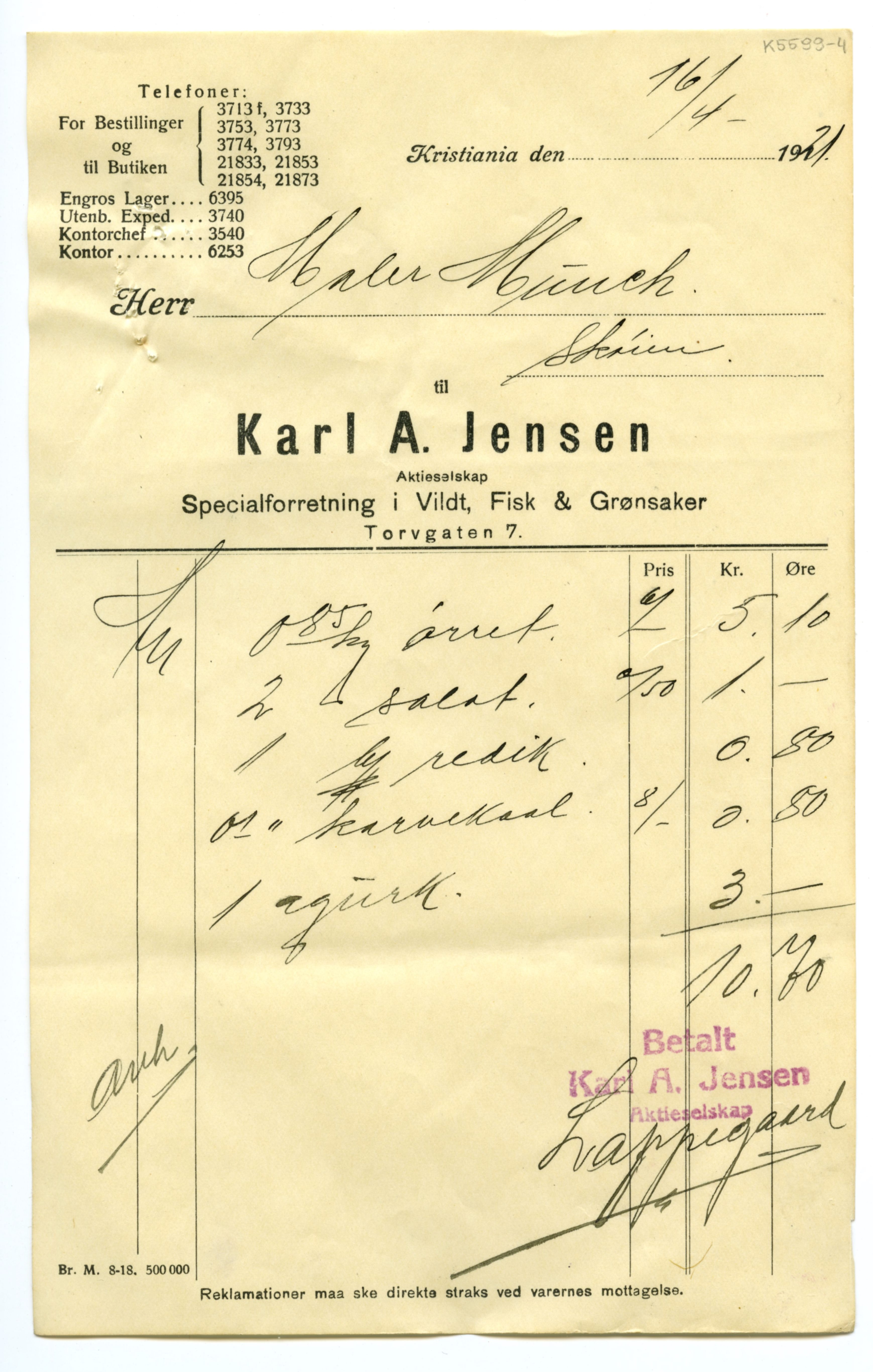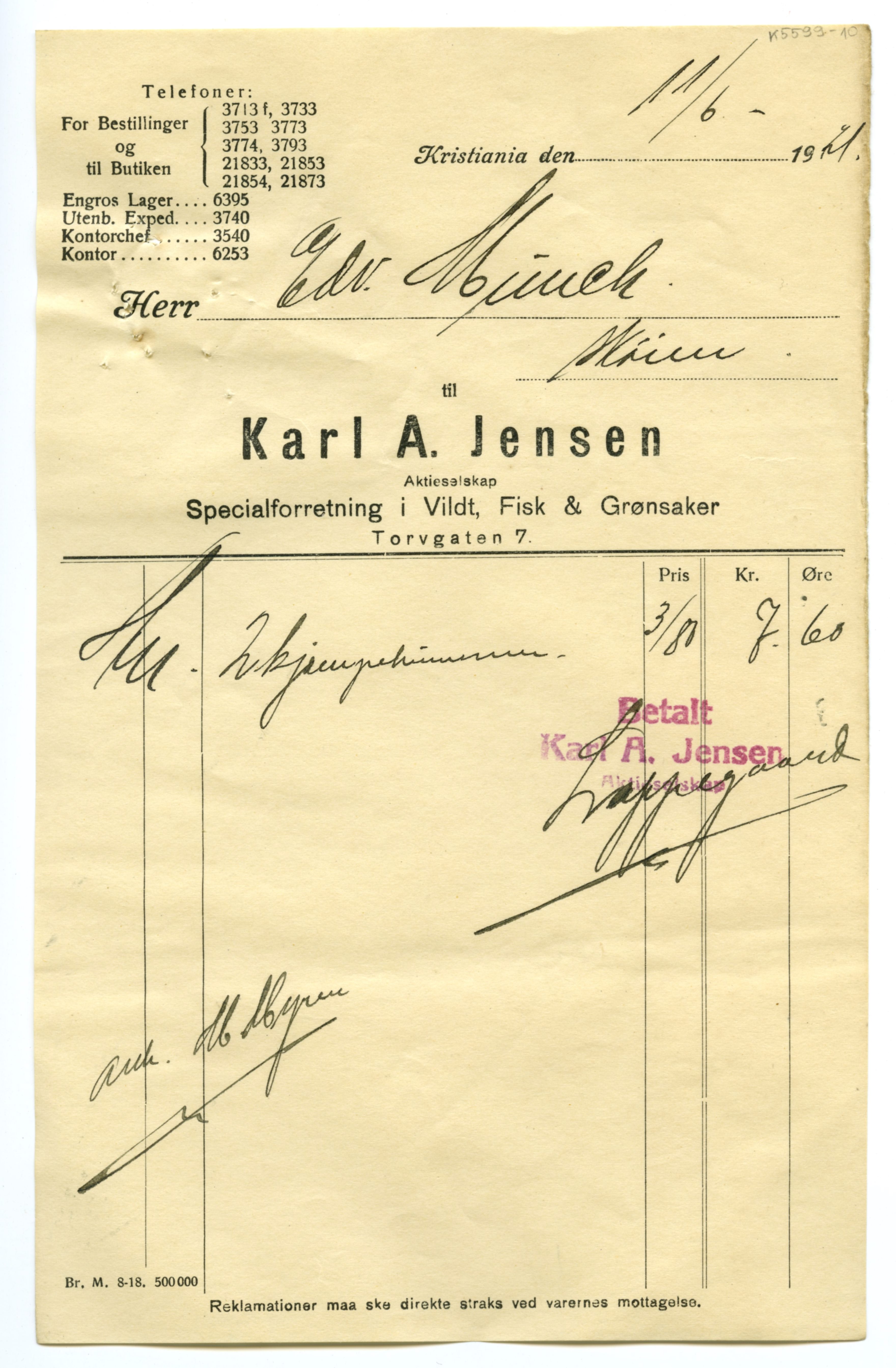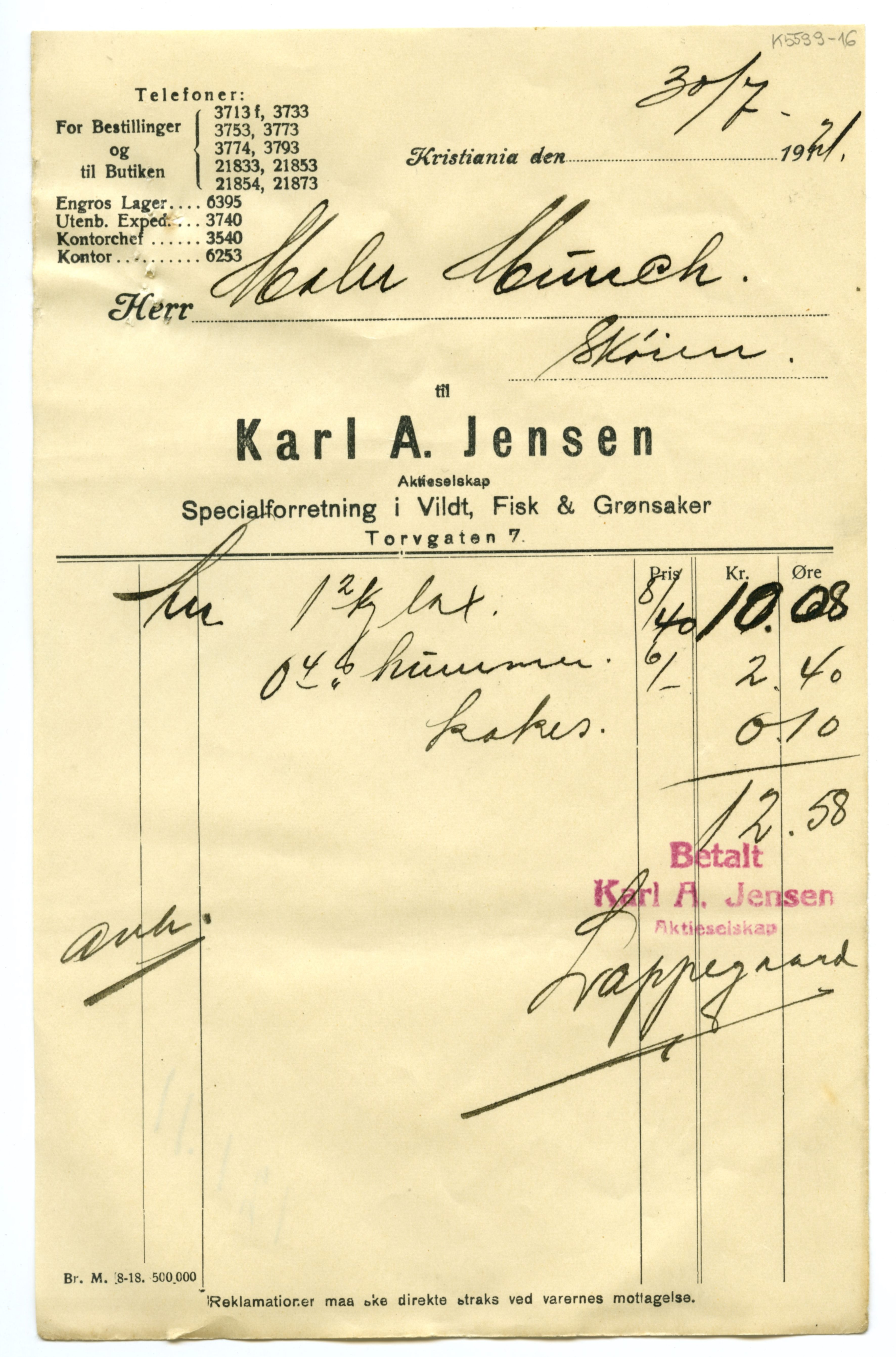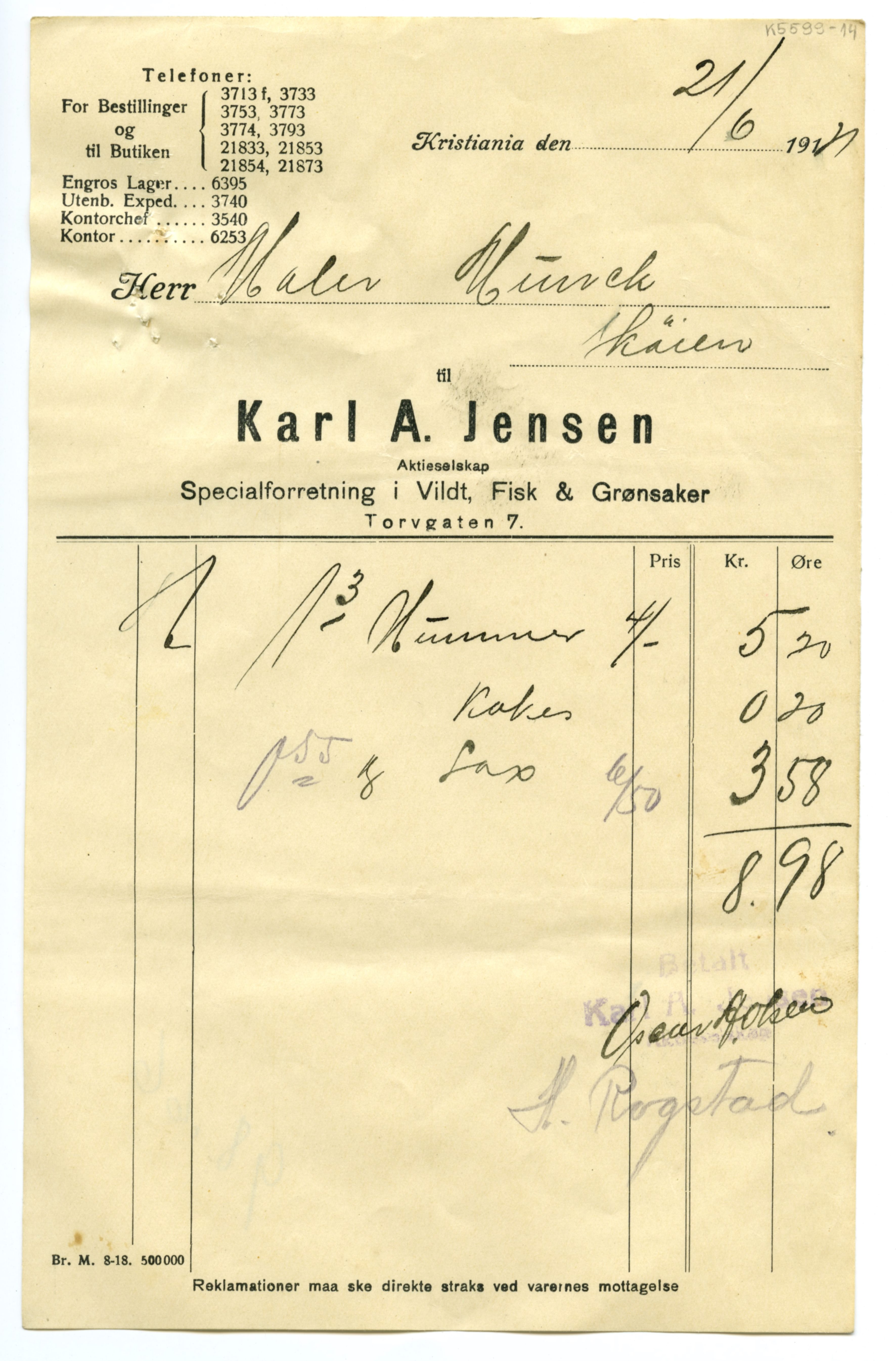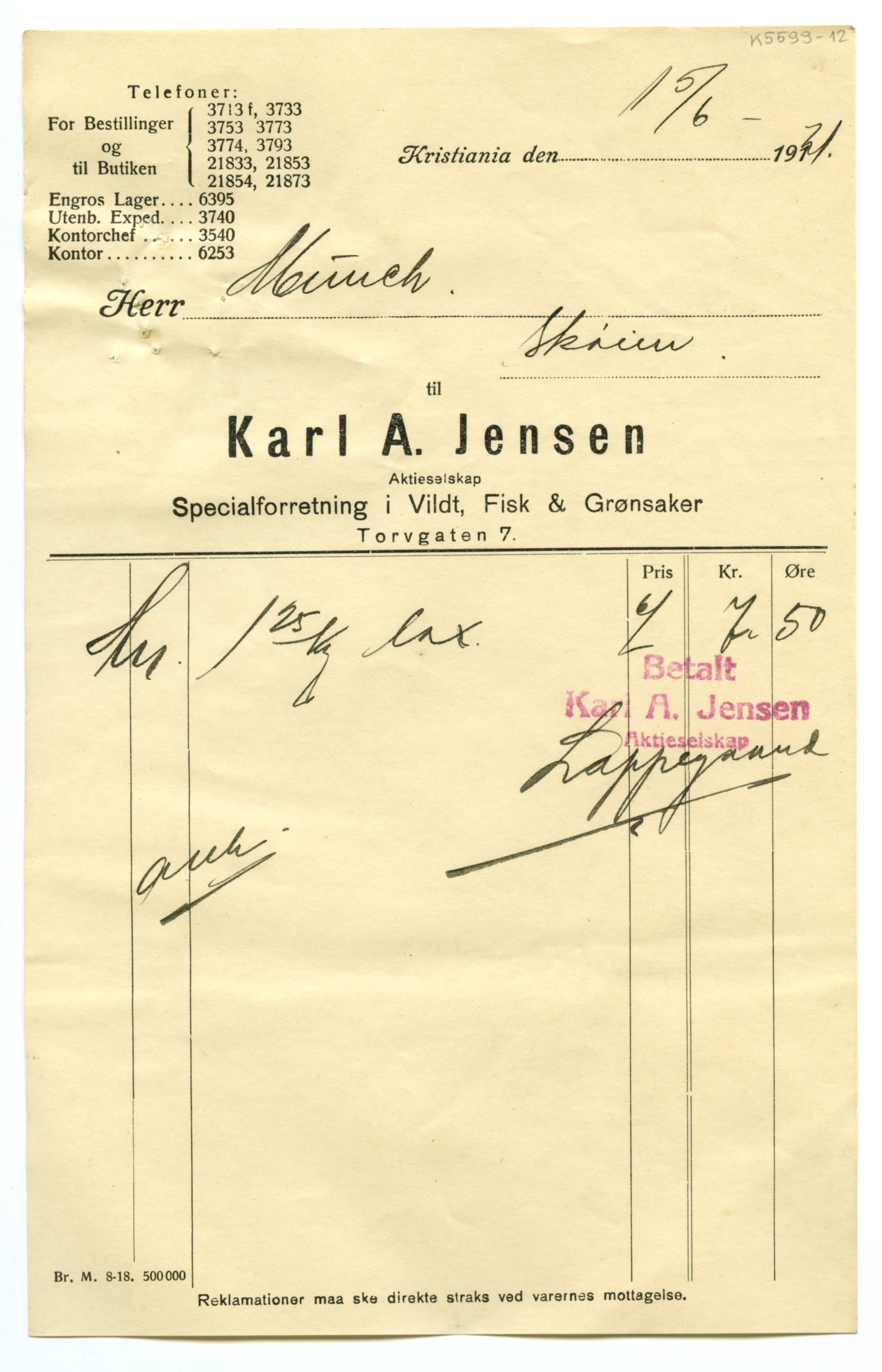 MM K 5599, Munchmuseet. Datert 20.08.1921. Brev fra Fisk & Grønsaker Karl A. Jensen Aktieselskap Specialforretning i Vildt.