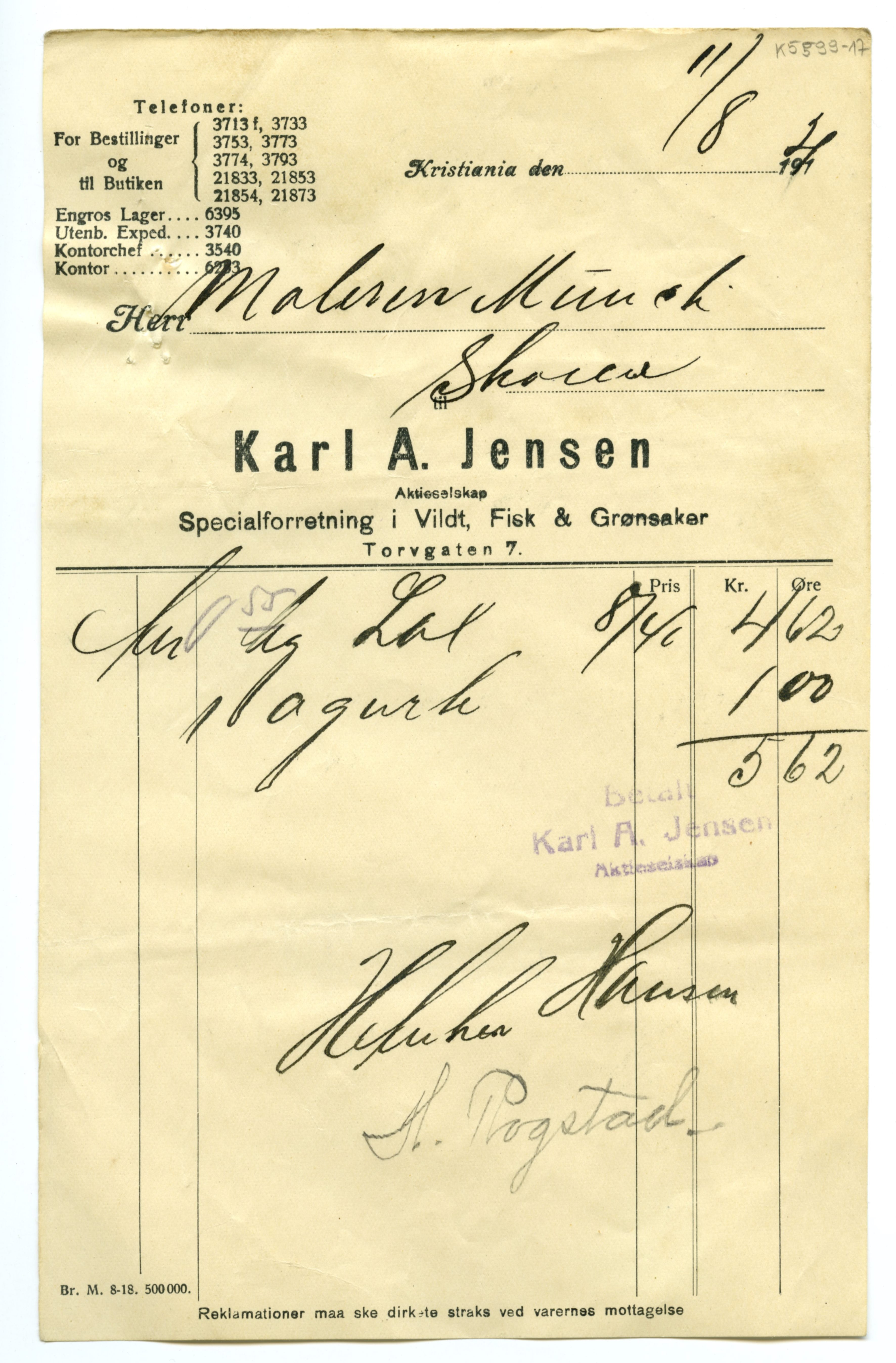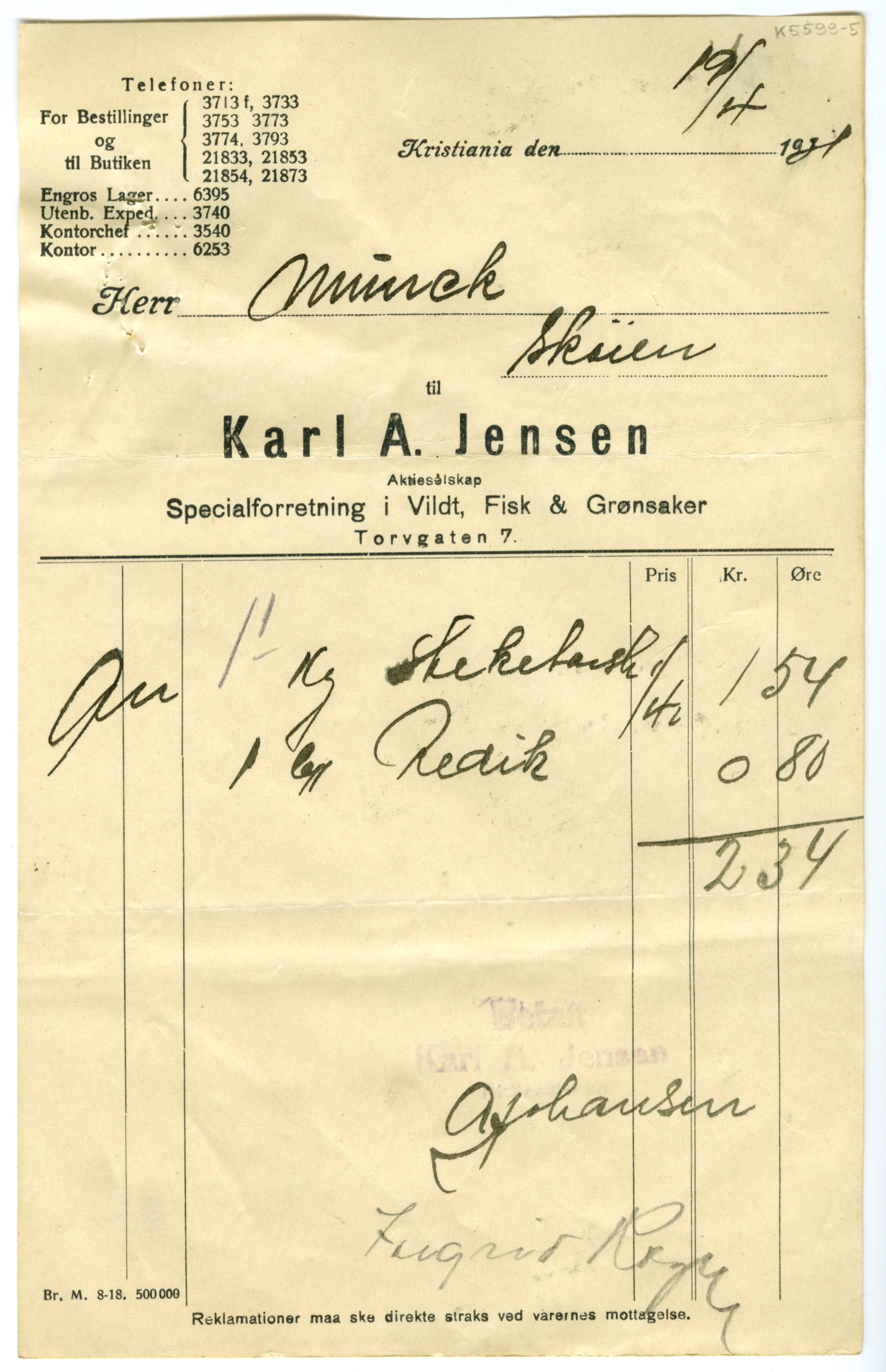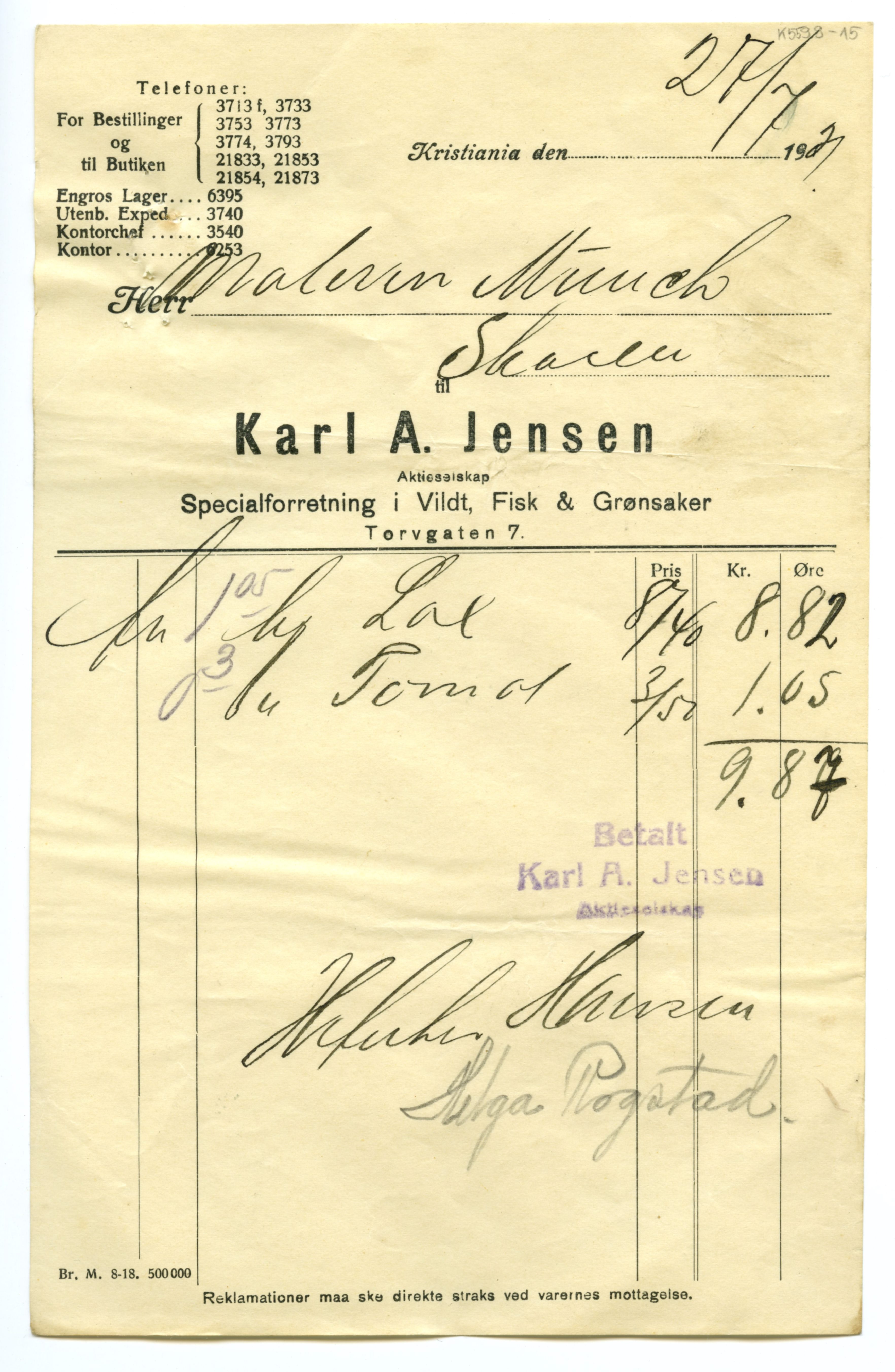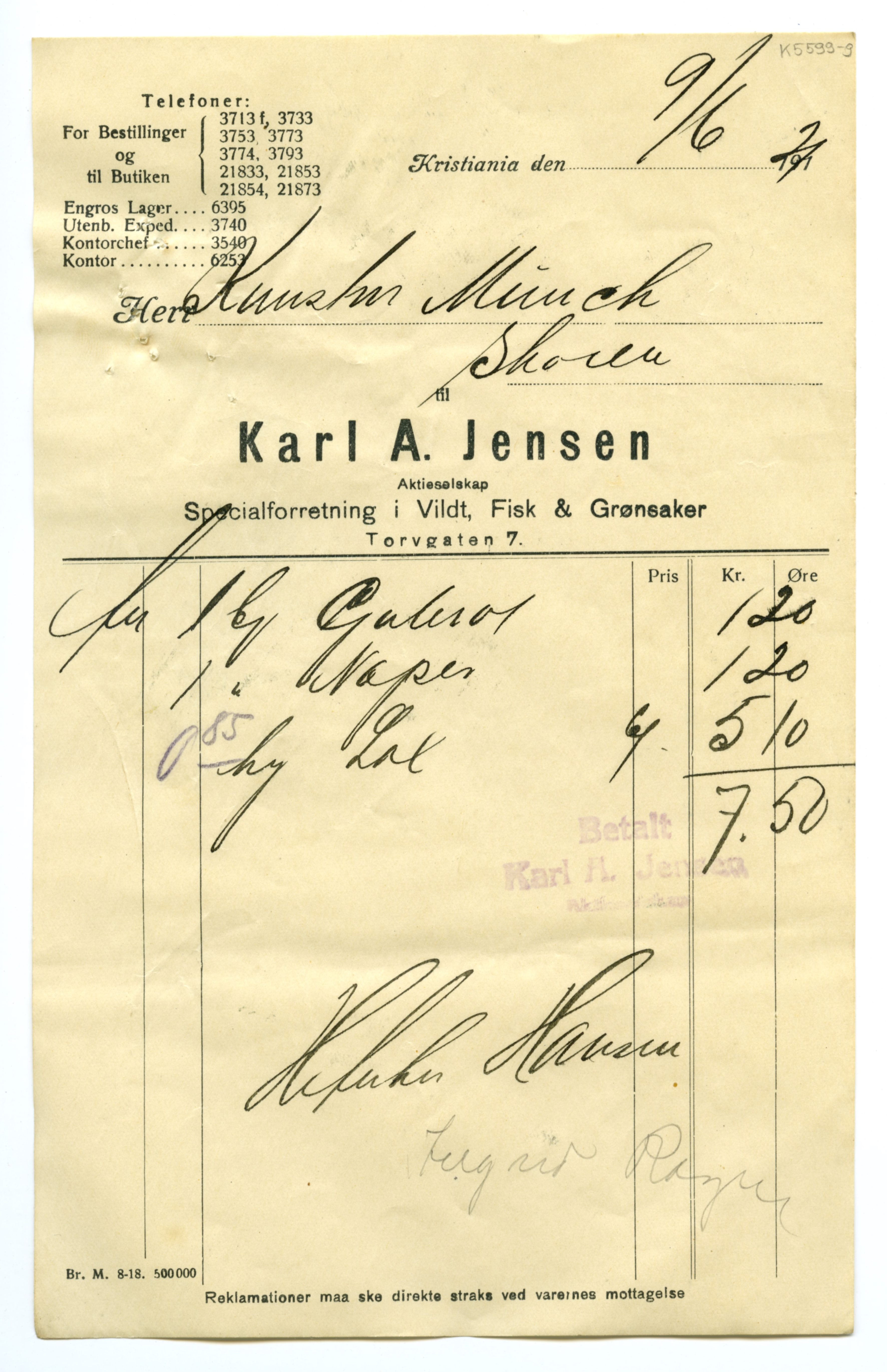 MM K 5599, Munchmuseet. Datert 20.08.1921. Brev fra Fisk & Grønsaker Karl A. Jensen Aktieselskap Specialforretning i Vildt.