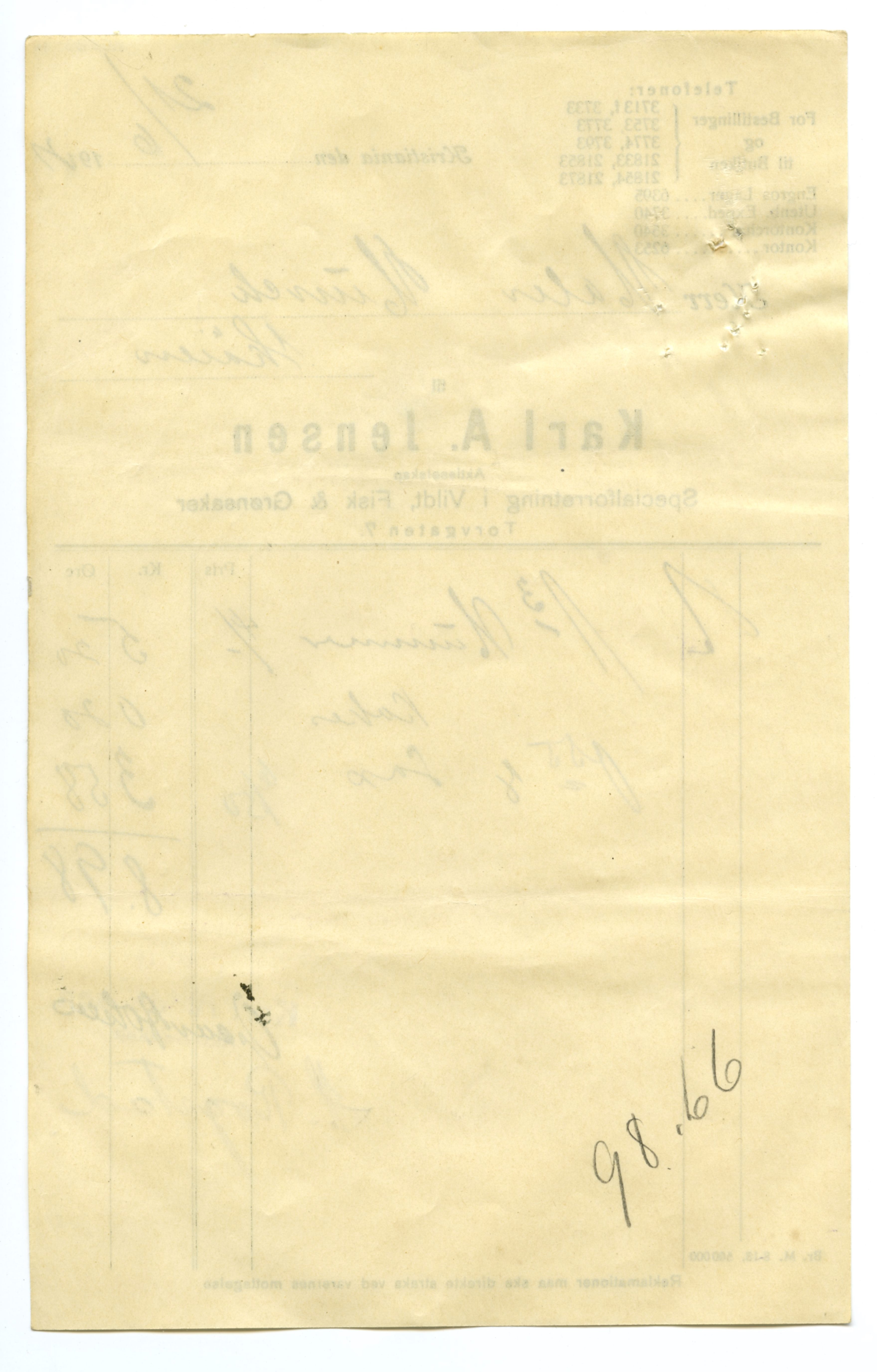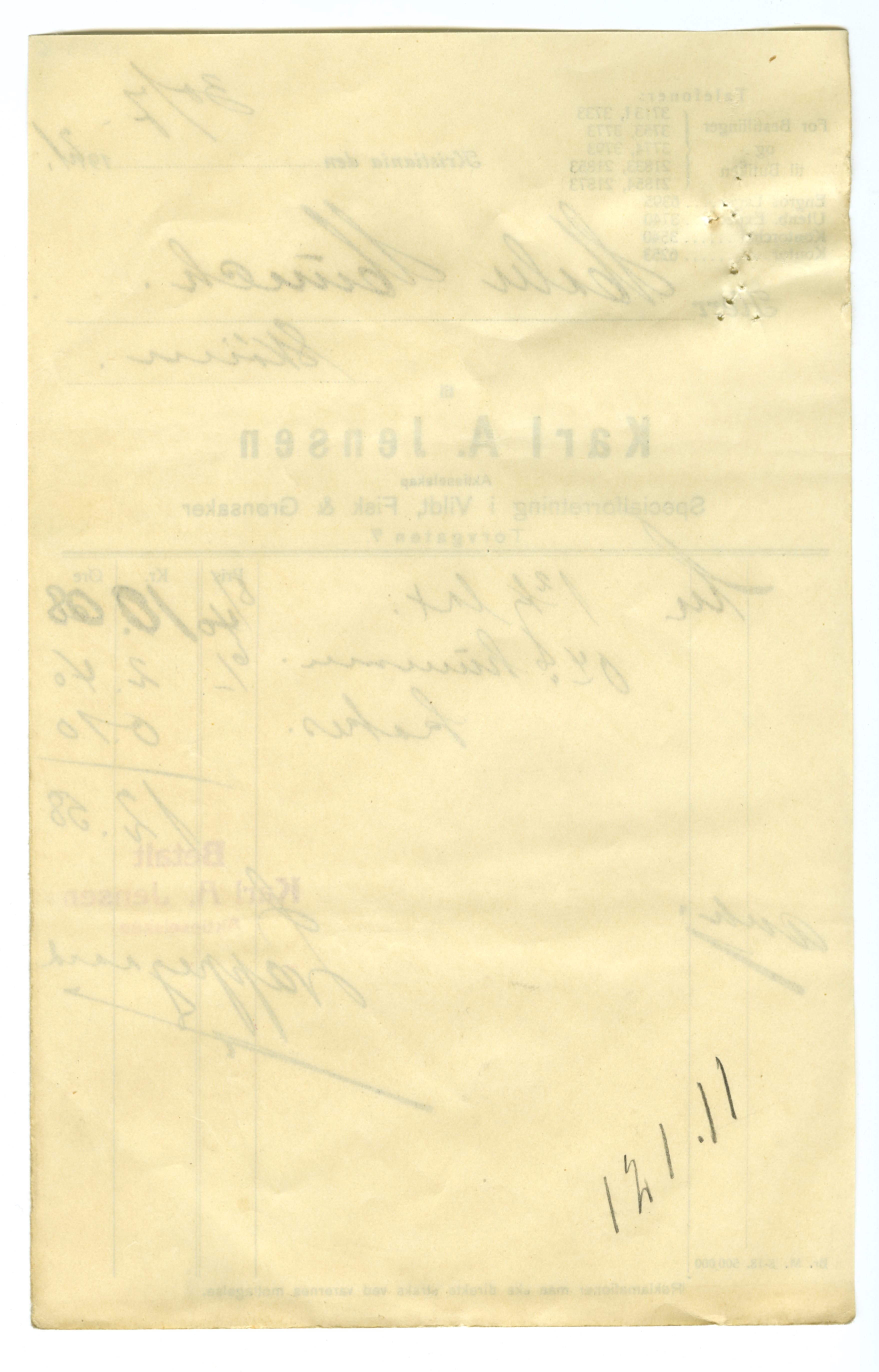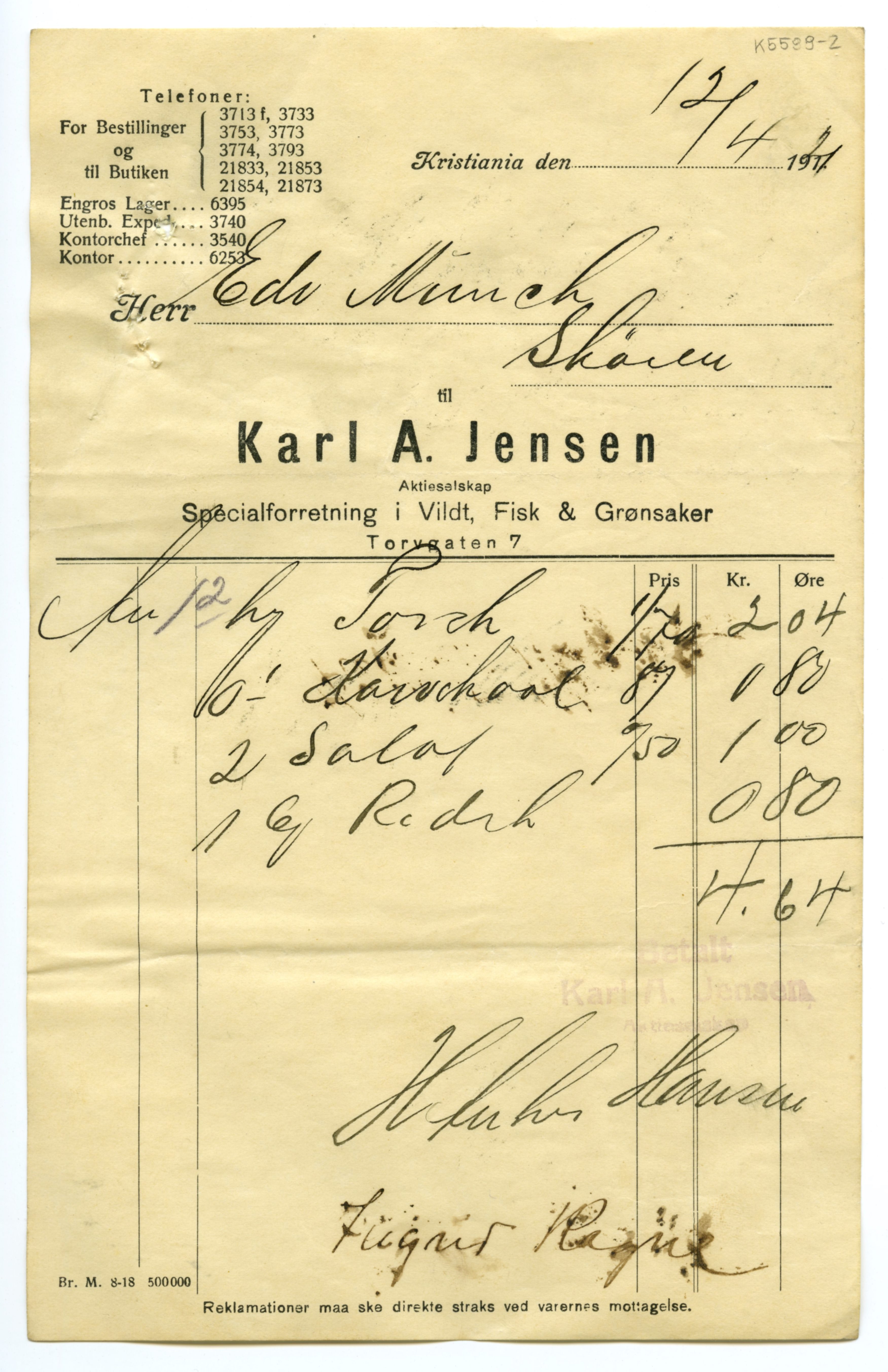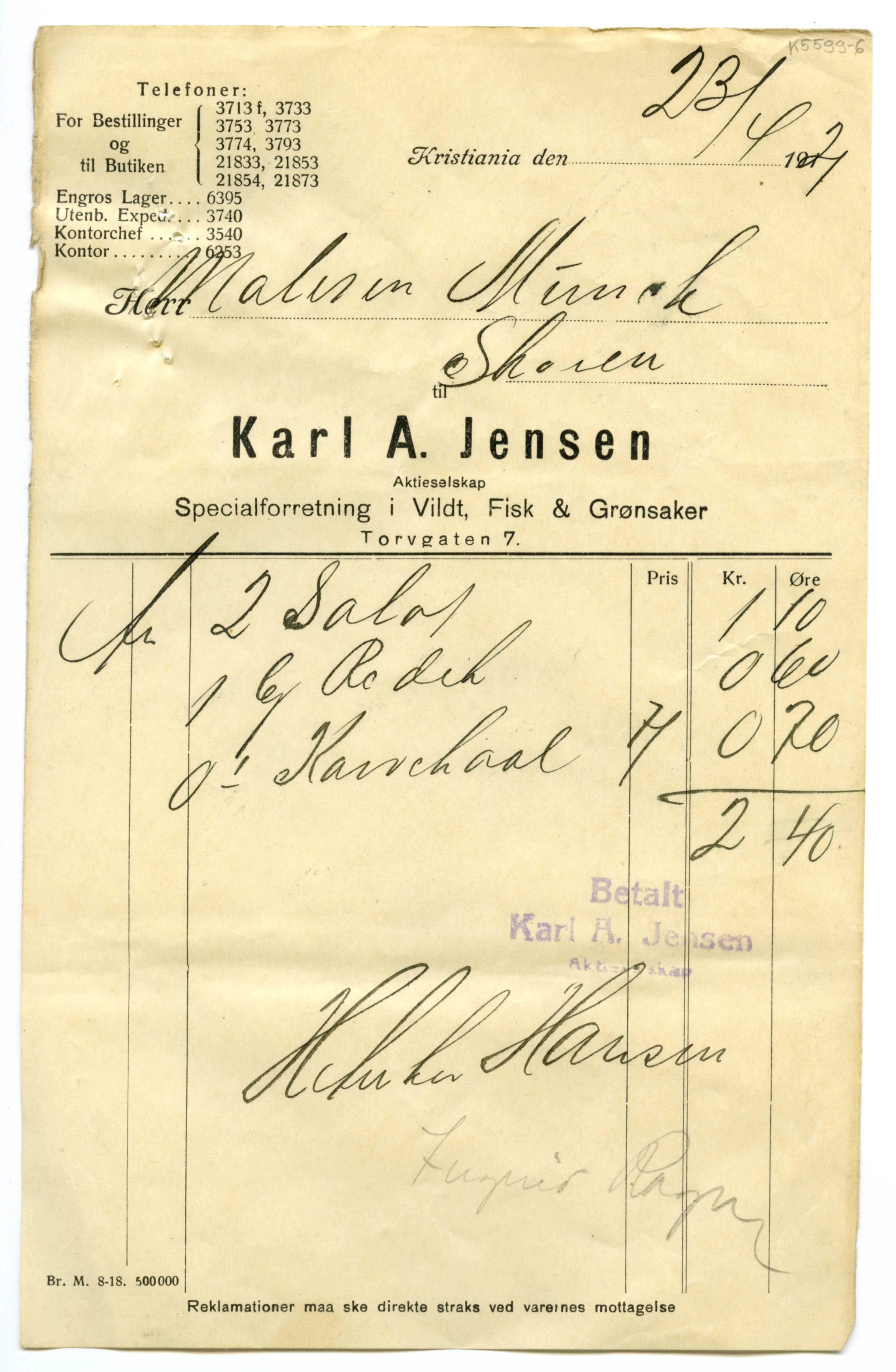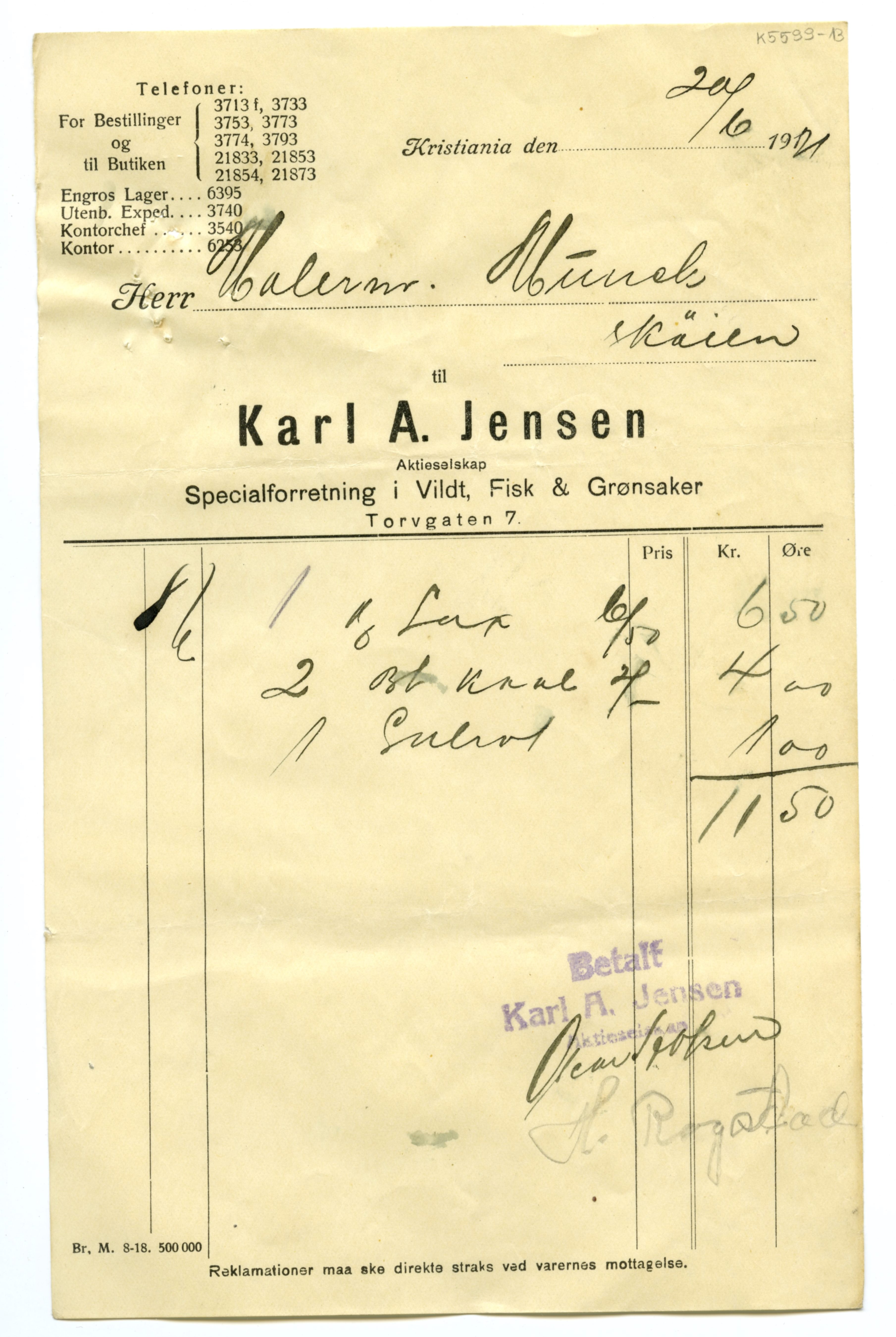 MM K 5599, Munchmuseet. Datert 20.08.1921. Brev fra Fisk & Grønsaker Karl A. Jensen Aktieselskap Specialforretning i Vildt.