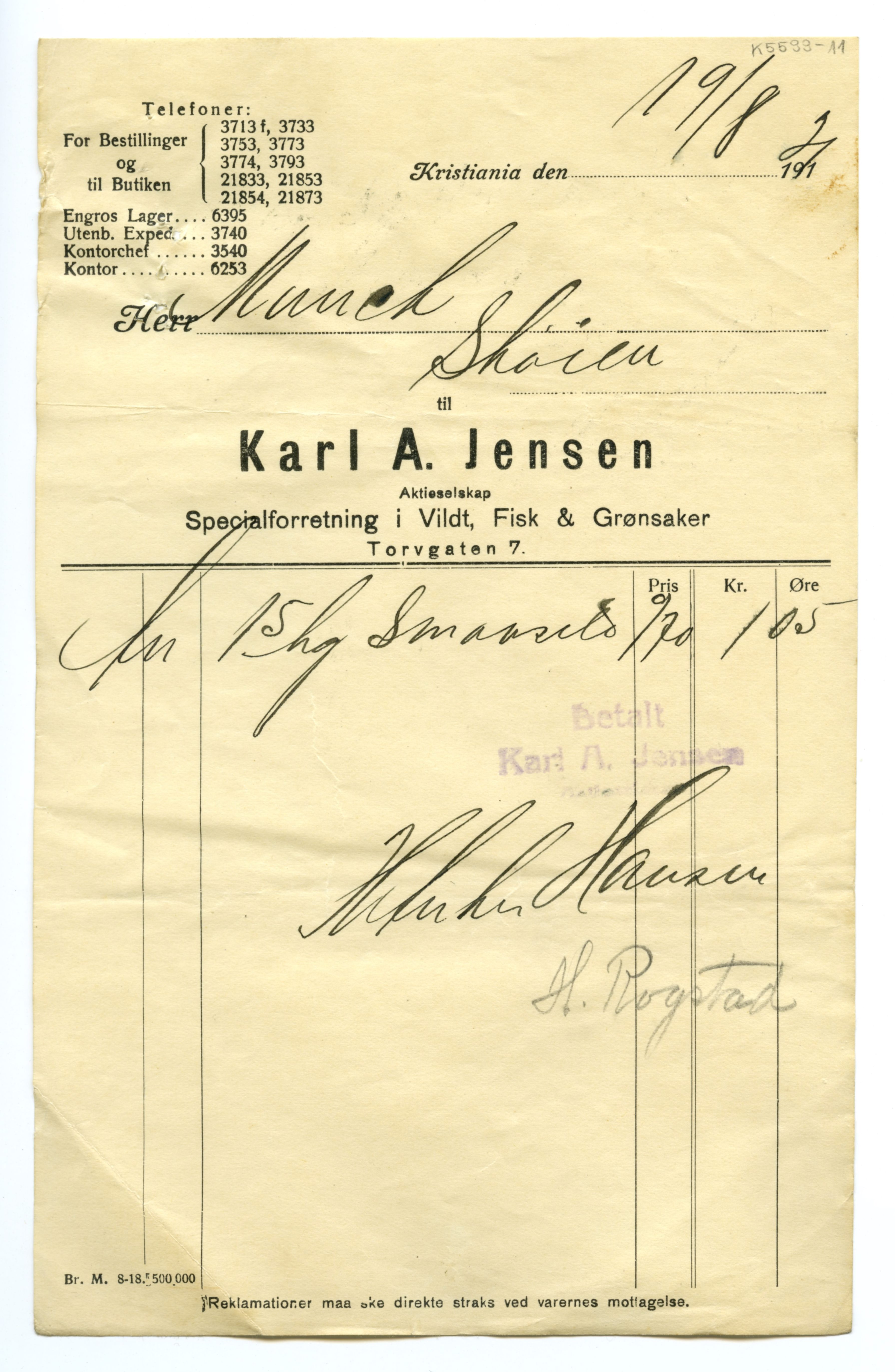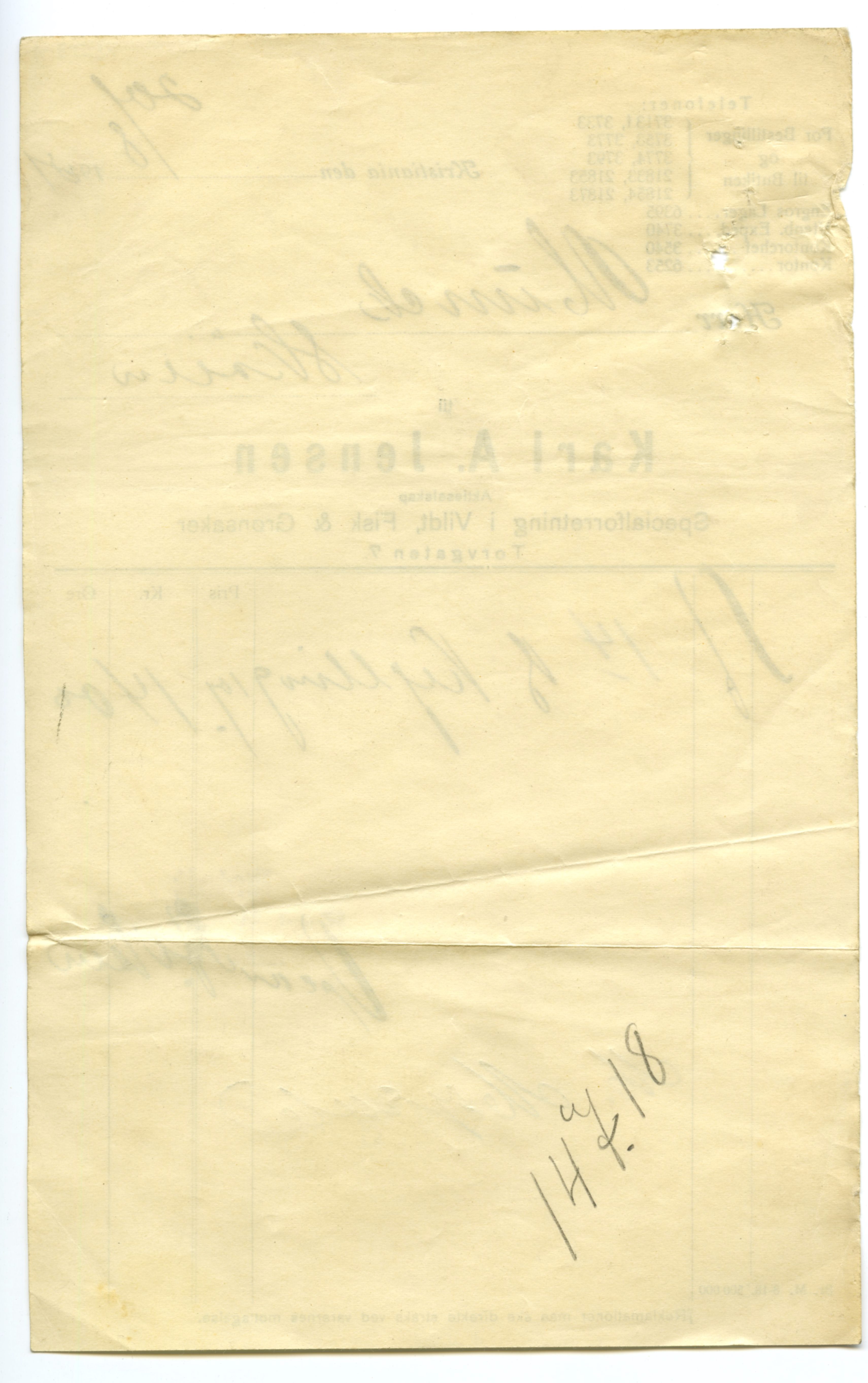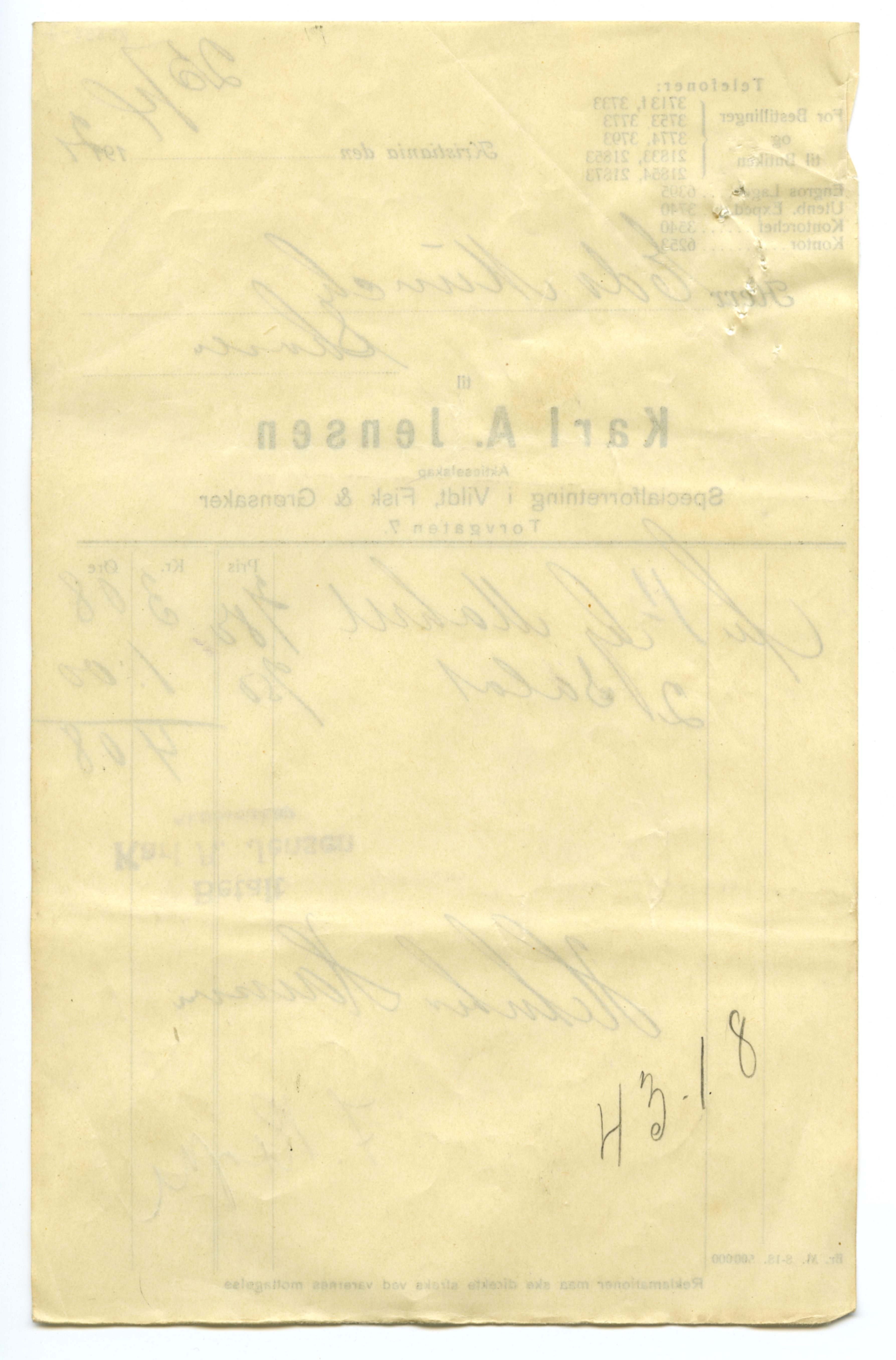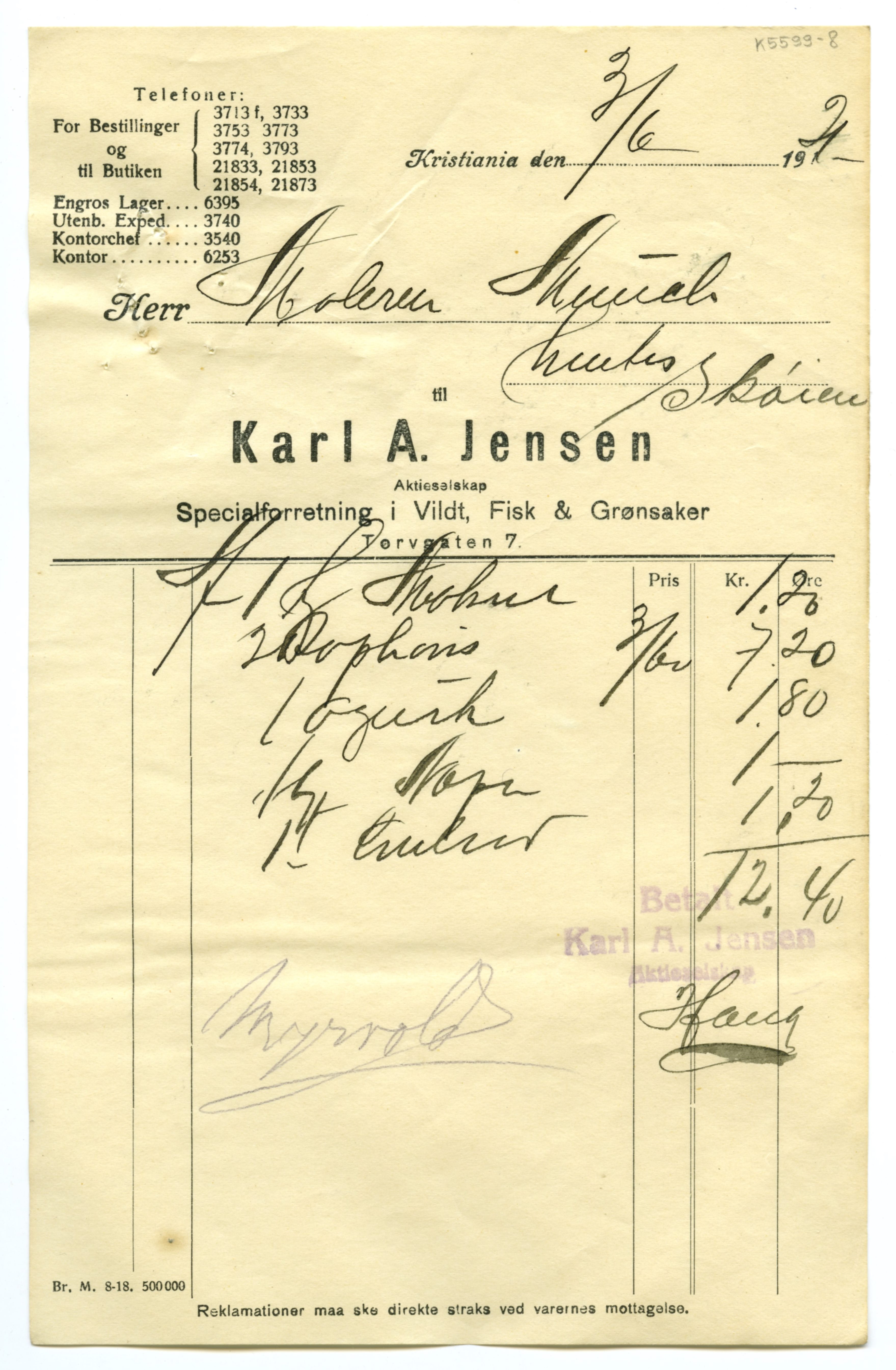 MM K 5599, Munchmuseet. Datert 20.08.1921. Brev fra Fisk & Grønsaker Karl A. Jensen Aktieselskap Specialforretning i Vildt.
