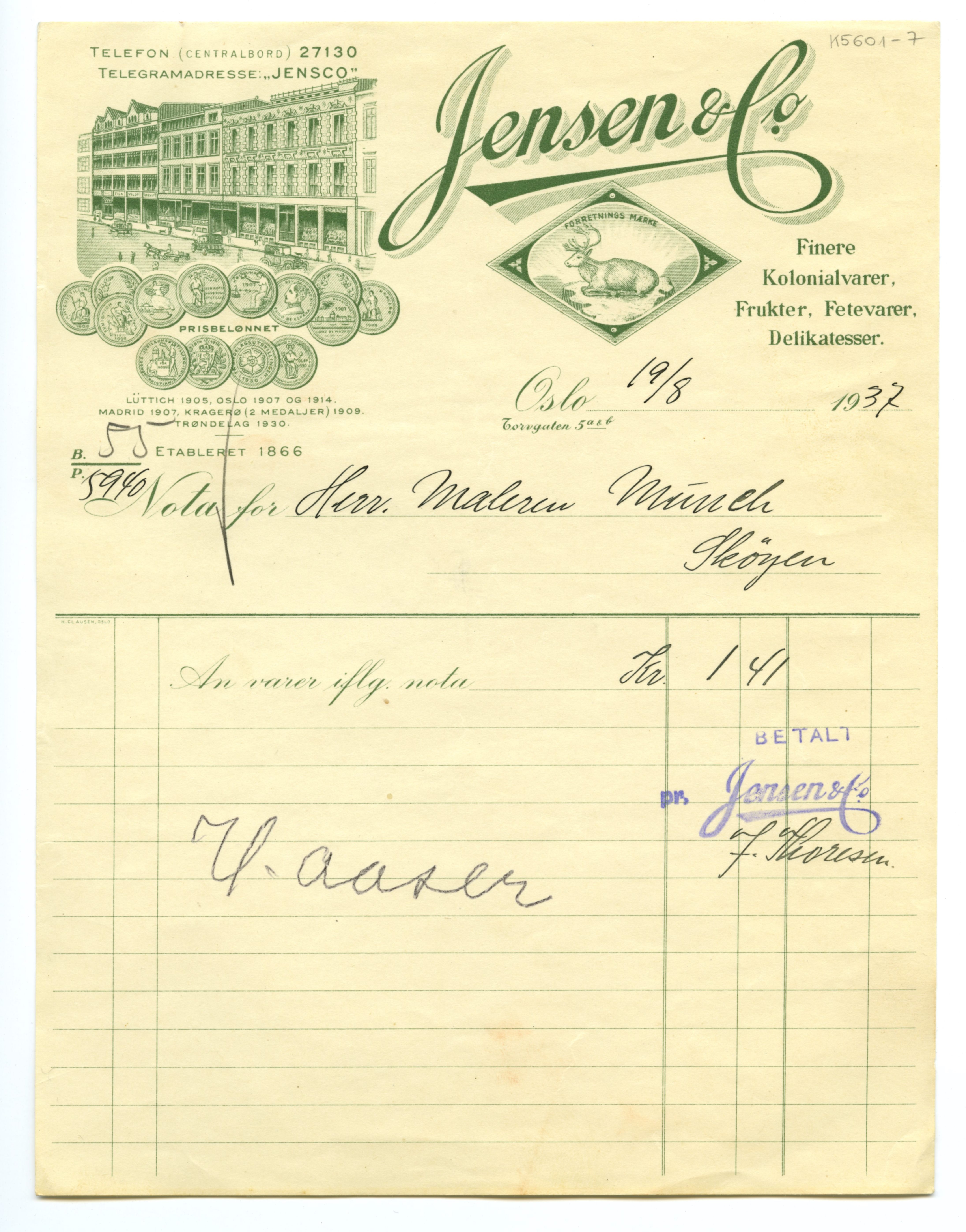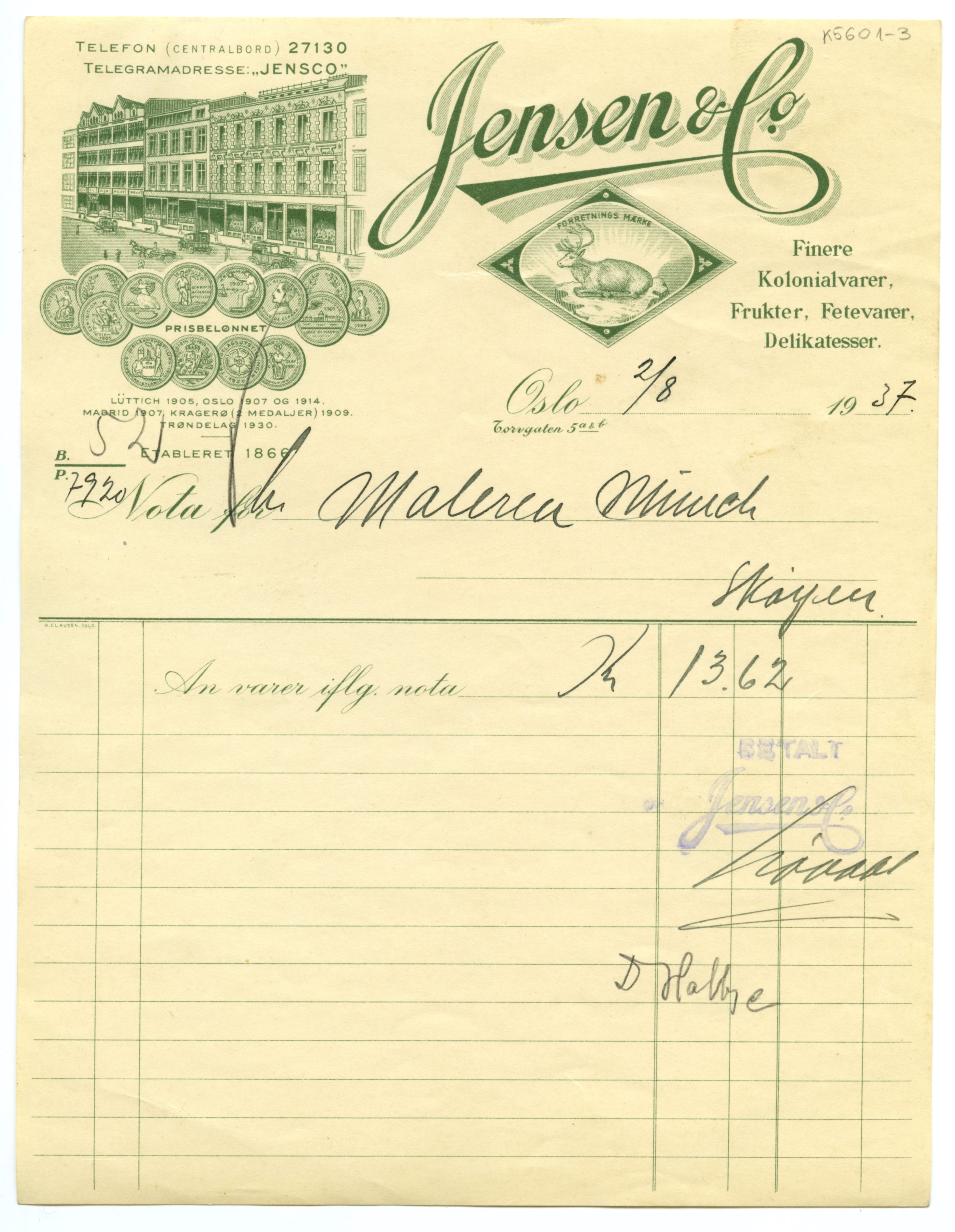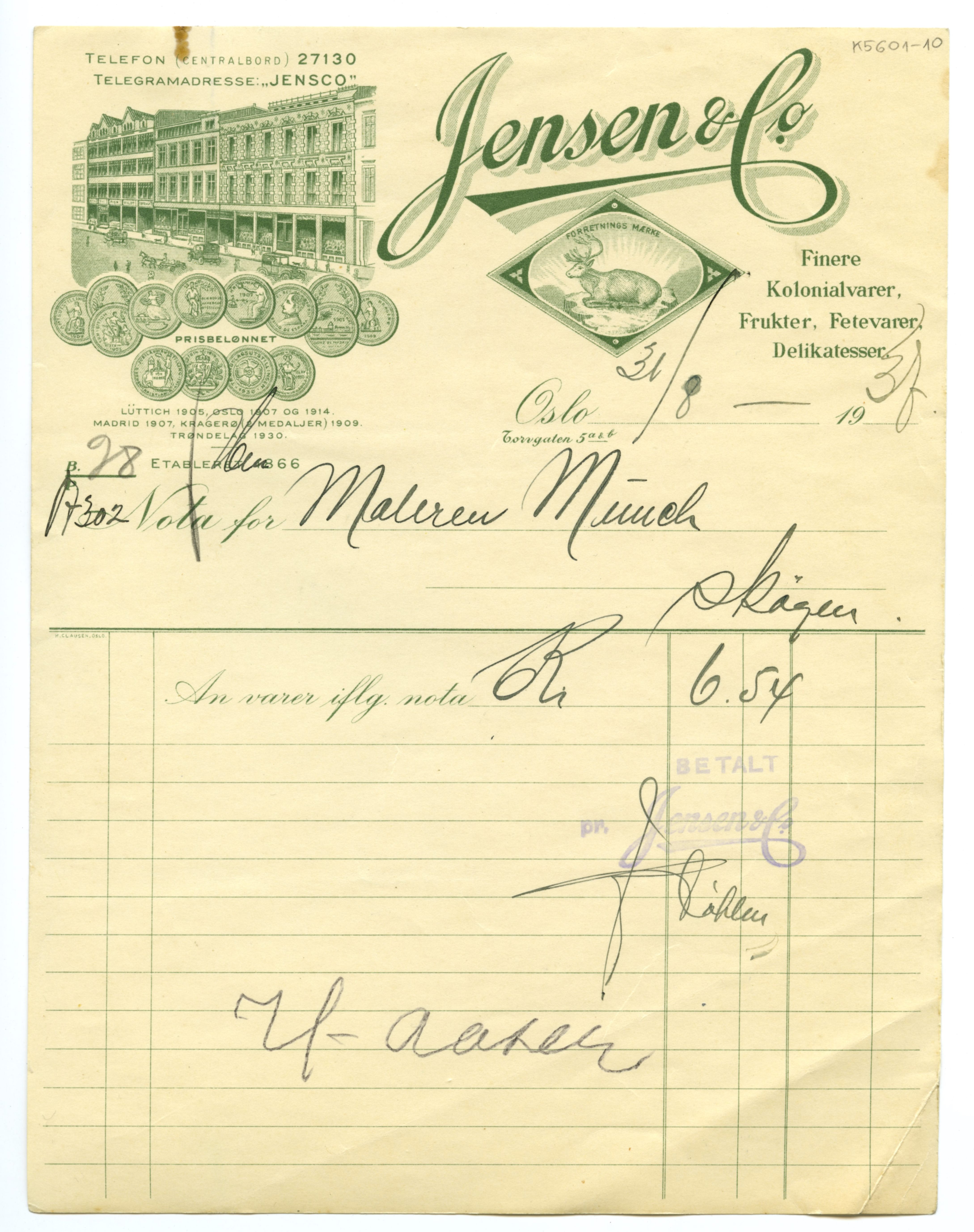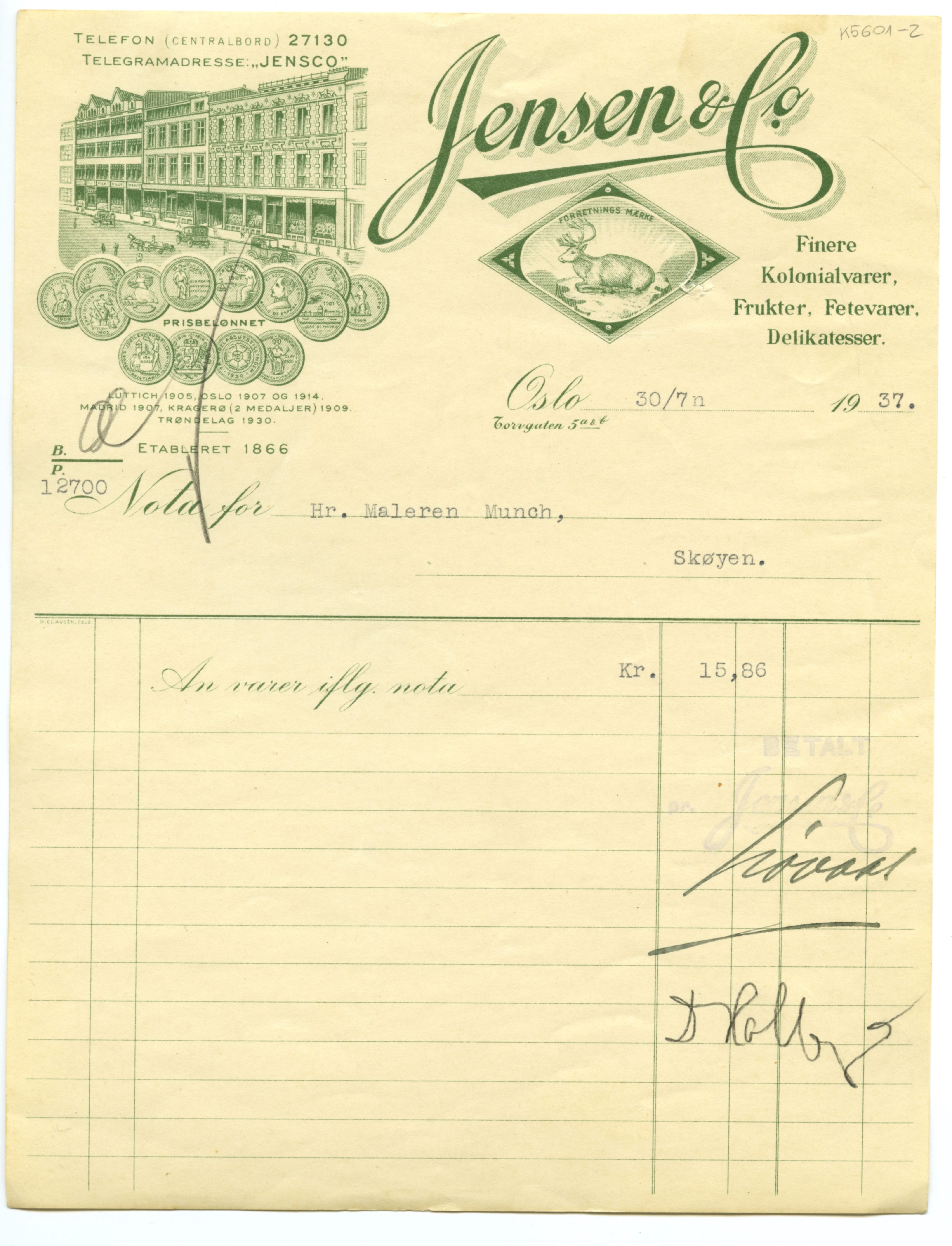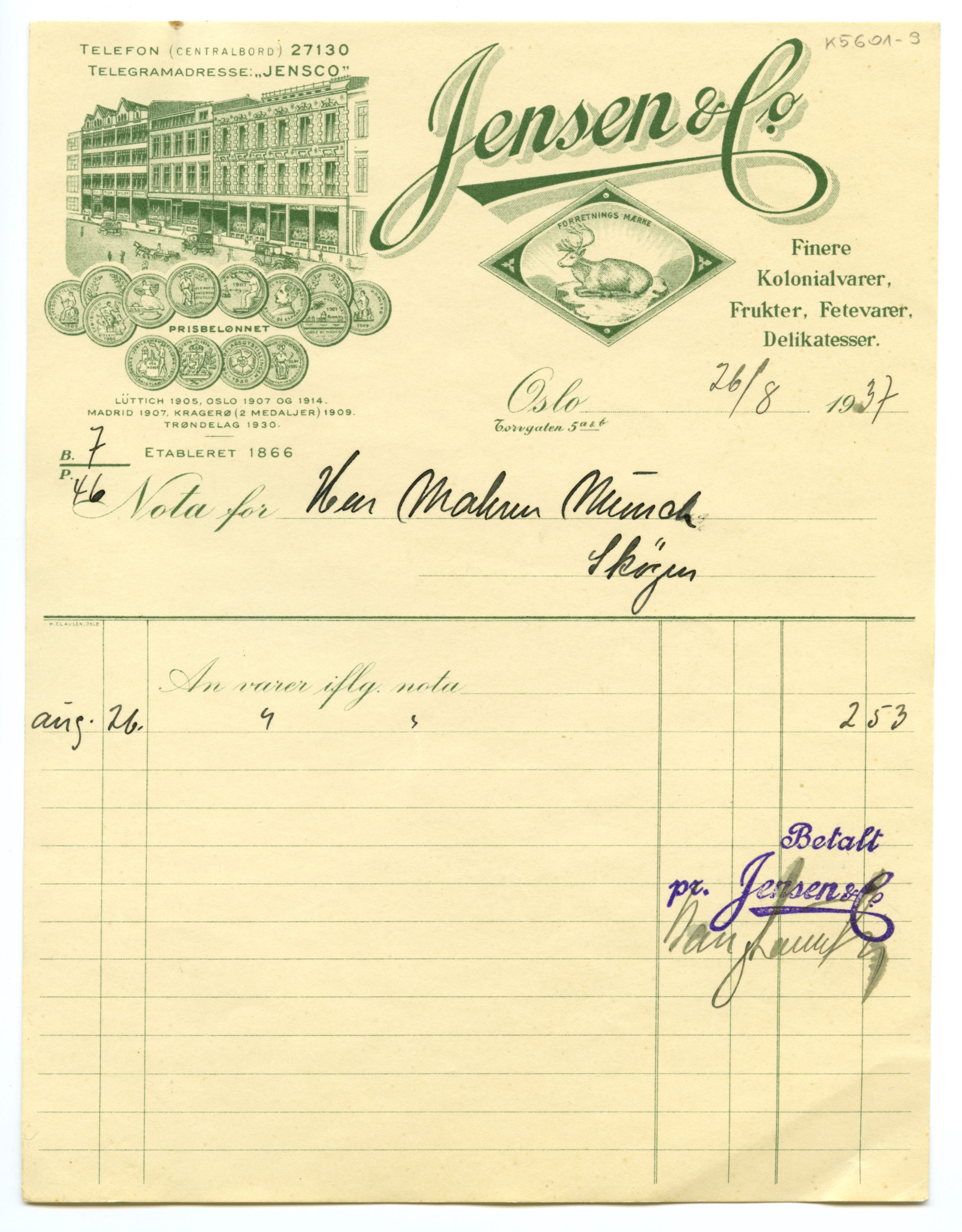 MM K 5601, Munchmuseet. Datert 27.07.1937. Brev fra konserves- & frugt Jensen & Co Fetevarer. Delikatesser.
