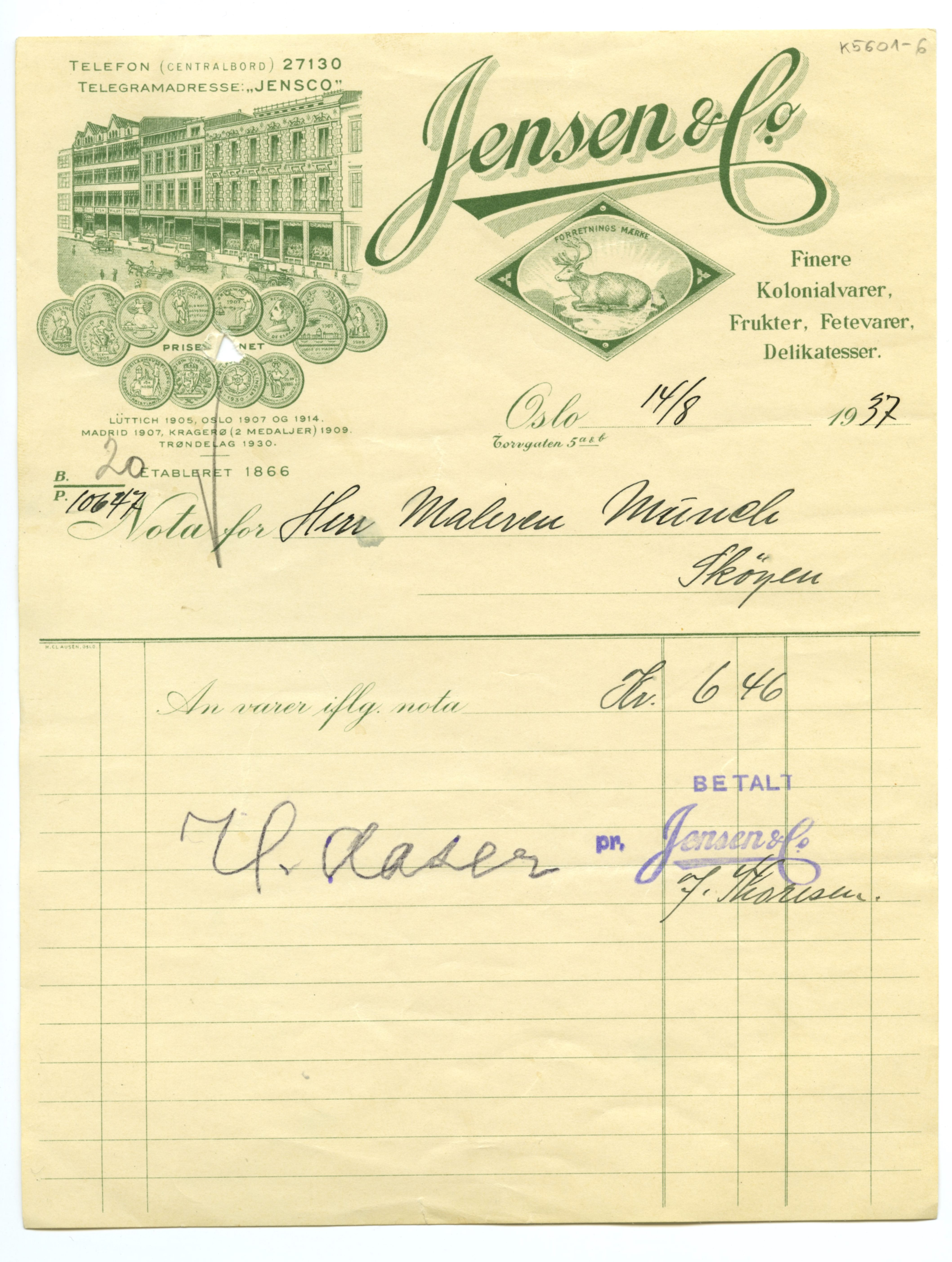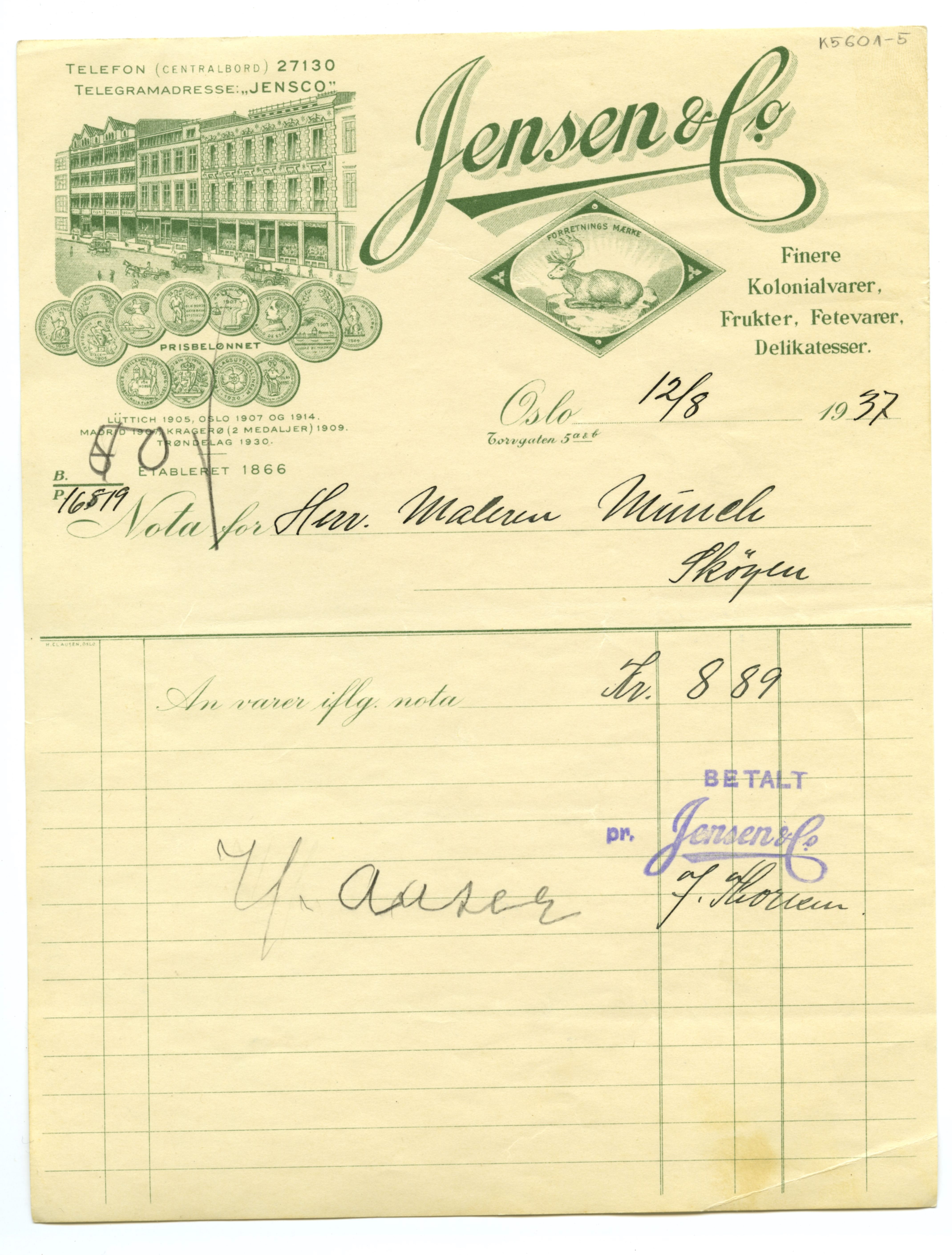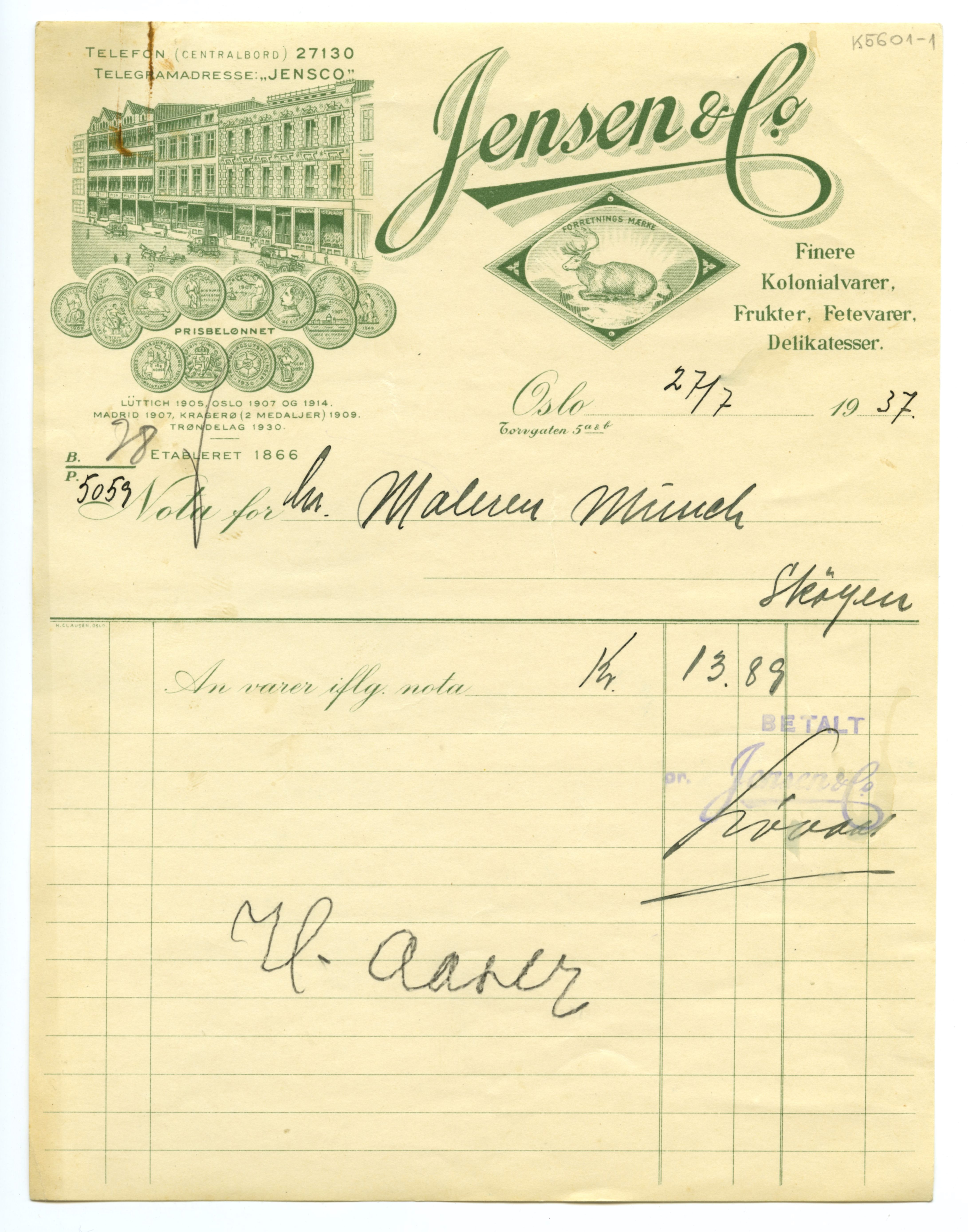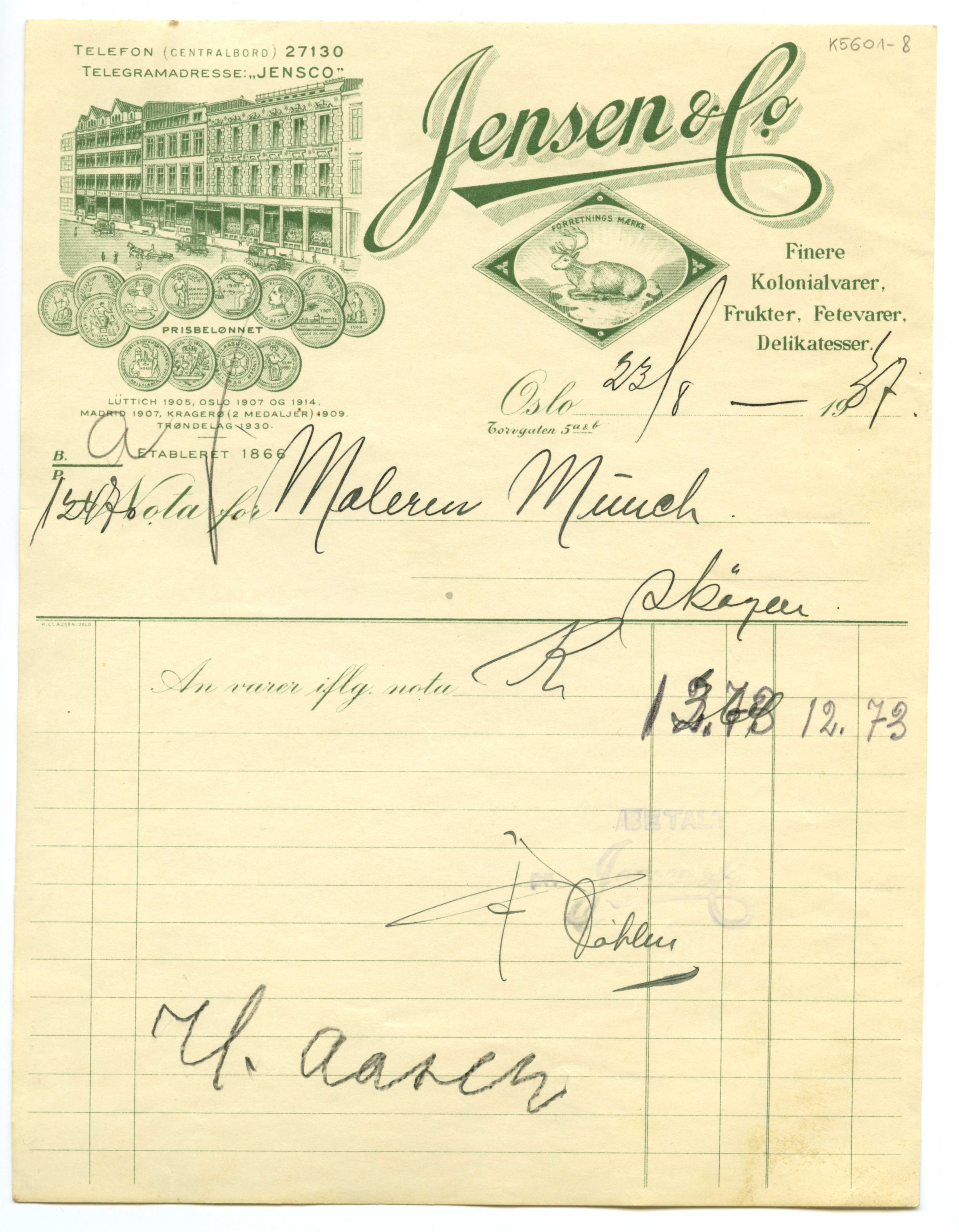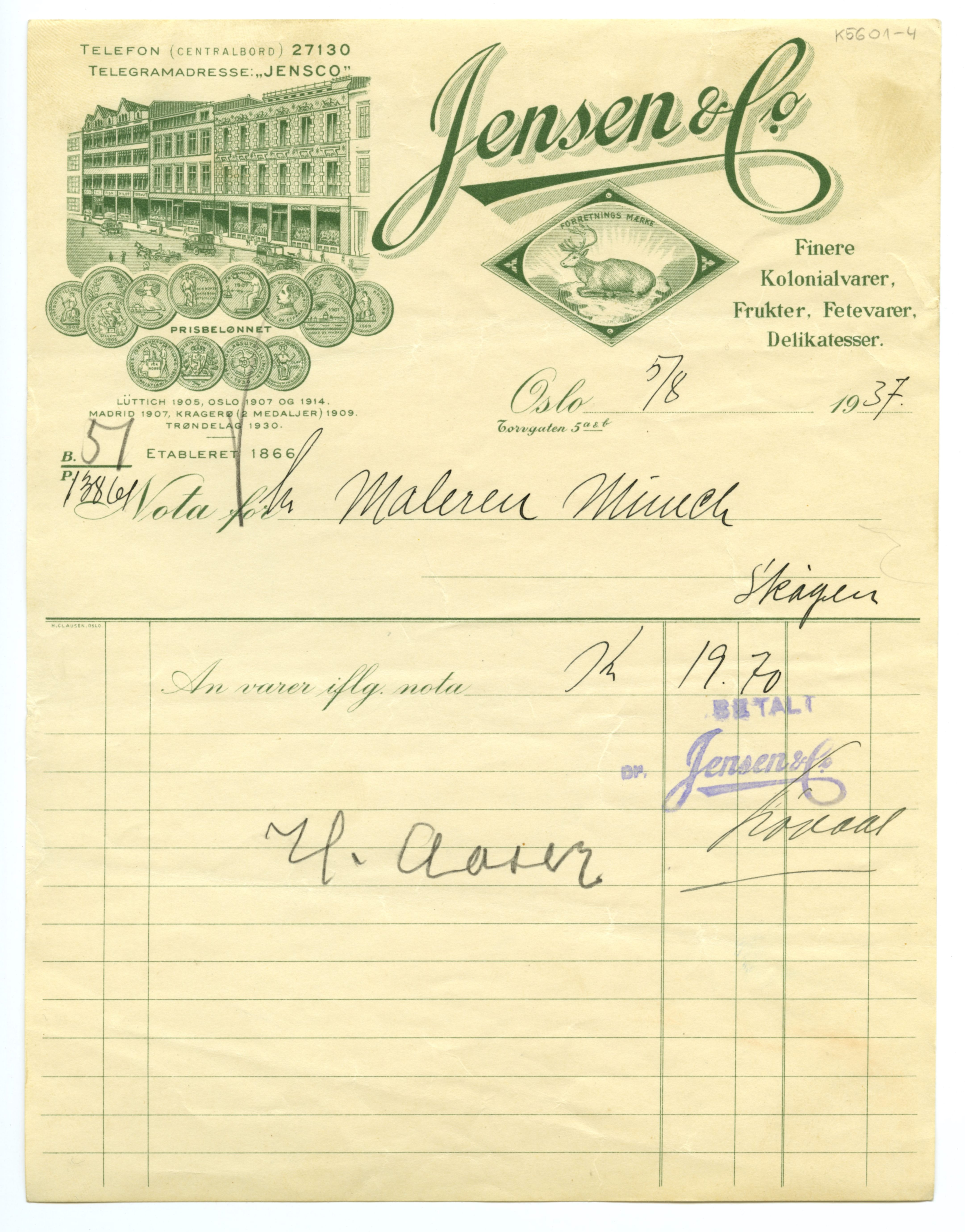 MM K 5601, Munchmuseet. Datert 27.07.1937. Brev fra konserves- & frugt Jensen & Co Fetevarer. Delikatesser.